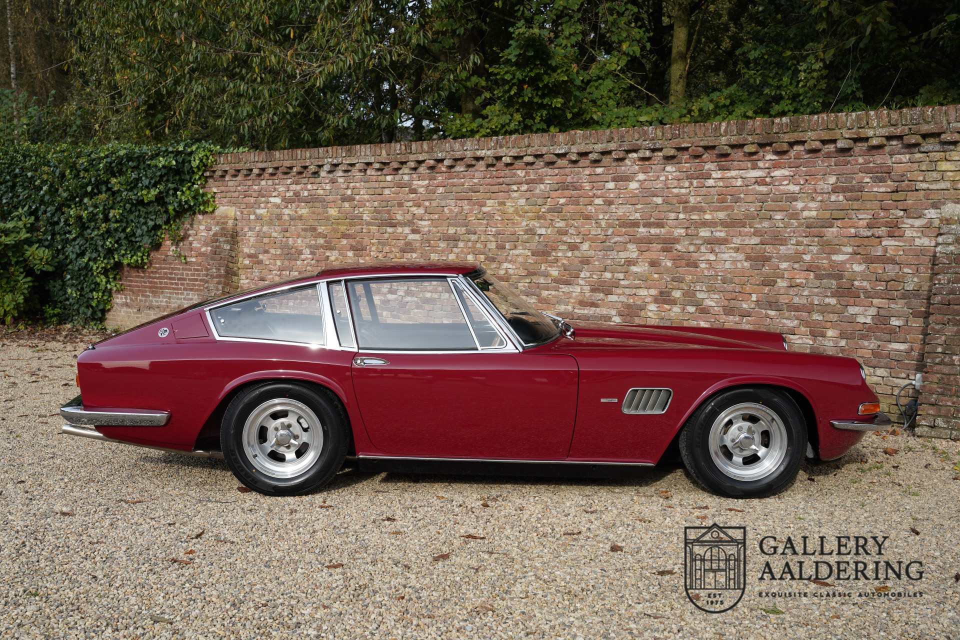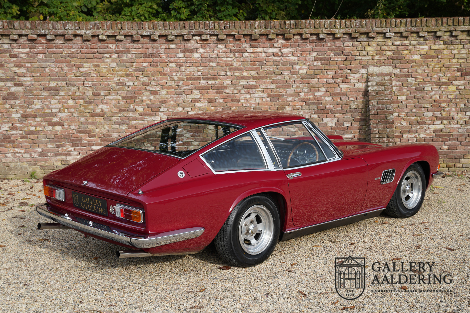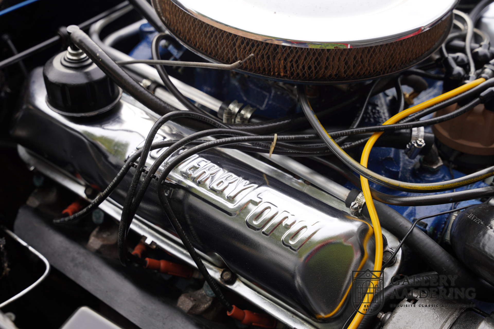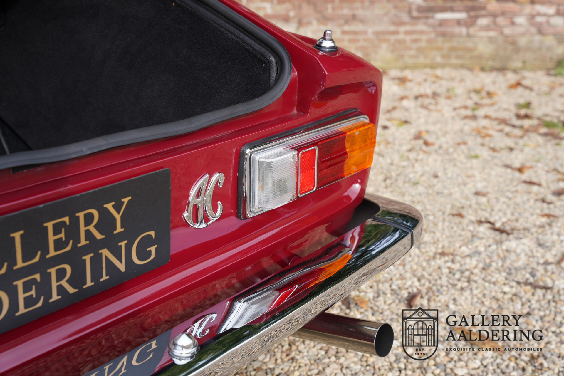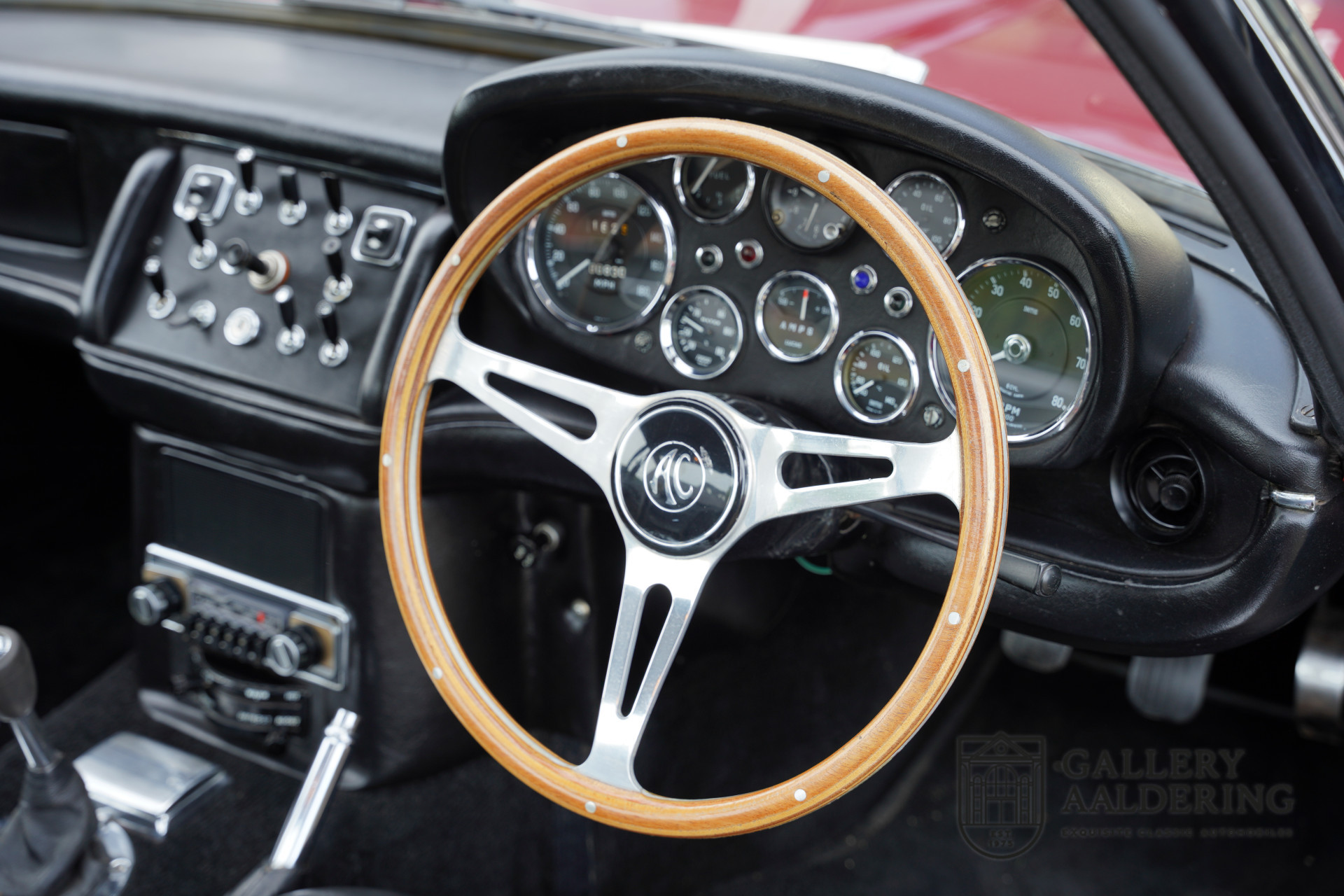 DIT VOERTUIG BEVINDT ZICH IN ONZE DEPENDANCE EN IS ENKEL – ALLEEN / UITSLUITEND OP AFSPRAAK TE BEZICHTIGEN. Het concept van de Italiaanse styling in combinatie met Amerikaanse V8-paardenkrachten was eind jaren zestig goed ingeburgerd en had ongetwijfeld invloed op de beslissing van AC Cars om zijn vuurspuwende Cobra-sportwagen opnieuw te configureren als een luxe Grande Routière. Een Cobra MkIII-chassis met spiraalophanging werd met 15 cm verlengd in de wielbasis en naar Italië gestuurd om door Pietro Frua te worden bekleed met een elegante stalen carrosserie. Het resultaat spreekt voor zich. De eerste auto, een tweezits cabriolet, werd op tijd voltooid voor de Earls Court Motor Show van 1965, terwijl op de Salon van Genève van het jaar daarop een nog sensationelere coupé in fastback-stijl werd gelanceerd. Hoewel de 428ci (7,0-liter) Ford Galaxy-motor minder vermogen produceerde dan die van de Cobra 427, was de 345 pk variant in staat alle prestaties te leveren die klanten wensten.