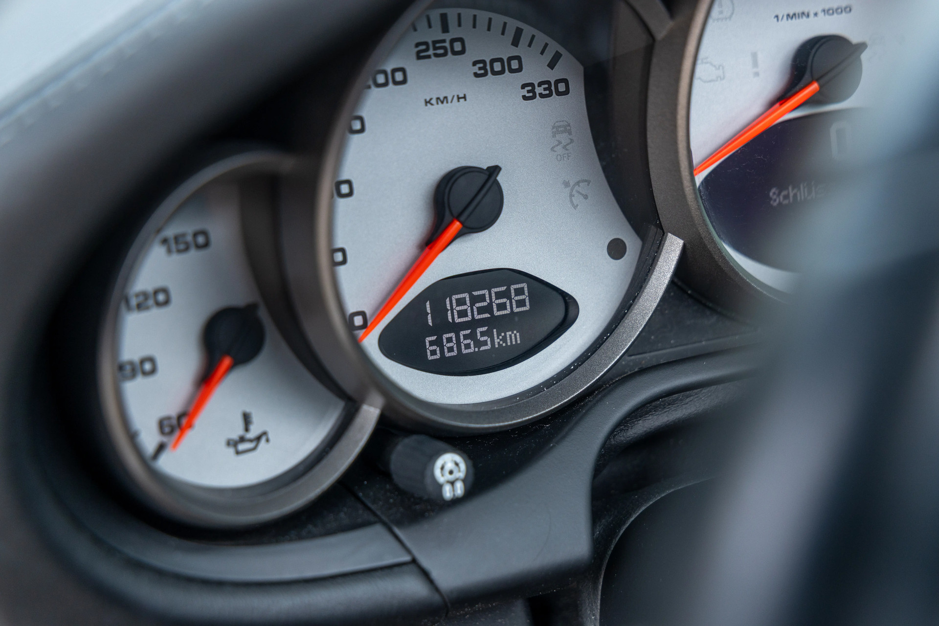 Ciò che colpisce immediatamente è l'ottimo stato di conservazione di questa Porsche. La verniciatura presenta una lucentezza profonda e intensa, gli interni sono curati nei minimi dettagli e tutto trasmette una sensazione di solidità. Guidare questo esemplare è un vero piacere. Il motore gira in modo fluido, il cambio automatico innesta le marce correttamente e l'impressione generale è molto rassicurante, esattamente quella che ci si aspetterebbe. Questa impressione è ulteriormente confermata dalla cronologia degli interventi di manutenzione, tutti eseguiti direttamente da Porsche, a partire dalla consegna presso il Porsche Zentrum Düsseldorf.