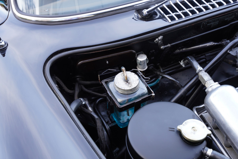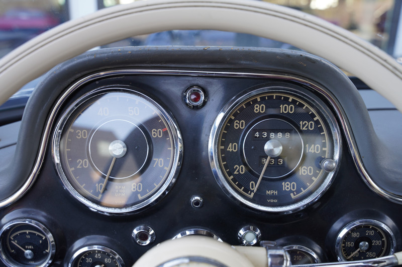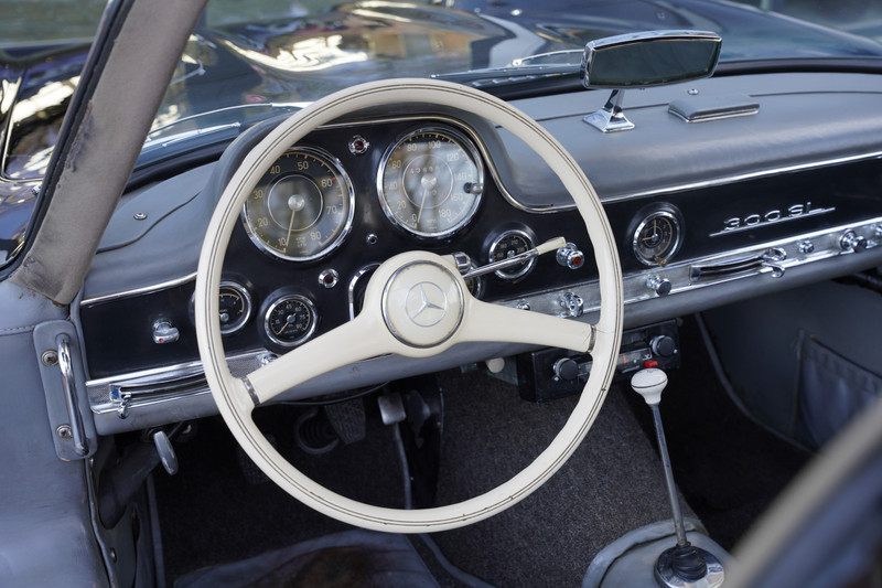 This 1955 300 SL Gullwing has been in the possession of the same owner from 1974 until 2020 and still preserves 95% of its original paint. It is one of only two ever painted by the factory in Dunkelgrau (DB164). The Rudge knock-off wheels were added in the 1970s using factory parts (date-coded). During that time, the aftermarket Rudge wheel industry had not yet emerged.