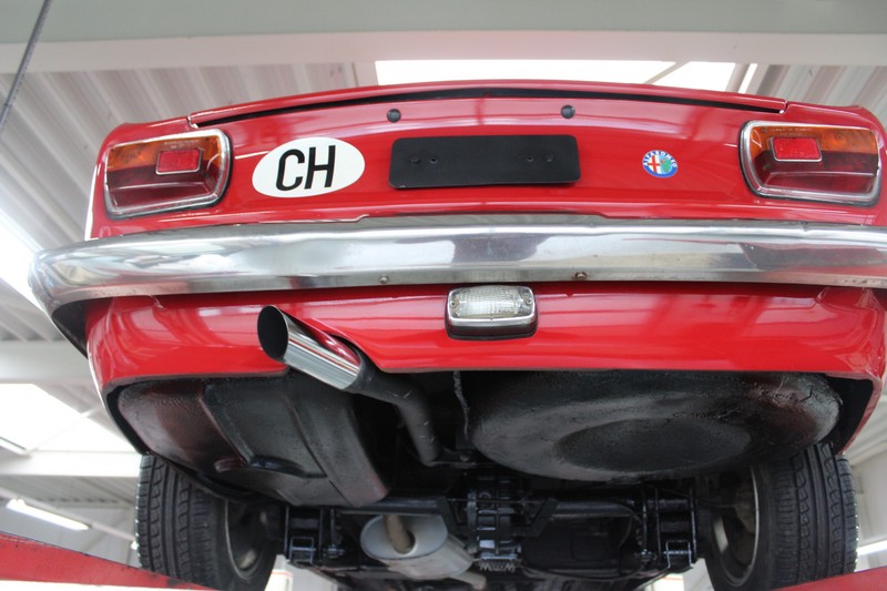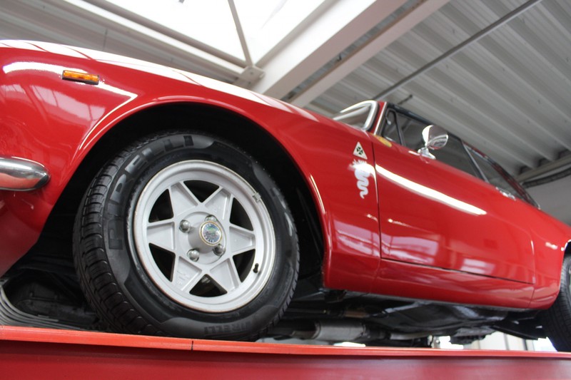 Die Karosserie befindet sich in sehr gutem Zustand, sie hat gute Passungen und originales und dünnes Blech. Die Zierleisten sind sehr schön und in gutem Zustand. Das Auto wurde in seiner damaligen Originalfarbe hochwertig neu lackiert. Seitdem wird das Auto rein hobbymäßig genutzt und zwischendurch in einer beheizten Garage abgestellt, der Junior sieht daher immer noch sehr schön aus. Der Alfa Romeo GT 1300 Junior steht auf Original Alfa Romeo Rädern, bestückt mit guten Reifen in den richtigen Größen.