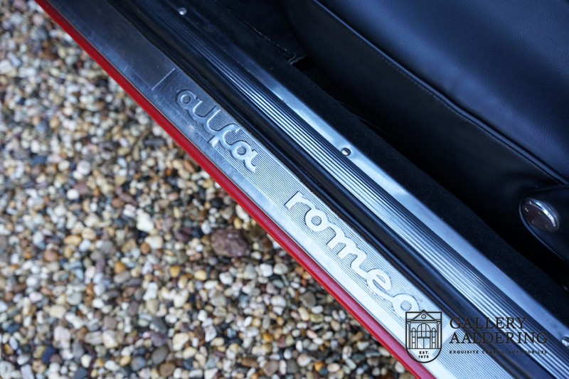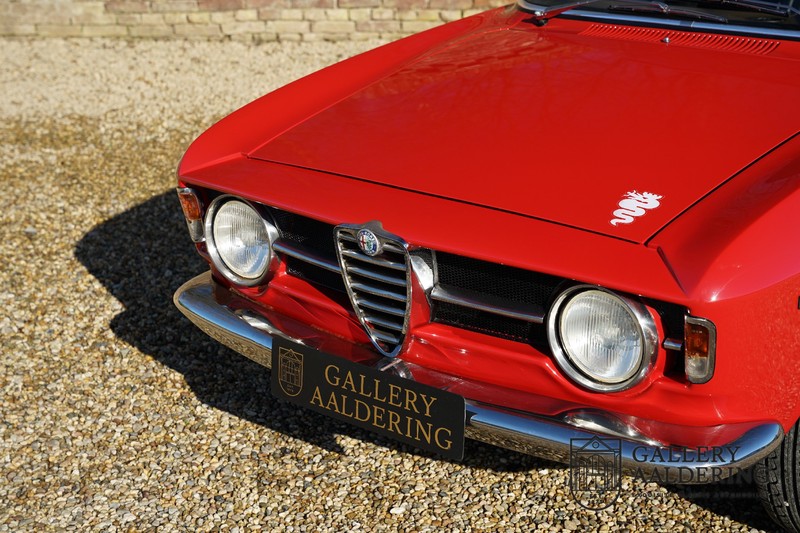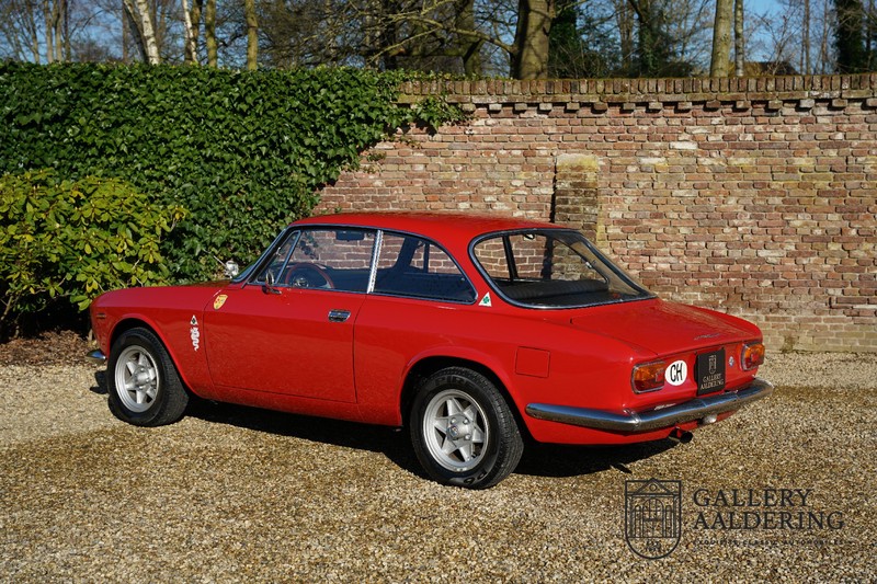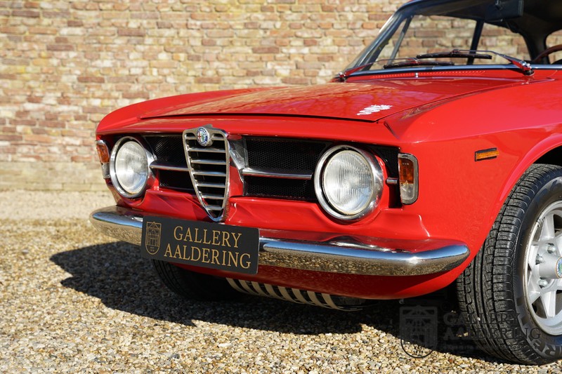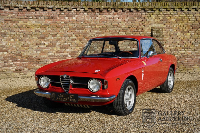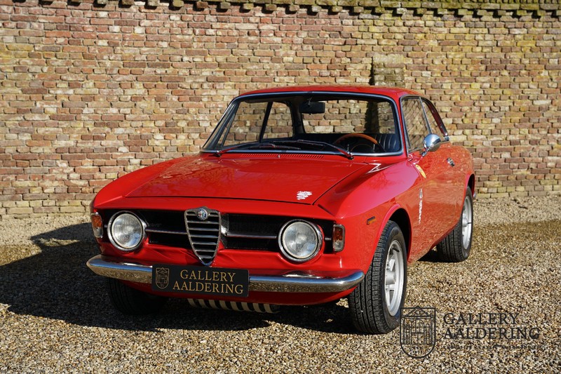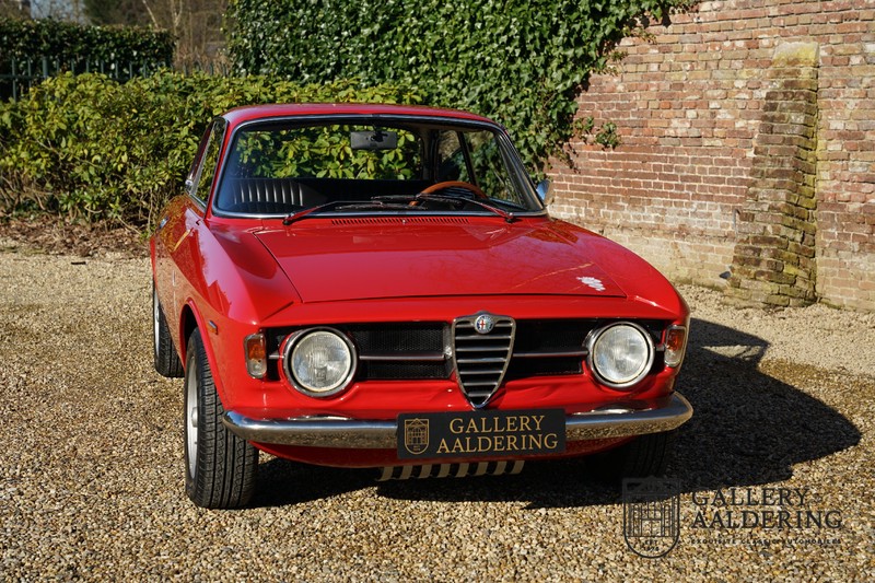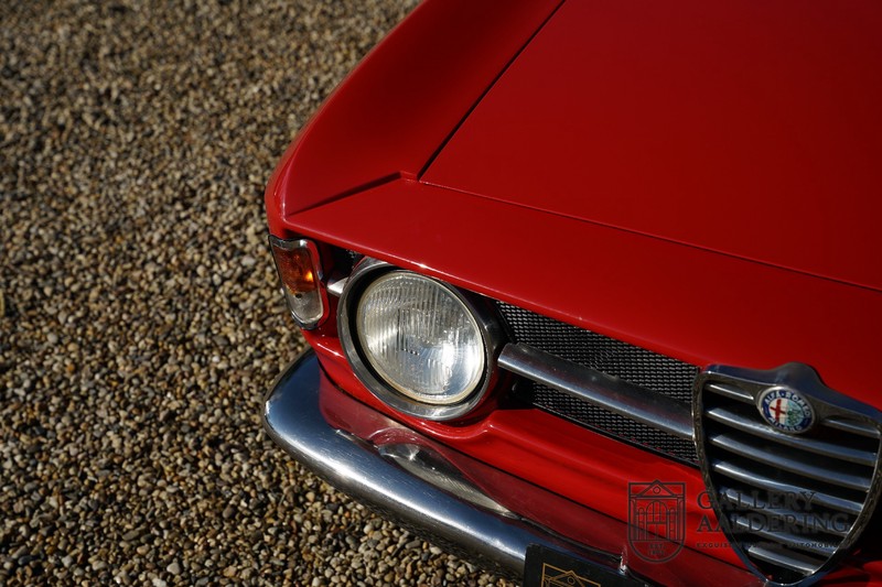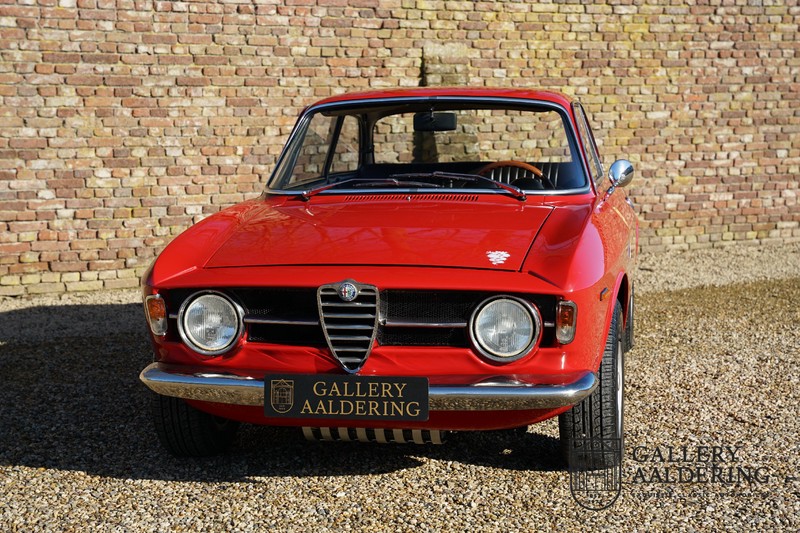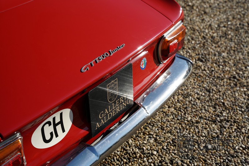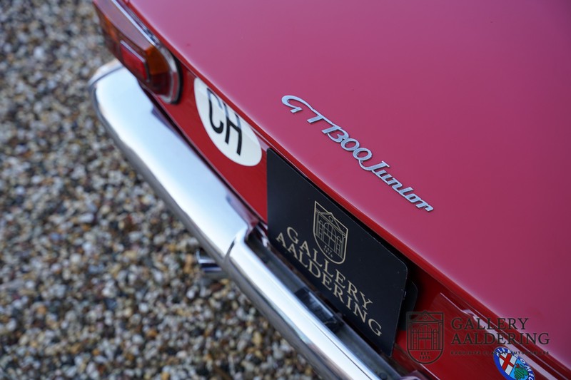Deze Alfa Romeo 1300 GT Junior is nieuw geleverd in 1970 aan zijn eerste eigenaar. De beste man, geboren in 1933, wist een prachtige Alfa Romeo 1300 GT Junior te vinden. De auto is tot voor kort in Zwitserland gebleven en is al eens volledig gerestaureerd en gereviseerd. De 1300 GT Junior was de instapversie van de 105-serie. Dat maakt de kleine Alfa wellicht tot de leukste instapper in de automobiele geschiedenis. De 1300 GT Junior had een relatief bescheiden vermogen van slechts 90 pk, dat werd deels gecompenseerd door een kortere eindoverbrenging in de transmissie. De topsnelheid lag daarom nog altijd op een indrukwekkende 160 kilometer per uur. De aandrijving gaat vanzelfsprekend naar de achterwielen en ook de motor is natuurlijk zo’n overheerlijke Alfa Romeo Twin Cam.