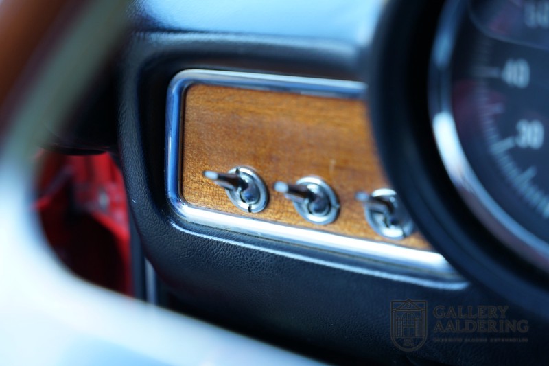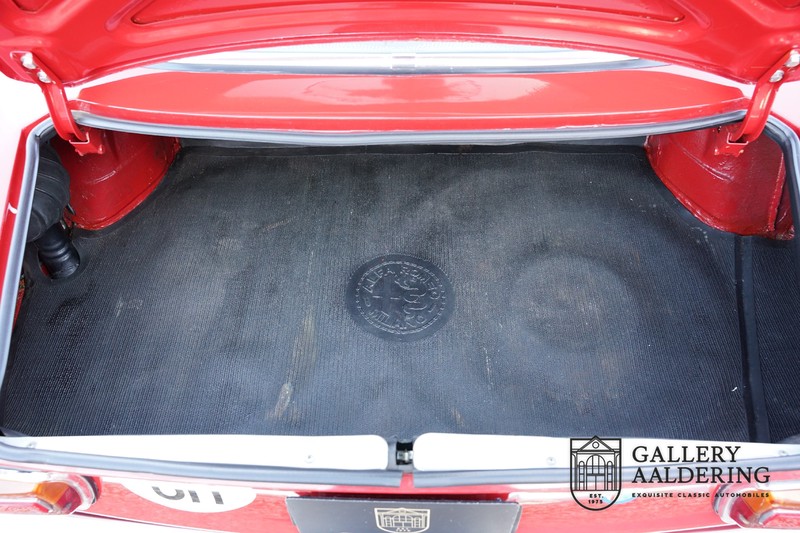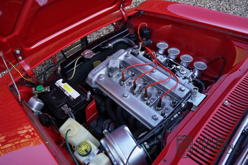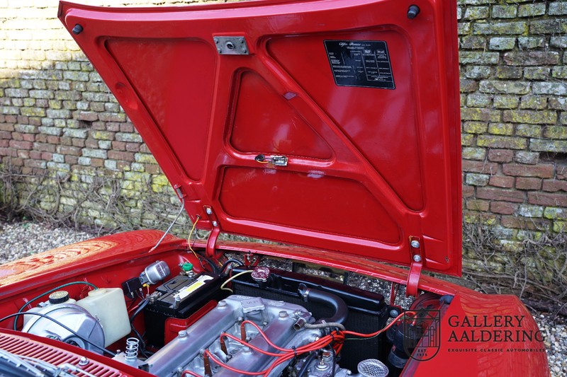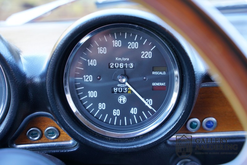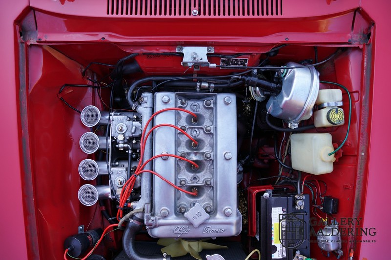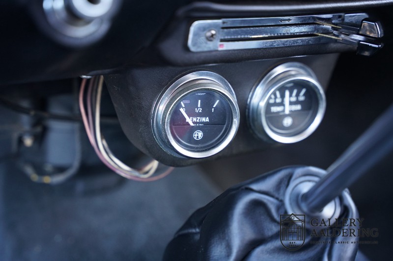 Die Technik wurde bereits komplett revidiert, der Motor läuft wunderbar und klingt besonders gut, weil die doppelten Weber-Vergaser durch die offenen Luftfilter atmen. Es ist eine wahre Freude, einen Alfa Romeo Twin Cam 1300 zu fahren und die ganze Kraft des 1300er-Motors zu nutzen. Das Getriebe ist natürlich das präzise schaltende 5-Gang Schaltgetriebe. Fahrwerk und Bremsen befinden sich ebenfalls in einem sehr guten Zustand und funktionieren selbstverständlich einwandfrei.