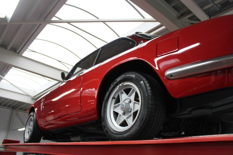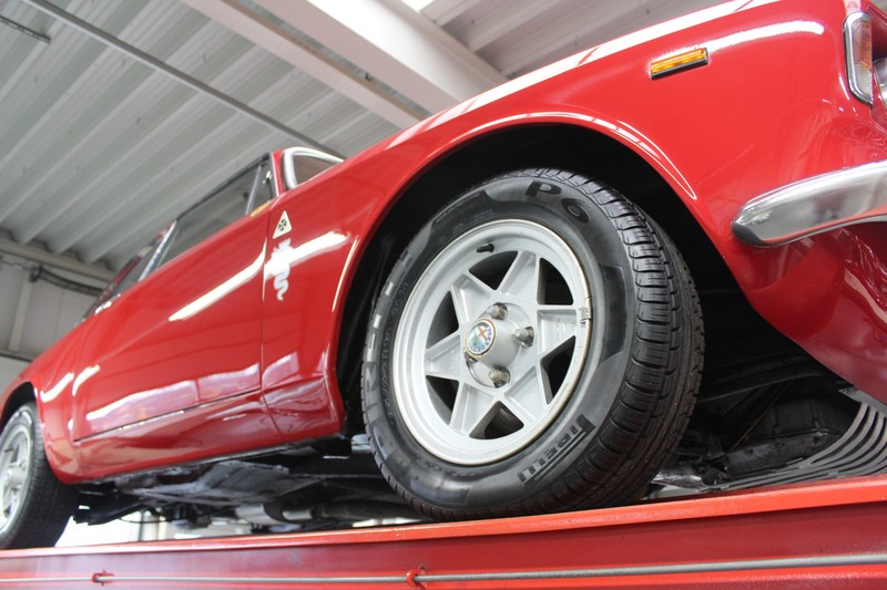 The bodywork is in excellent shape. The shut lines are great. The panelwork is nice and thin. All of the good quality bright work looks splendid. The car received an excellent respray keeping to the original colour scheme. Since all that work the car has been used sparingly and kept in a heated garage. This Alfa Romeo 1300 GT Junior has retained its original rims shod in good quality and correctly sized rubber.