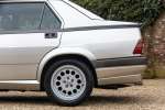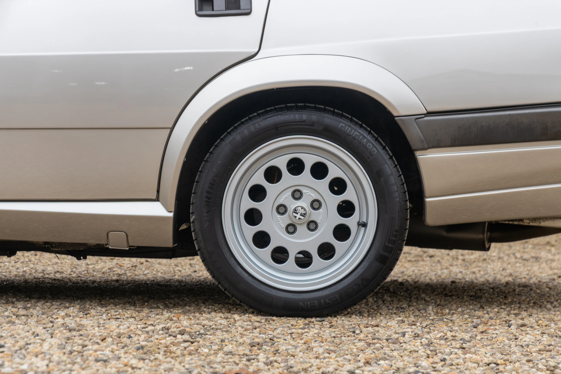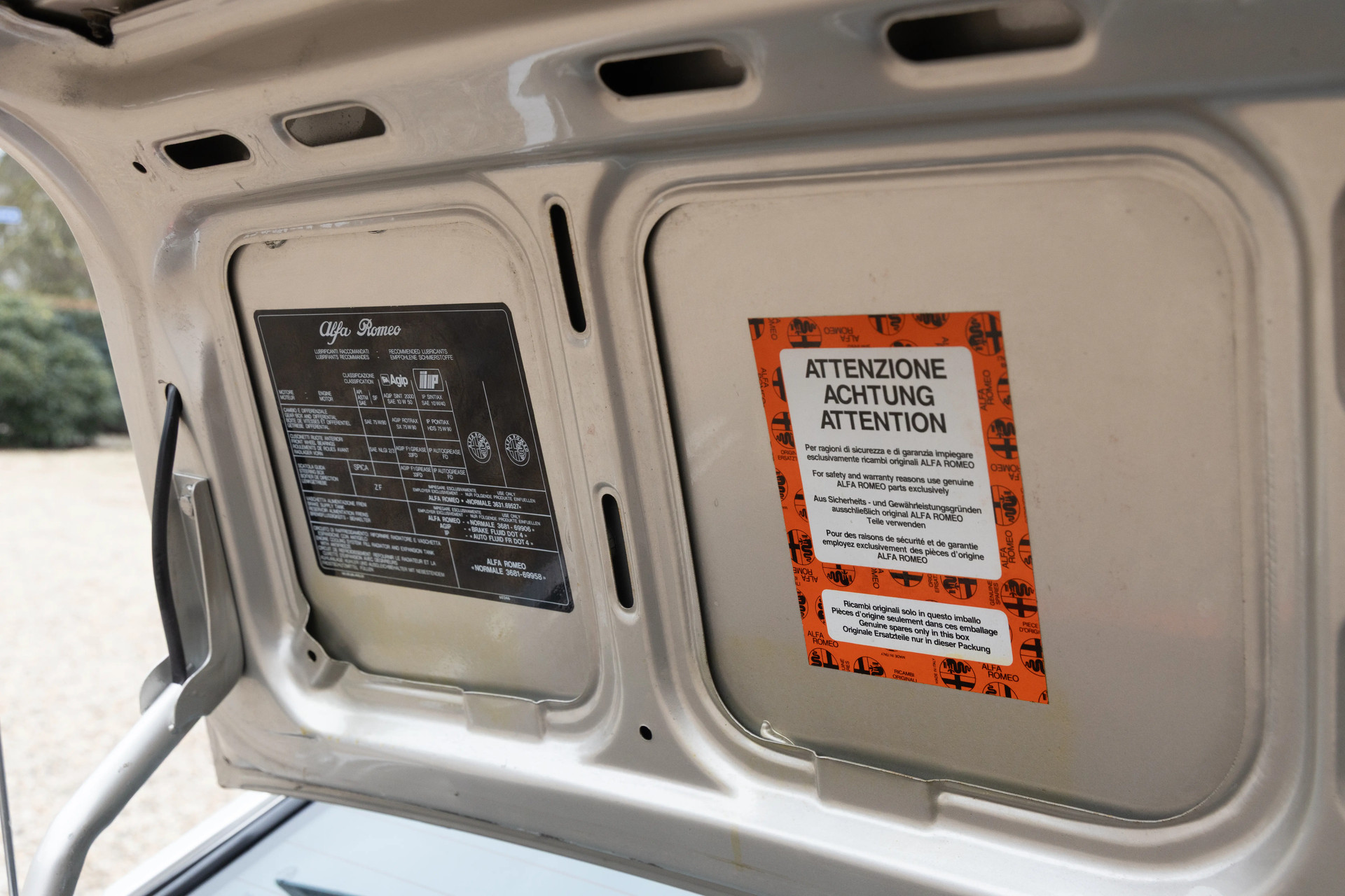 De vormgeving kwam van Ermanno Cressoni, hoofd van Centro Stile Alfa Romeo. Strak, hoekig, bijna eigenwijs. Die fraaie voorkant, de vierkante koplampen, de korte overhangen. Het is geen auto die probeert mooi gevonden te worden, maar eentje die volop karakter van zichzelf heeft. En dat maakt hem juist aantrekkelijk. Zeker in Bianco Argento, met het grijze velours interieur. Typisch jaren tachtig, en vandaag de dag precies weer goed.