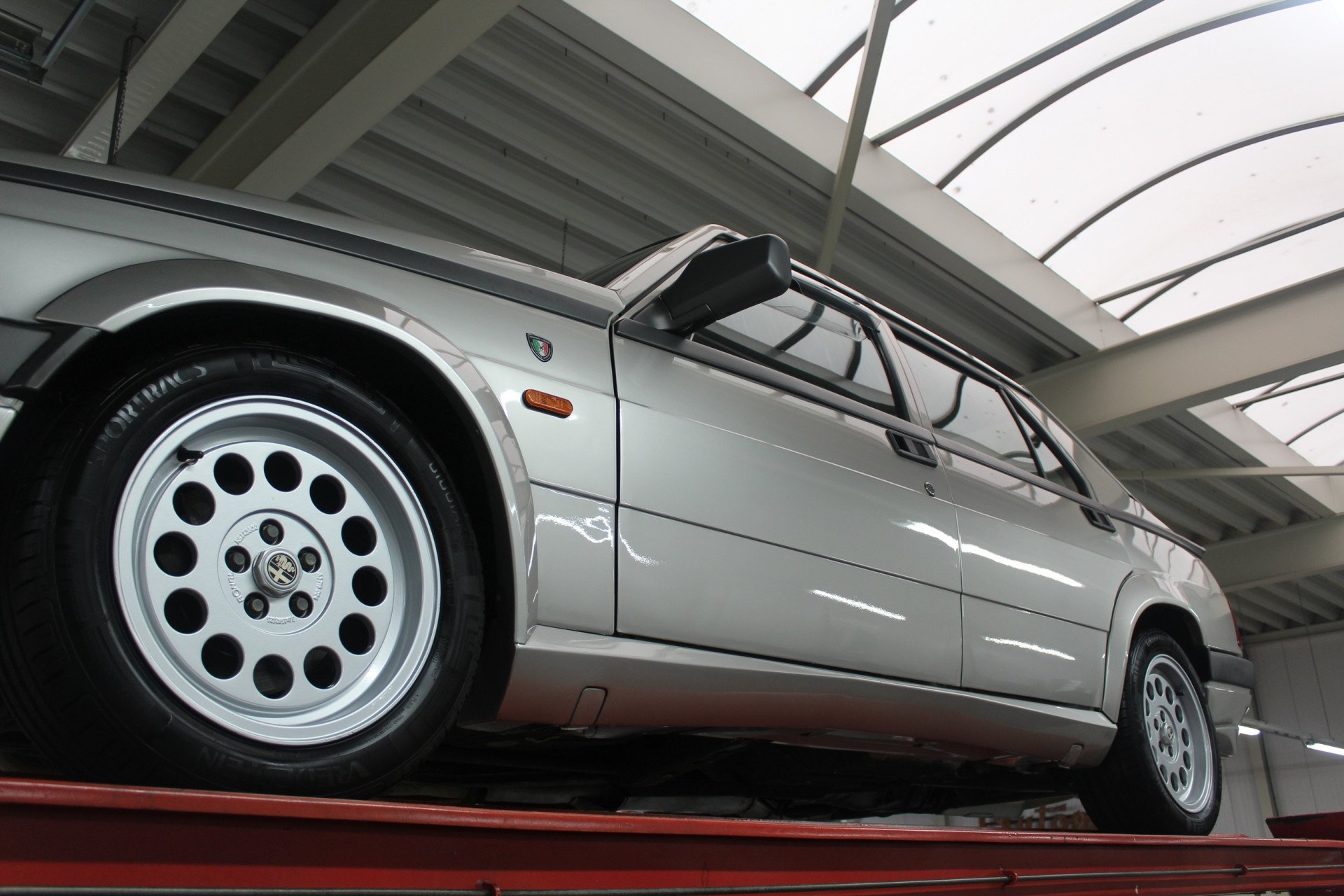 Das Design stammt von Ermanno Cressoni, dem damaligen Leiter des Centro Stile Alfa Romeo. Klar, kantig, fast schon eigensinnig. Die markante Front, die eckigen Scheinwerfer, die kurzen Überhänge – dies ist kein Auto, das gefallen will. Es besitzt Charakter aus sich selbst heraus. Und genau das macht es so attraktiv. Besonders in Bianco Argento mit grauem Veloursinterieur. Typisch Achtzigerjahre – und heute wieder genau richtig.