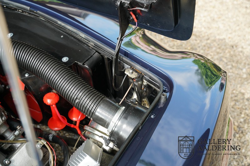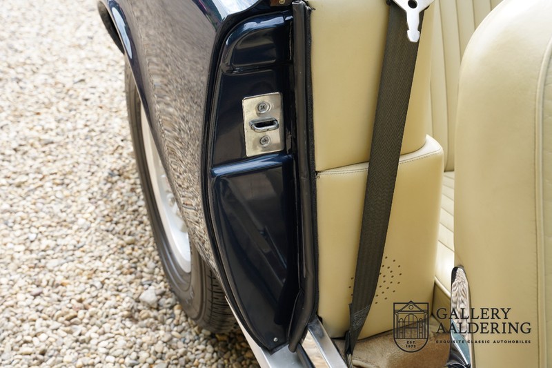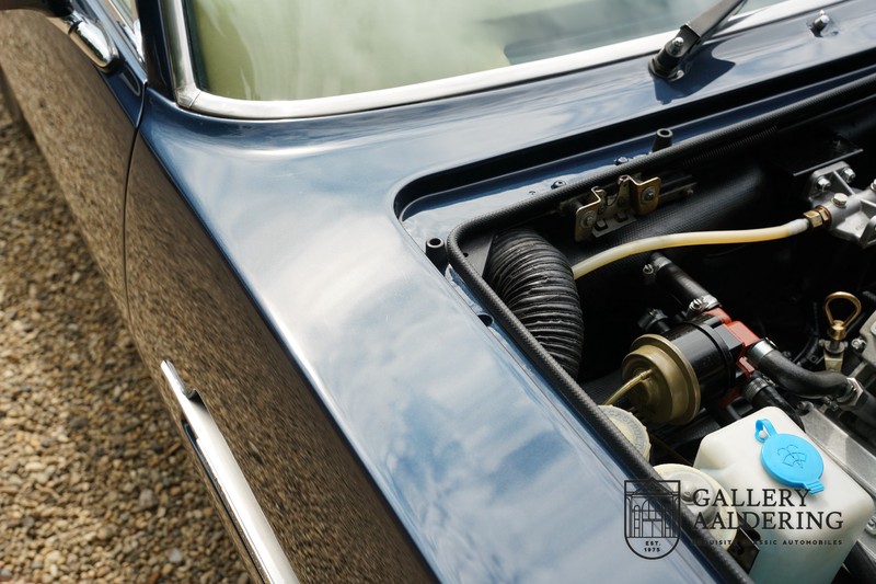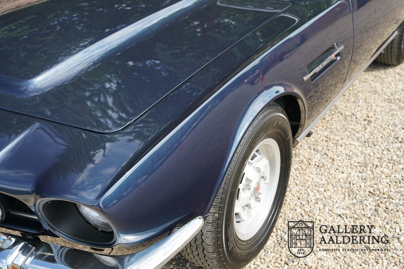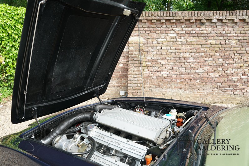 In 2019 the well-known Aston Martin specialist firm of Chris Shenton Engineering took this Volante under its wings. A number of minor ailments were attended to, like the poorly working hood mechanism, lighting problems as well as bigger items such as overhauling and re-calibrating the Weber carburettors, refurbishing the wheels, fitting of new fuel lines, removing the fuel tank, cleaning and re-installed it. To top it all the Volante was taken back to bare metal and given its current beautiful blue finish. Before being resprayed the US lights were removed, the bodywork straightened out and the engine bay detailed. A new cooling system and a new battery were installed, the air-con re-pressurised as well as attending to a host of other minor issues. In short after spending over