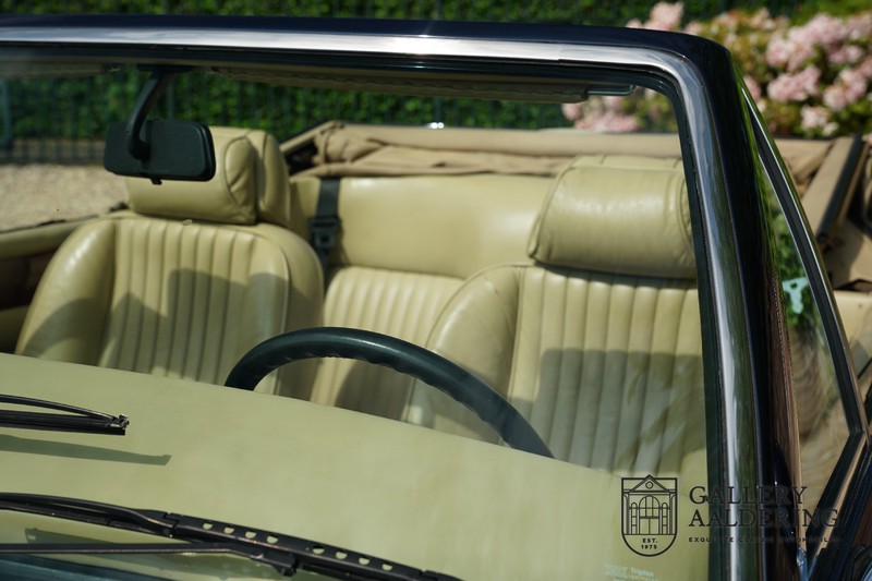 Das Interieur ist genauso schön wie das Exterieur des Autos. Der Erstbesitzer hat seinen Aston Martin bestellt mit einer geschmackvollen Farbkombination, die Oberseite vom Armaturenbrett ist beige und auch die Teppiche, das Leder und das Verdeck sind beige. Das Interieur ist ein Augenschmaus und noch vollkommen original. Das Verdeck ist elektrisch bedienbar und schließt überall perfekt. Dank der geringen Laufleistung und guter Pflege hat das Leder eine fantastisch Patina entwickelt, einfach wunderschön. Alle Instrumente und Bedienelemente funktionieren selbstverständlich einwandfrei.