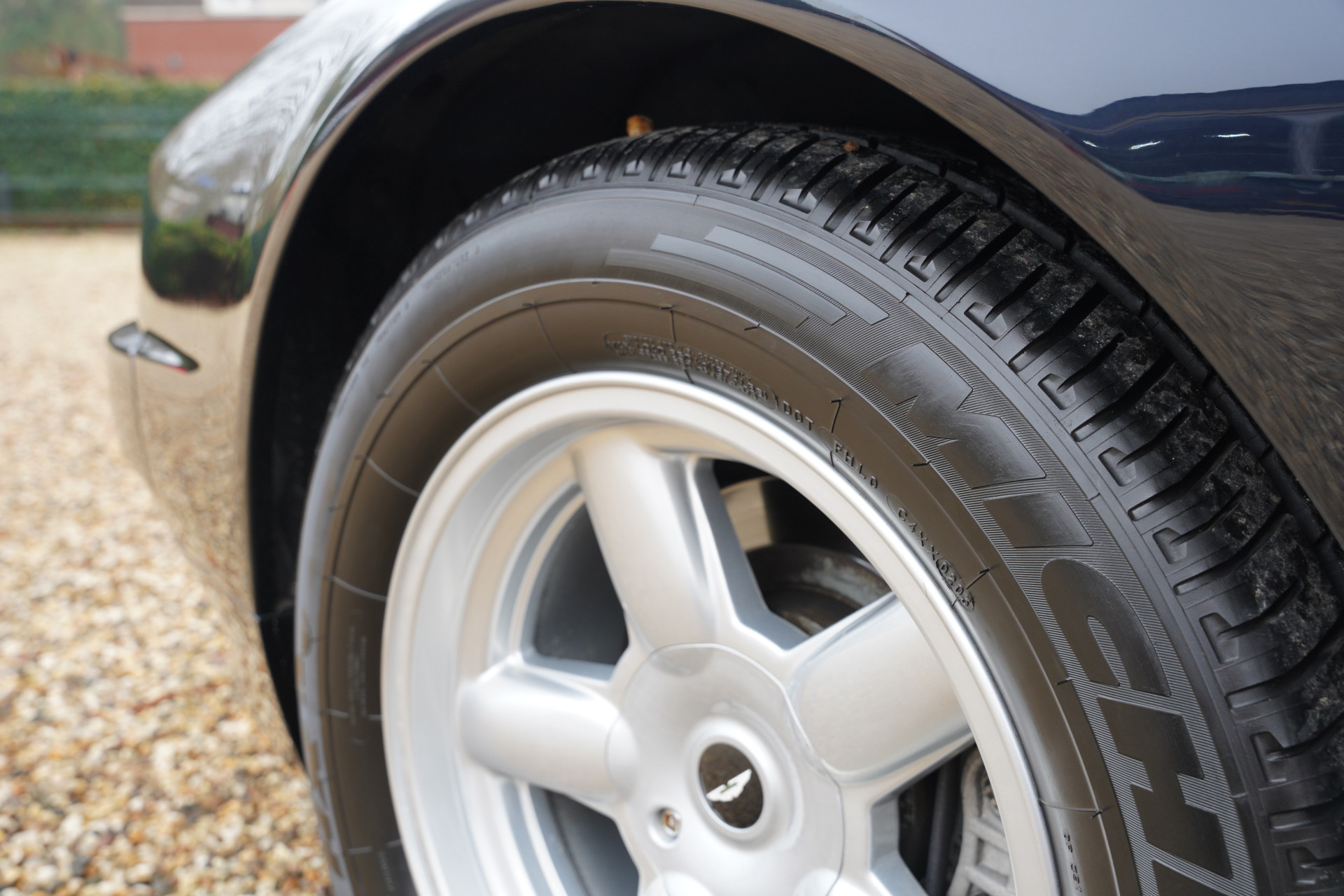 De Virage die u hier ziet stamt uit 1994, een zeer laat exemplaar dus en dat betekent ook direct dat de Porsche Nachtblau cabriolet is voorzien van de moderne viertraps automaat met sportstand in plaats van de tamelijk ouderwetse drietraps automaat tot 1993 werd geleverd.