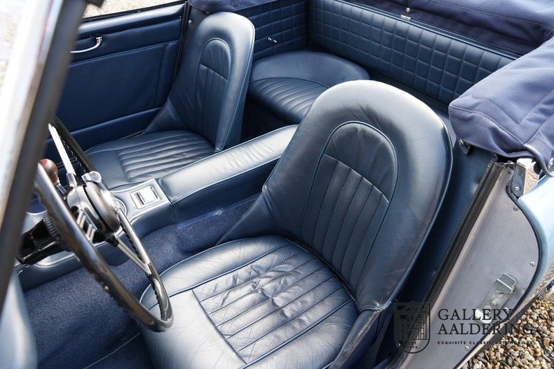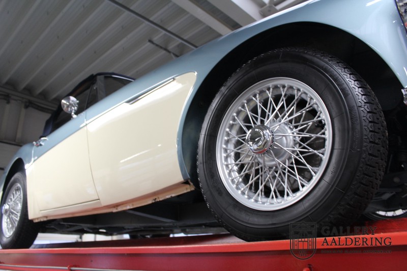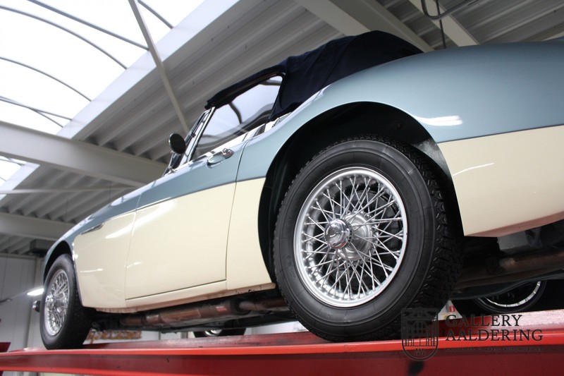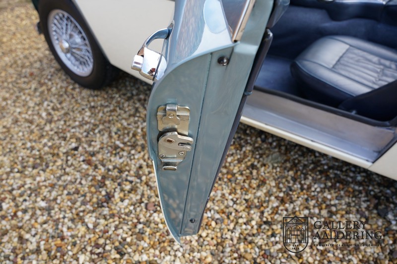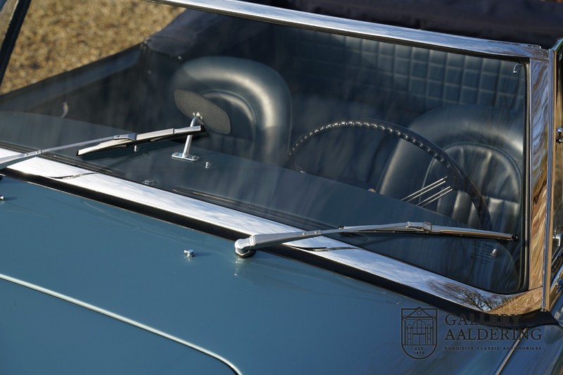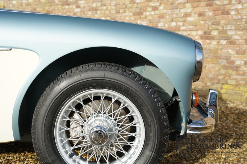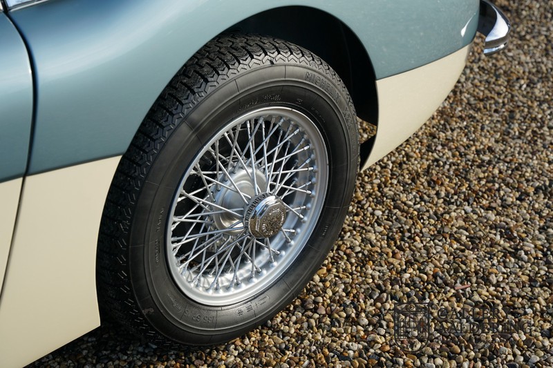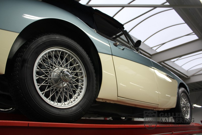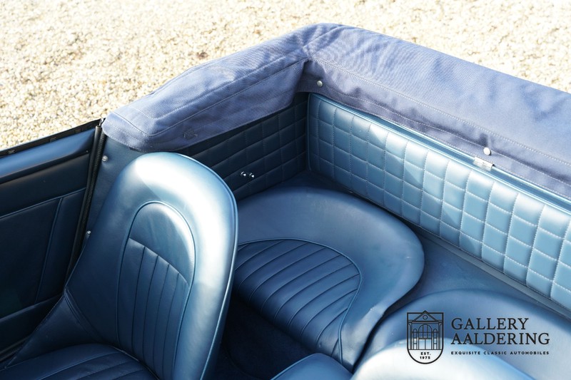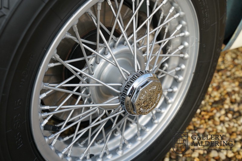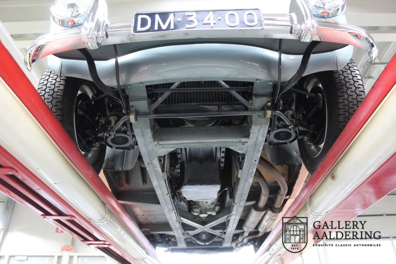 A few years ago this example underwent a full restoration. The high quality of this extremely well carried out work is still very much in evidence. Starting underneath we see a fine example of rust-free chassis. The bodywork is as straight as an arrow with thin and finely aligned panelwork. The lovely two-tone paint finish has been done to perfection. The bodywork and wire wheel chrome finish also looks splendid. The easy to use hood provides a tight fit when up.