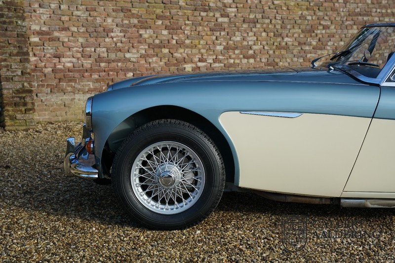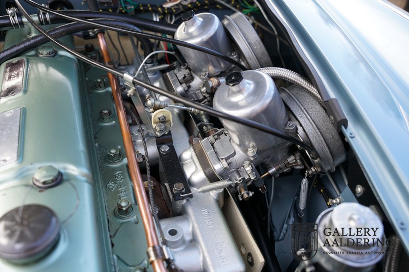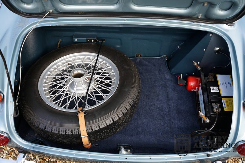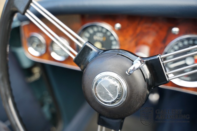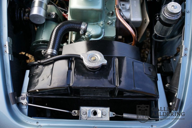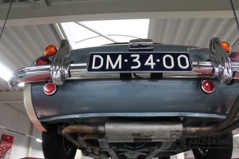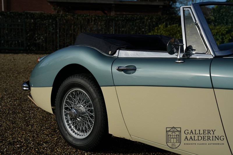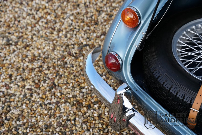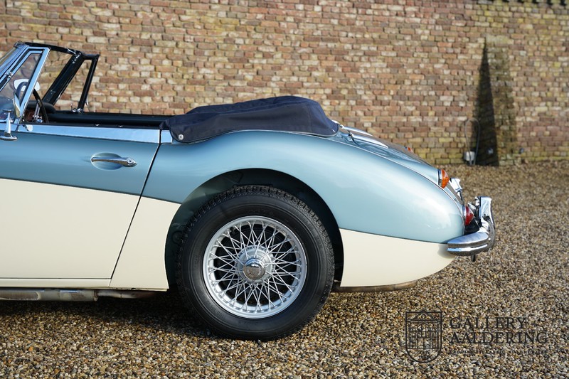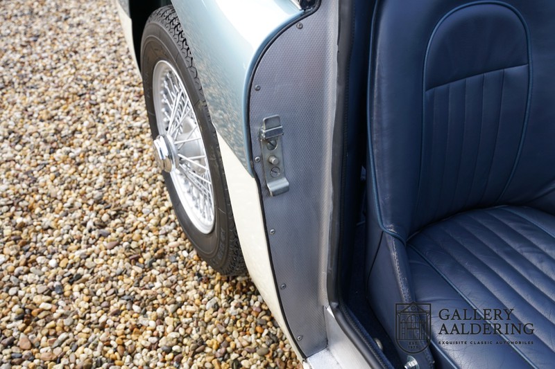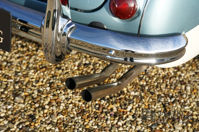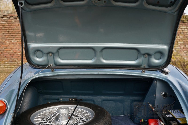 A few years ago this example underwent a full restoration. The high quality of this extremely well carried out work is still very much in evidence. Starting underneath we see a fine example of rust-free chassis. The bodywork is as straight as an arrow with thin and finely aligned panelwork. The lovely two-tone paint finish has been done to perfection. The bodywork and wire wheel chrome finish also looks splendid. The easy to use hood provides a tight fit when up.