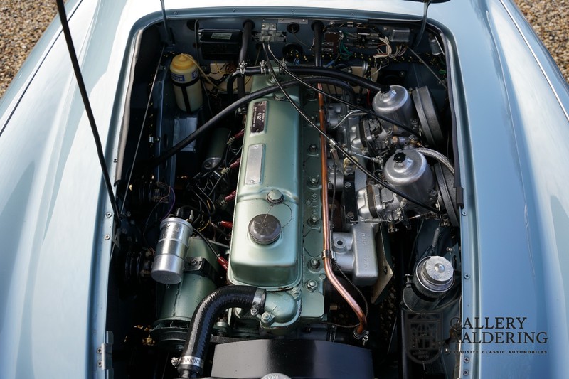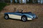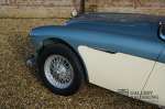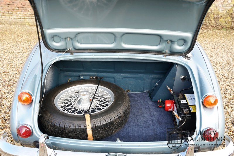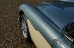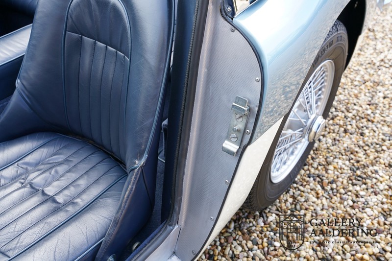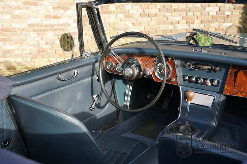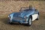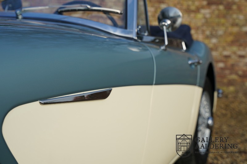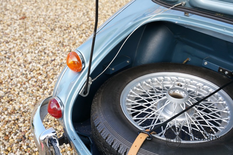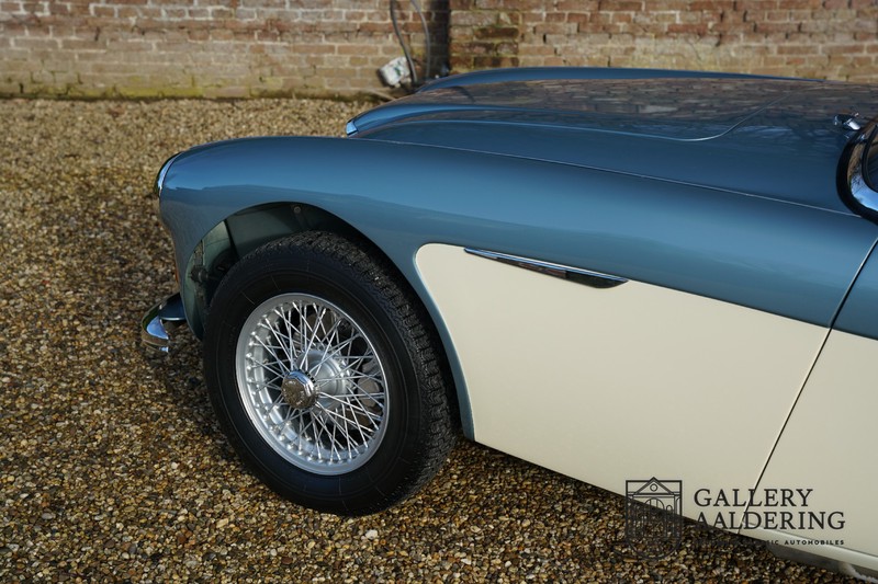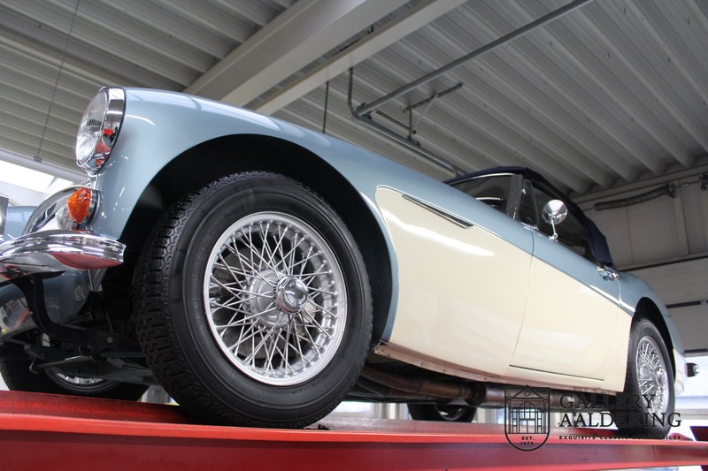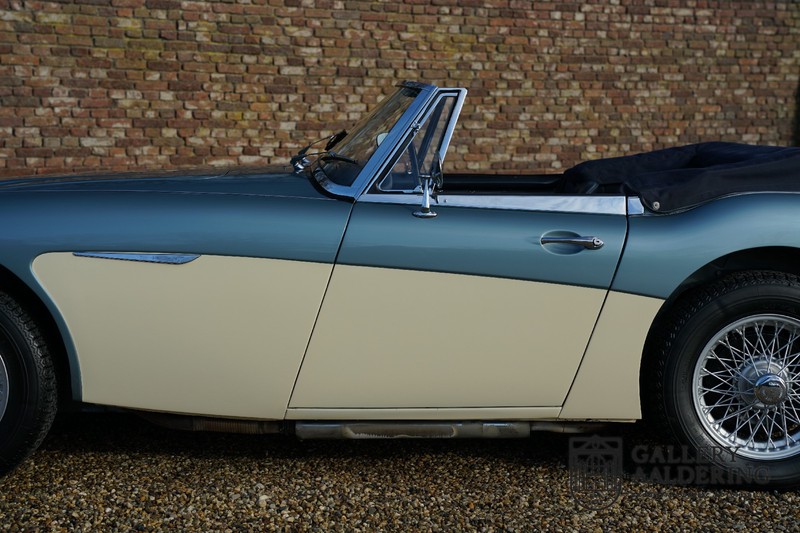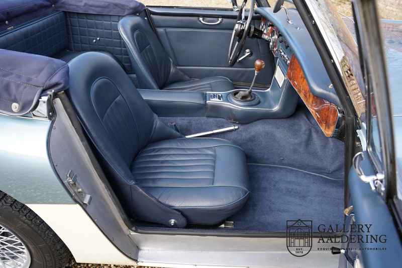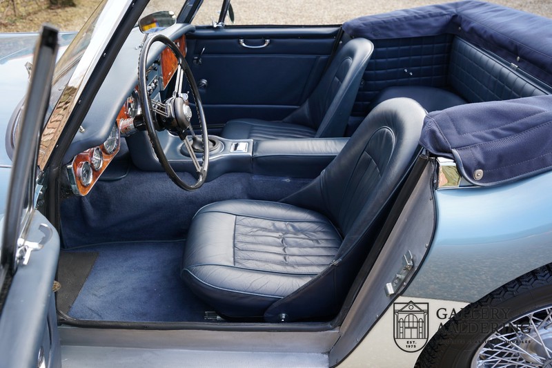 A few years ago this example underwent a full restoration. The high quality of this extremely well carried out work is still very much in evidence. Starting underneath we see a fine example of rust-free chassis. The bodywork is as straight as an arrow with thin and finely aligned panelwork. The lovely two-tone paint finish has been done to perfection. The bodywork and wire wheel chrome finish also looks splendid. The easy to use hood provides a tight fit when up.