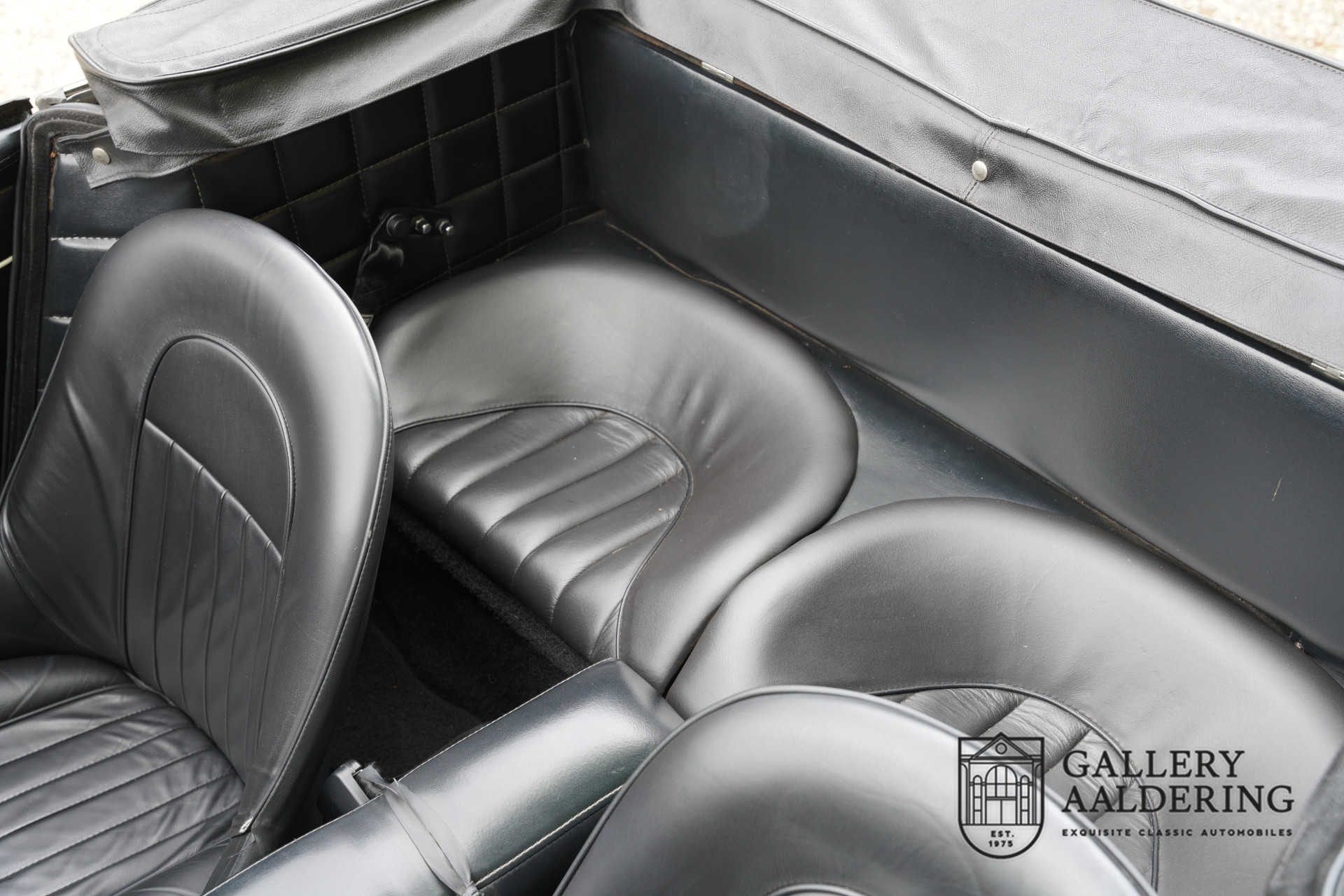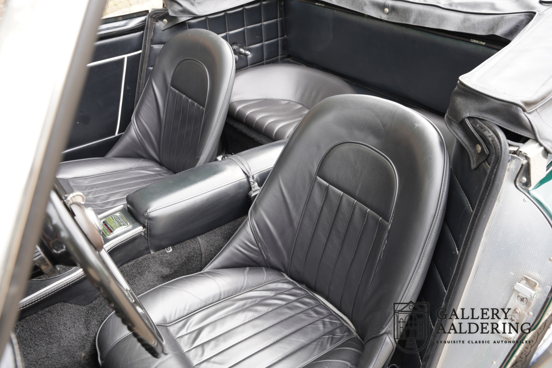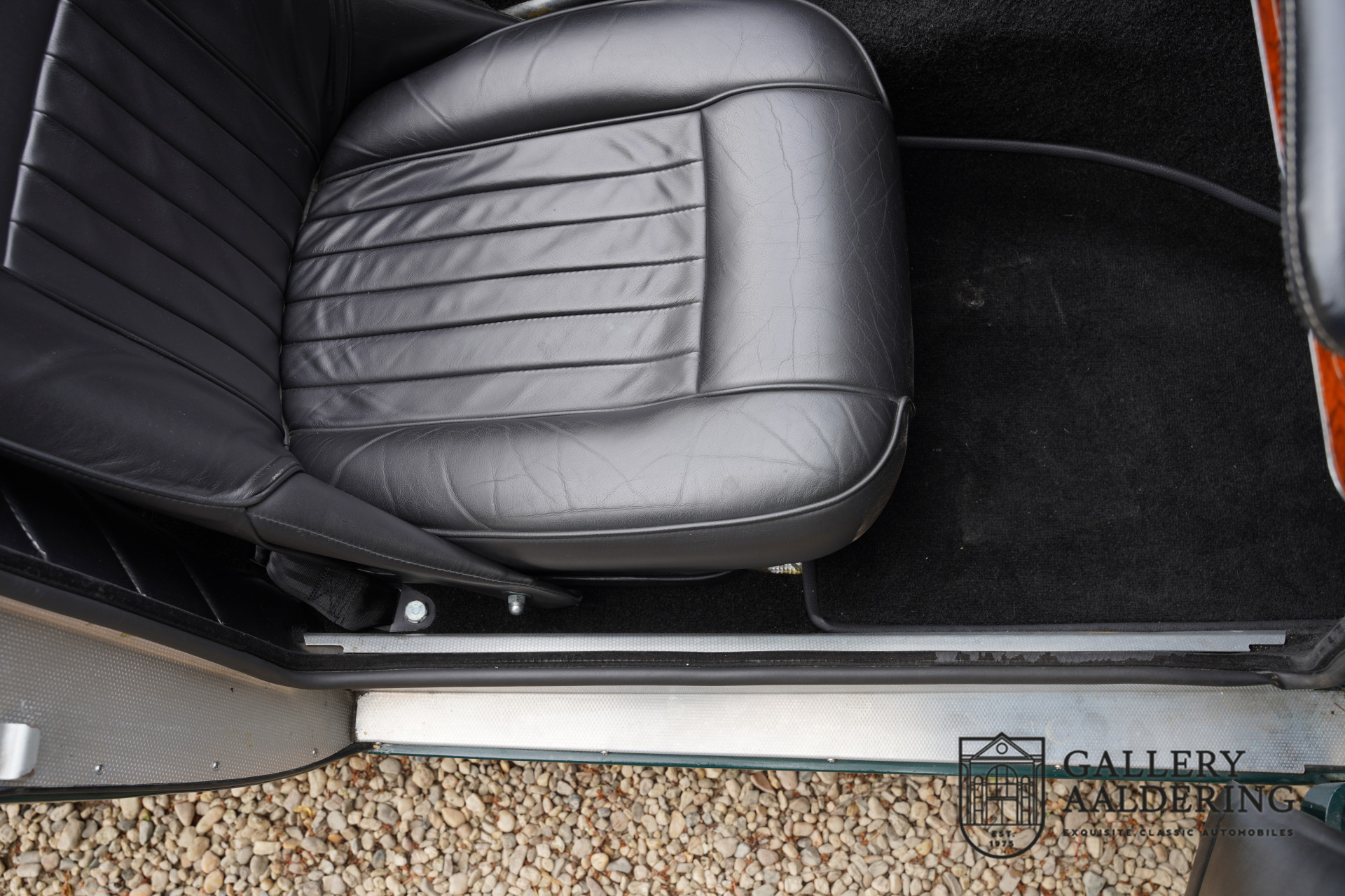 The interior was completely reupholstered at the time with a great sense of originality and with the use of beautiful materials. Beautiful and supple black leather that was renewed during the restoration, carpets that have suffered the same fate and a beautiful, largely wooden dashboard finishes it off. Beautiful rocker switches, perfectly functioning controls and beautiful Smith instruments give a very clear impression of the condition of the inside of this Mk3. Did we already mention that the black soft top is in optimal condition? Hereby! If the car is parked, there is also a black tonneau cover with the car to cover it neatly.