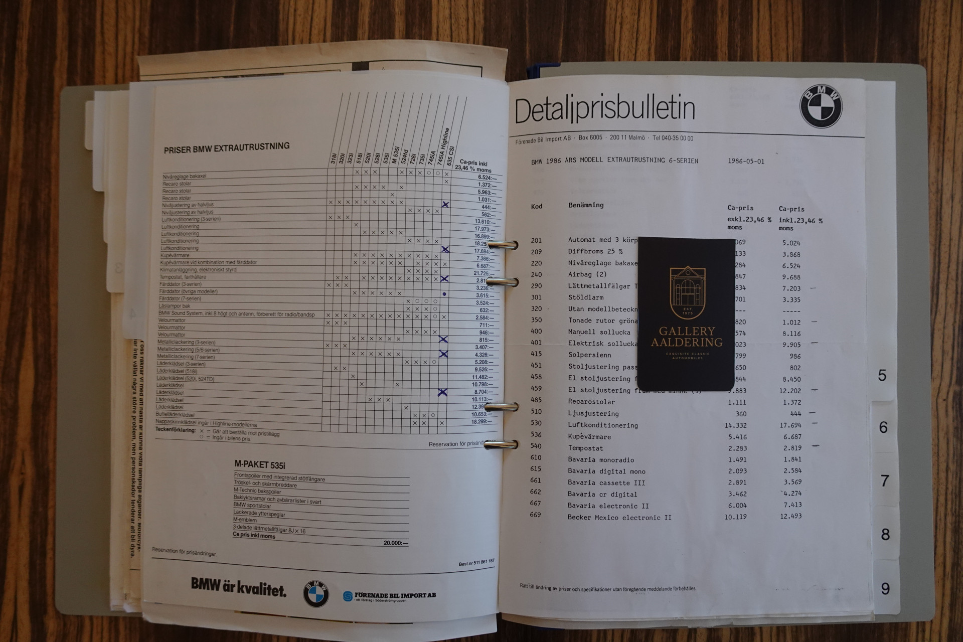 Wij presenteren hier een BMW 635 CSi in showroomkwaliteit met slechts 42000 kilometers. Dit is een waanzinnig mooie BMW in een staat die tegenwoordig een absolute zeldzaamheid is geworden. Enkele details: de complete gereedschapsset is aanwezig, de isolatie onder de motorkap is ongeschonden, de tapijten in het interieur ruiken als nieuw, de eerste lak glimt zoals in 1986 en het leer is net zo soepel als bijna 40 jaar geleden. De motor loopt geruisloos. Soms is het lastig om de staat van een auto in woorden uit te drukken, maar hopelijk heeft u bij deze een impressie. Dit betreft een 6-serie van de laatste serie van de E24 en dit exemplaar heeft een rijke uitrusting waaronder een schuifdak, elektrisch verstelbare stoelen met memory functie, elektrische ramen, Becker Mexico radio, enzovoort.