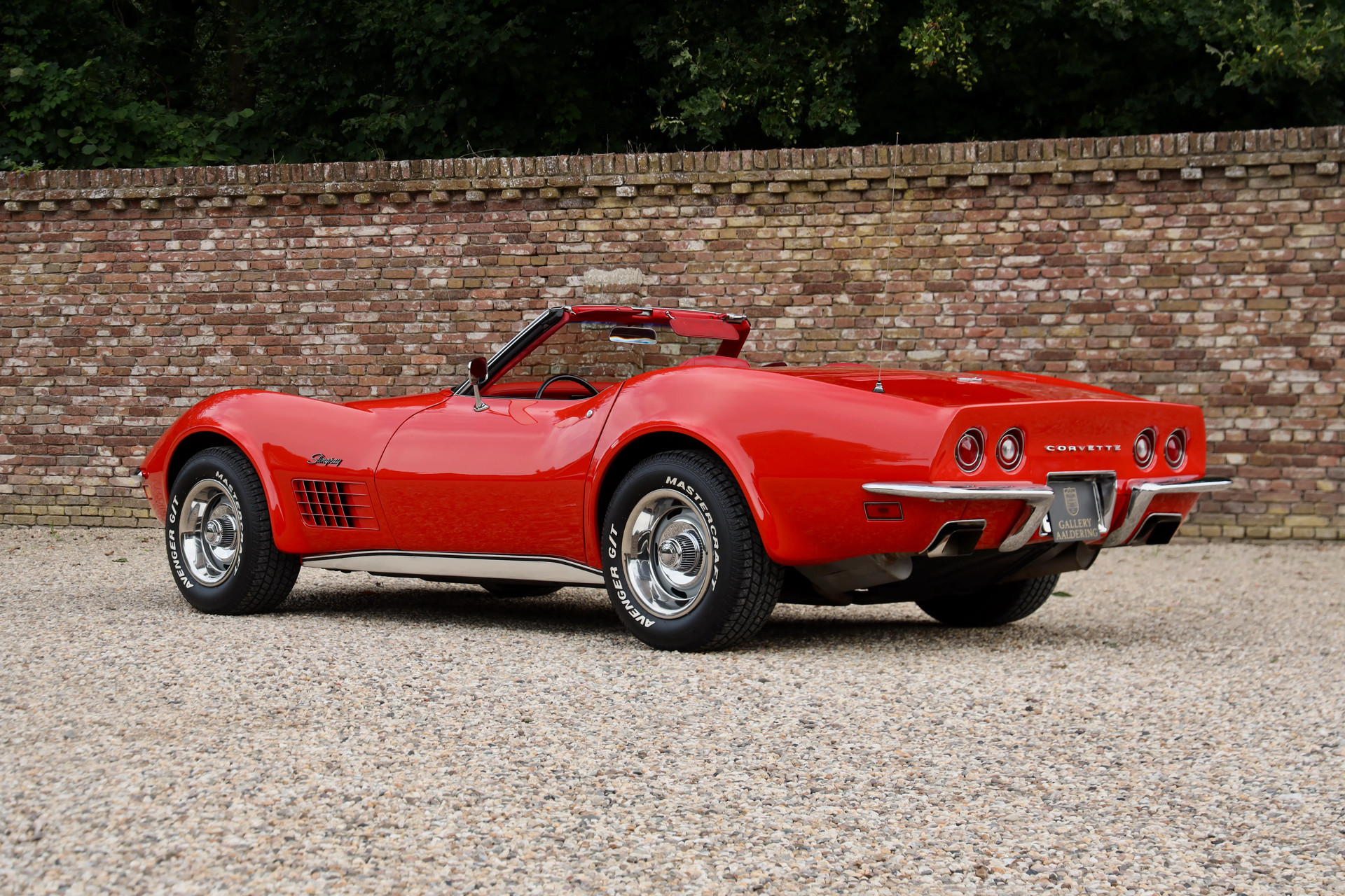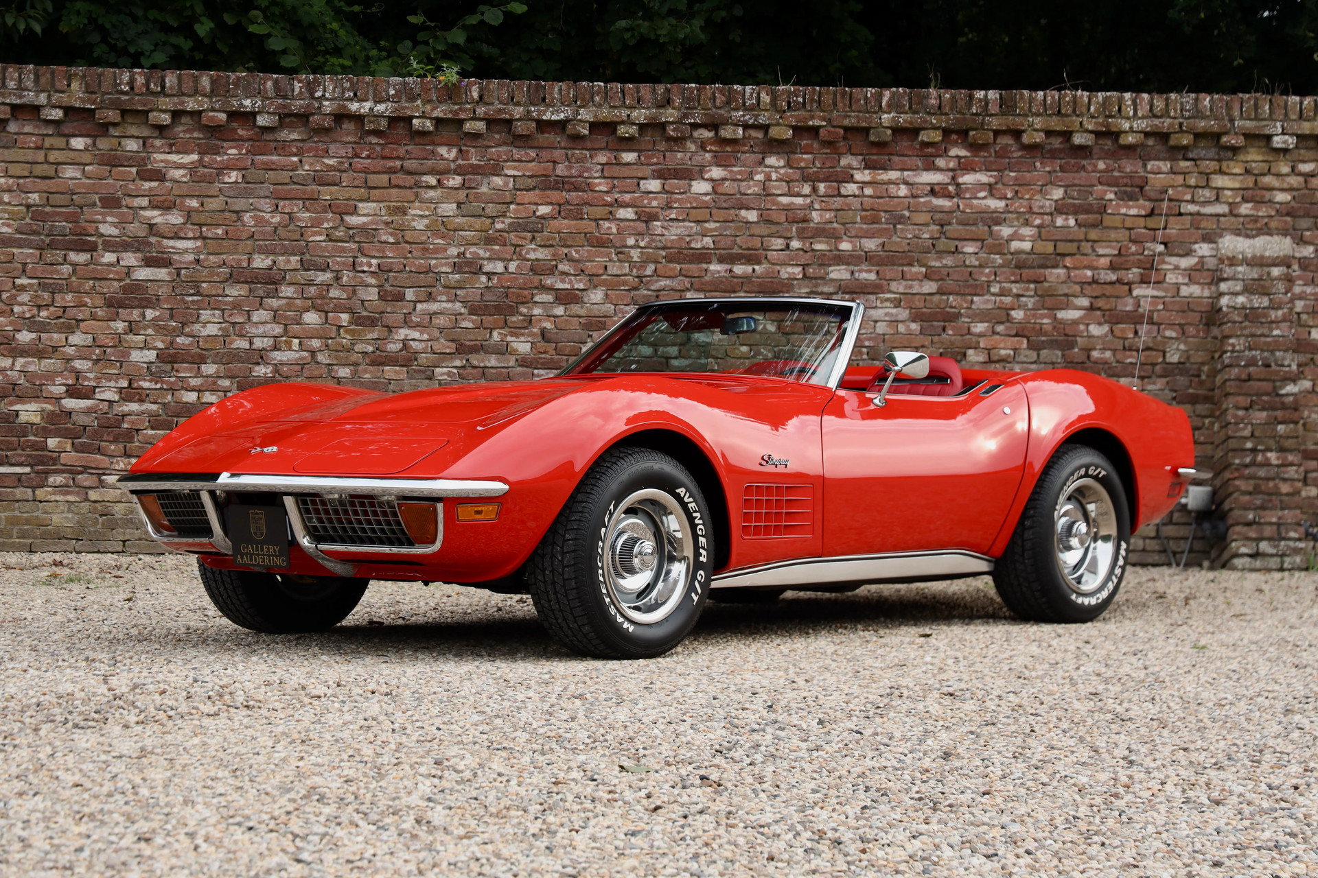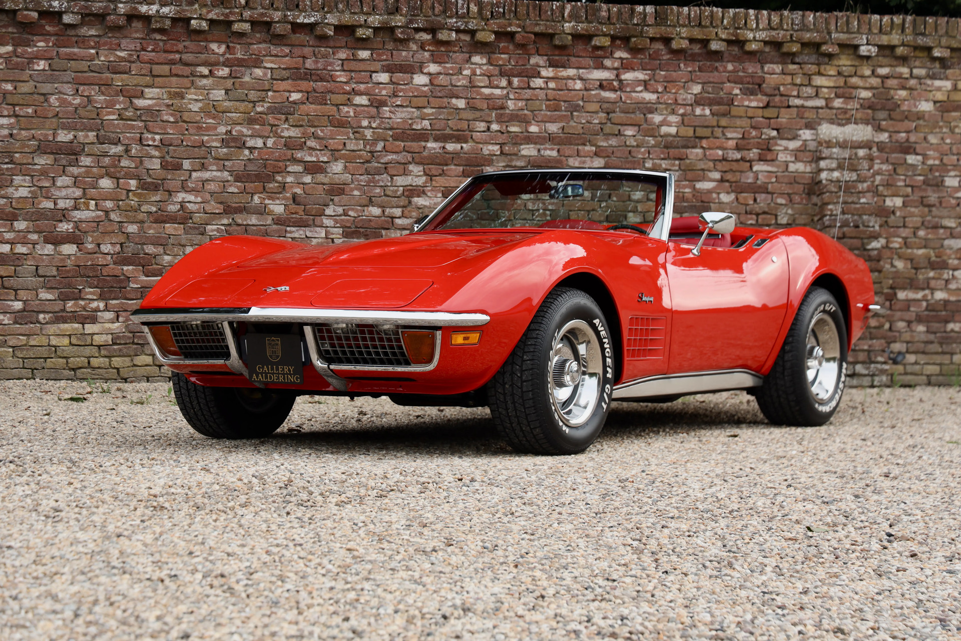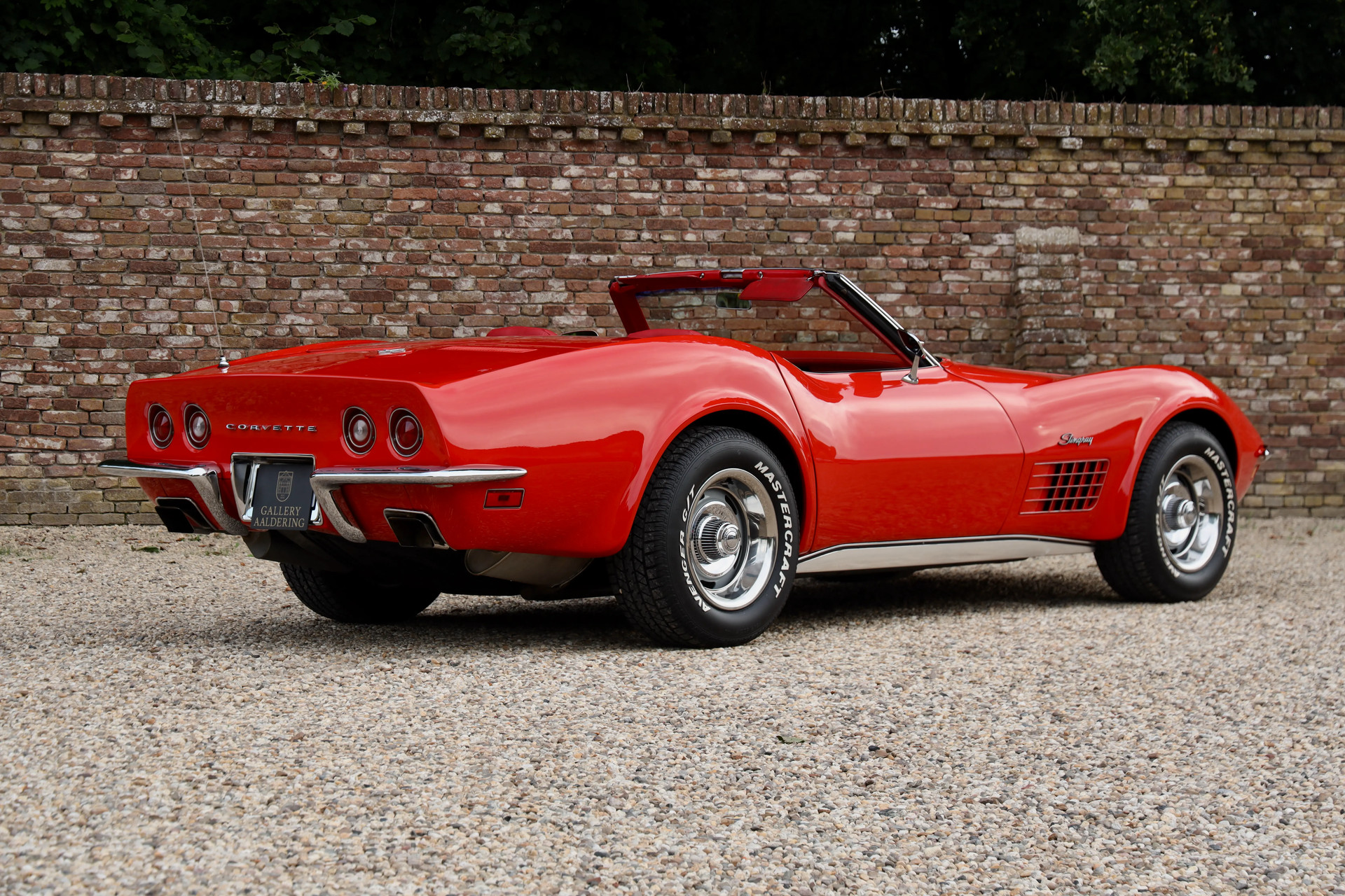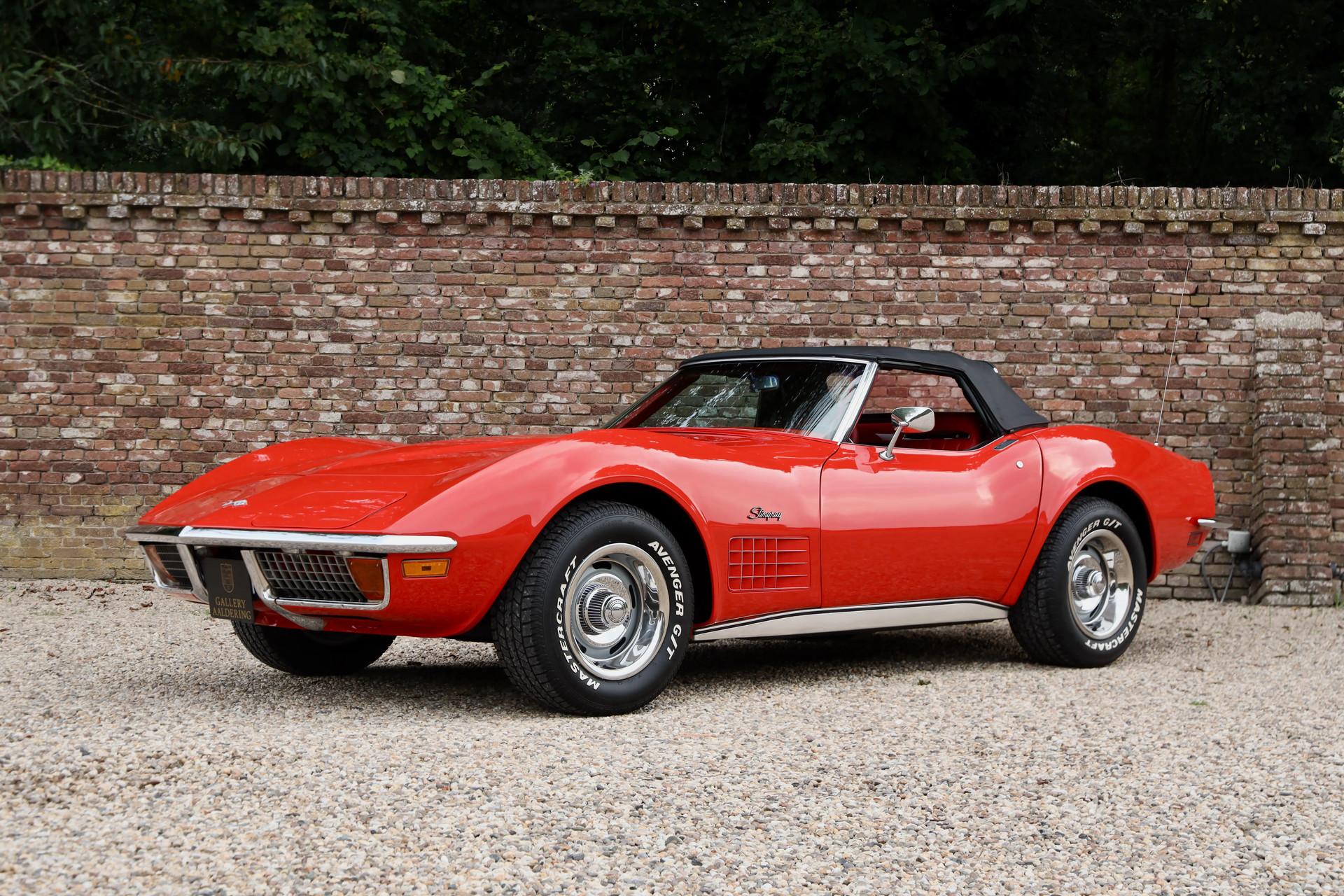 De derde generatie Corvette, zoals deze, werd geproduceerd tussen 1967 en 1982. 1970, zoals dit exemplaar, kende een aantal wijzigingen. De carrosserie kreeg voor het eerst geïntegreerde spatbordverbredingen, die niet alleen visueel sterker overkwamen, maar ook praktische bescherming boden tegen opspattend vuil. Aan de voorzijde verschenen nieuwe ‘eggcrate’ grille met bijpassende zijopeningen in de voorspatborden, terwijl de richtingaanwijzers groter en vierkanter werden vormgegeven. Achteraan verdwenen de ronde uitlaatopeningen ten gunste van grotere, rechthoekige exemplaren, waarmee de Corvette er gespierder en volwassener uitzag dan ooit. Binnenin werden de stoelen herzien en kon men kiezen voor een nieuw ‘deluxe’ interieurpakket met houtaccenten, dikker tapijt en leren bekleding. Onderhuids werd de Positraction achterasstandaard, evenals getint glas en een handgeschakelde versnellingsbak met grotere overbrengingsverhoudingen.
