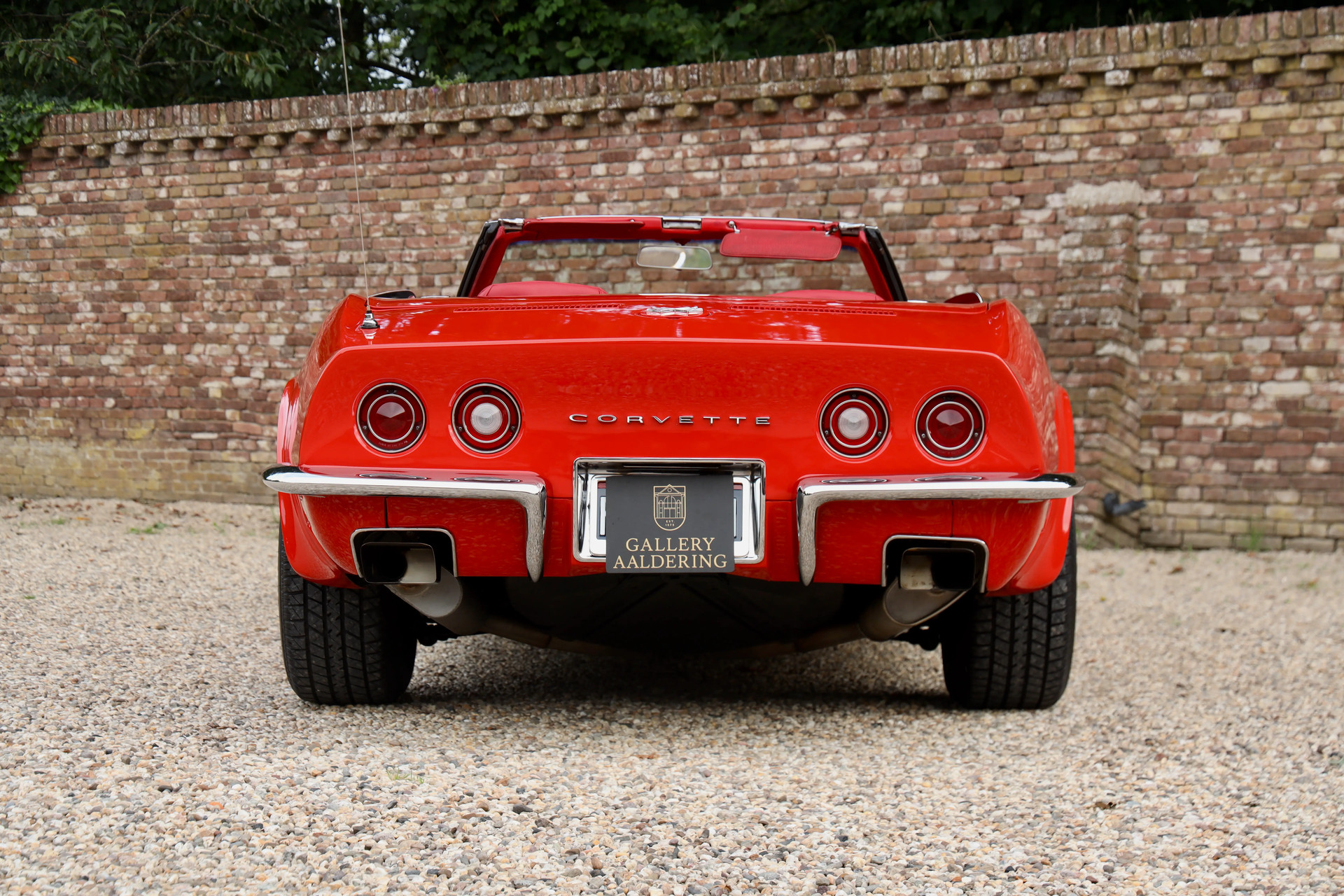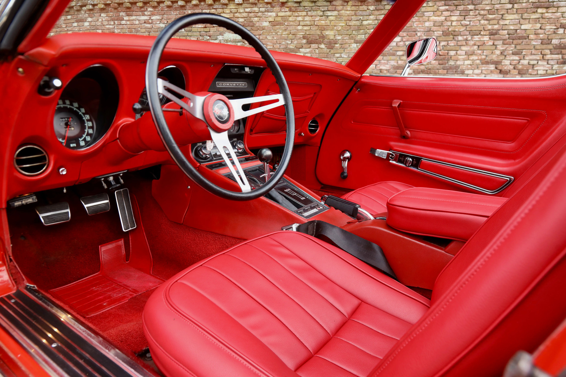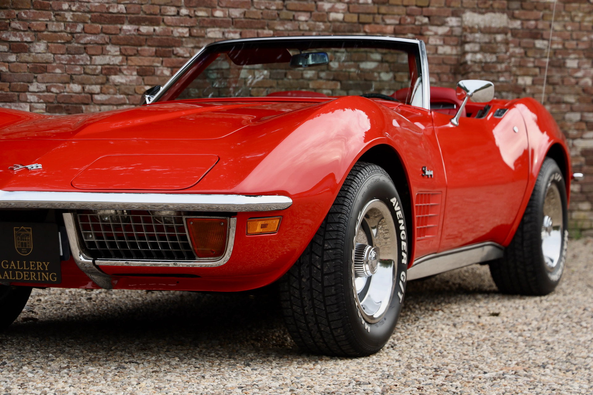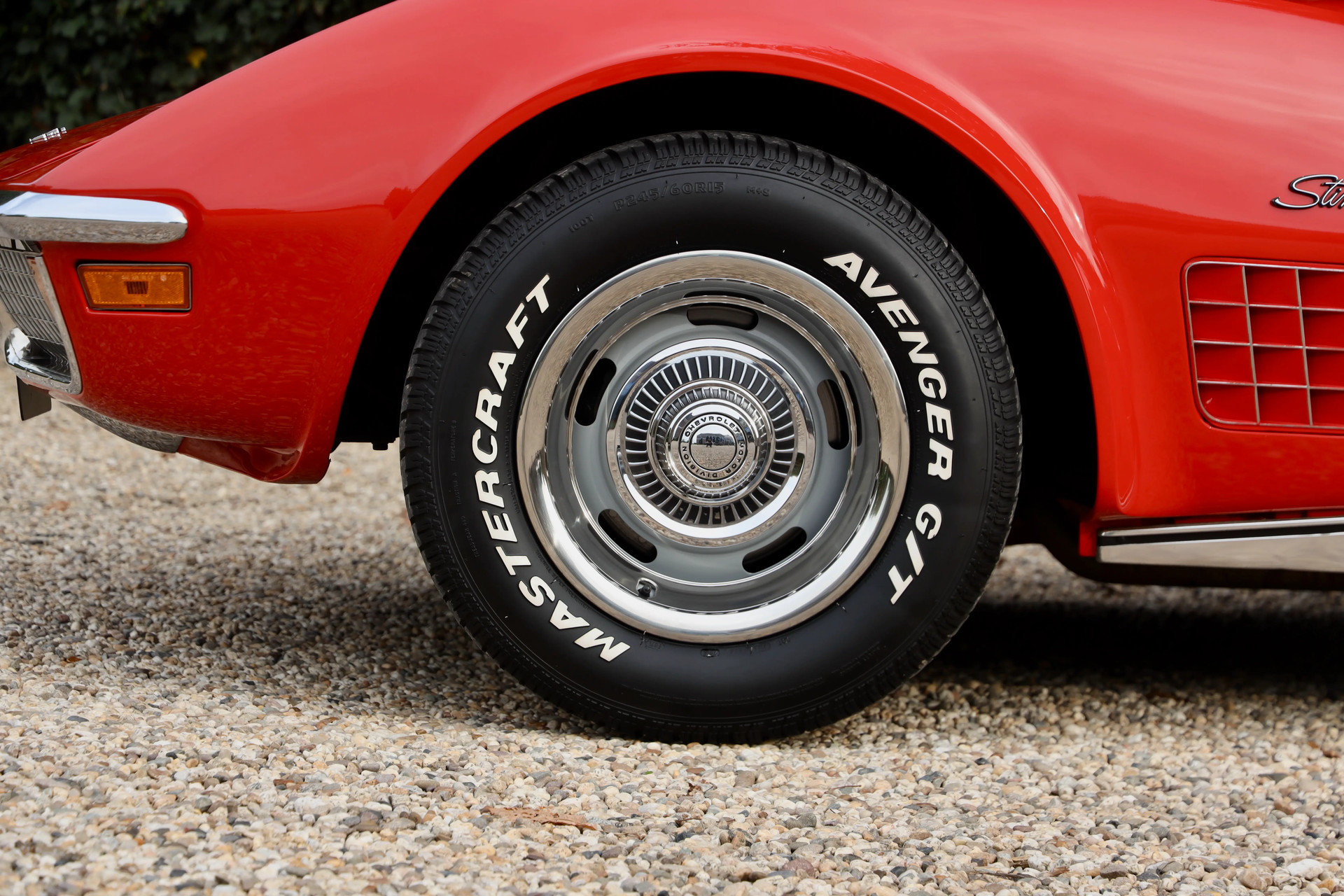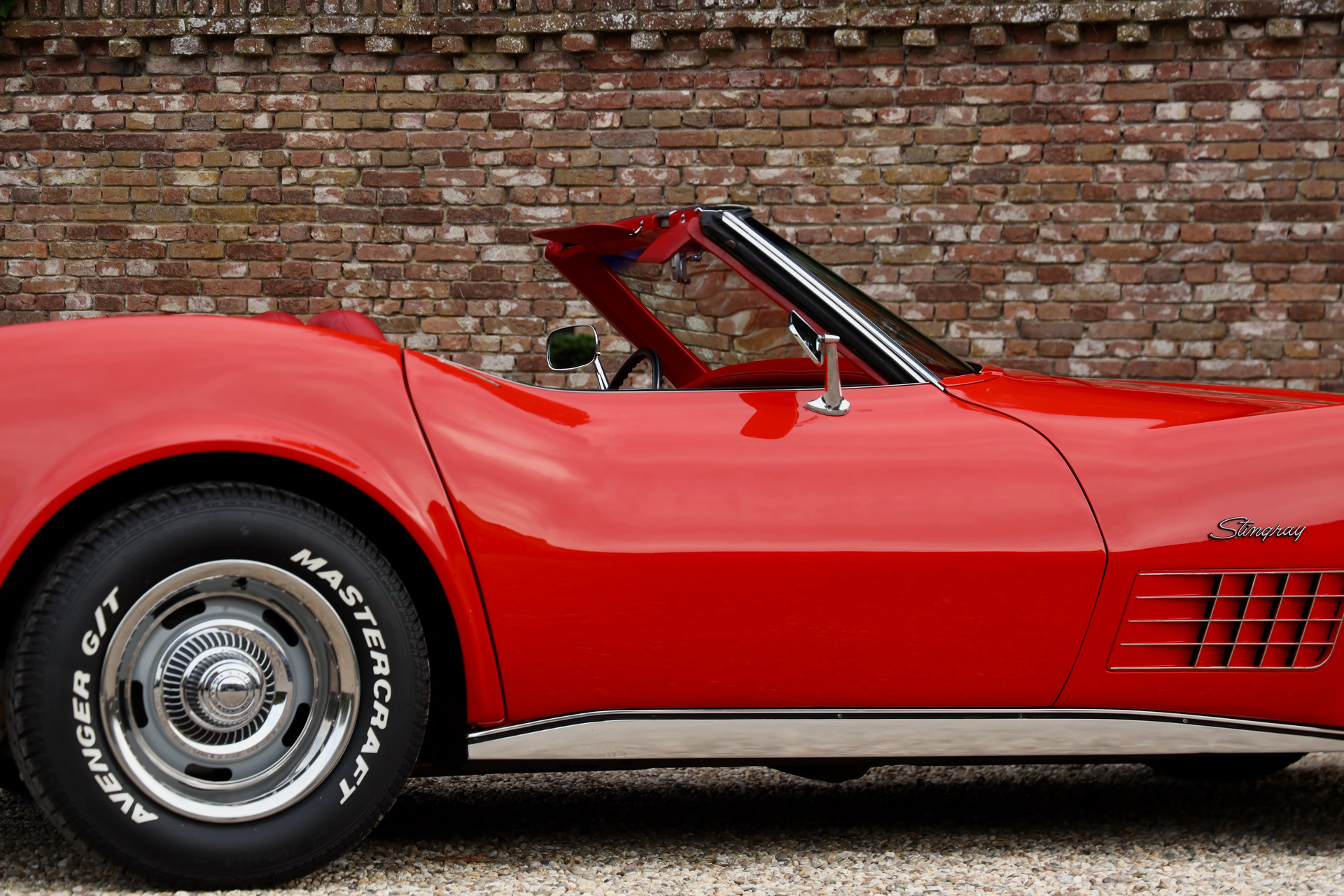 De derde generatie Corvette, zoals deze, werd geproduceerd tussen 1967 en 1982. 1970, zoals dit exemplaar, kende een aantal wijzigingen. De carrosserie kreeg voor het eerst geïntegreerde spatbordverbredingen, die niet alleen visueel sterker overkwamen, maar ook praktische bescherming boden tegen opspattend vuil. Aan de voorzijde verschenen nieuwe ‘eggcrate’ grille met bijpassende zijopeningen in de voorspatborden, terwijl de richtingaanwijzers groter en vierkanter werden vormgegeven. Achteraan verdwenen de ronde uitlaatopeningen ten gunste van grotere, rechthoekige exemplaren, waarmee de Corvette er gespierder en volwassener uitzag dan ooit. Binnenin werden de stoelen herzien en kon men kiezen voor een nieuw ‘deluxe’ interieurpakket met houtaccenten, dikker tapijt en leren bekleding. Onderhuids werd de Positraction achterasstandaard, evenals getint glas en een handgeschakelde versnellingsbak met grotere overbrengingsverhoudingen.