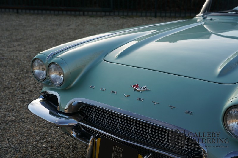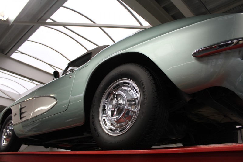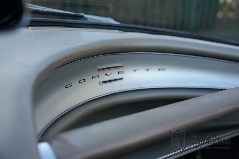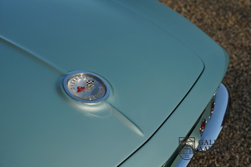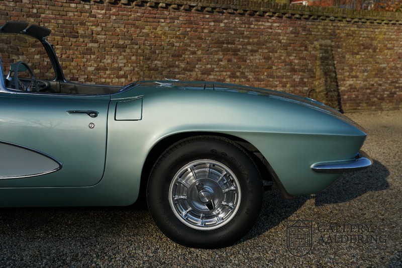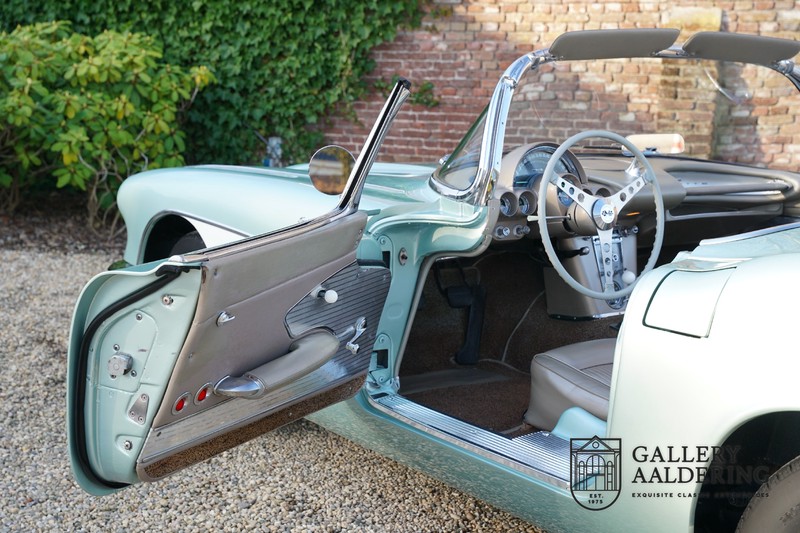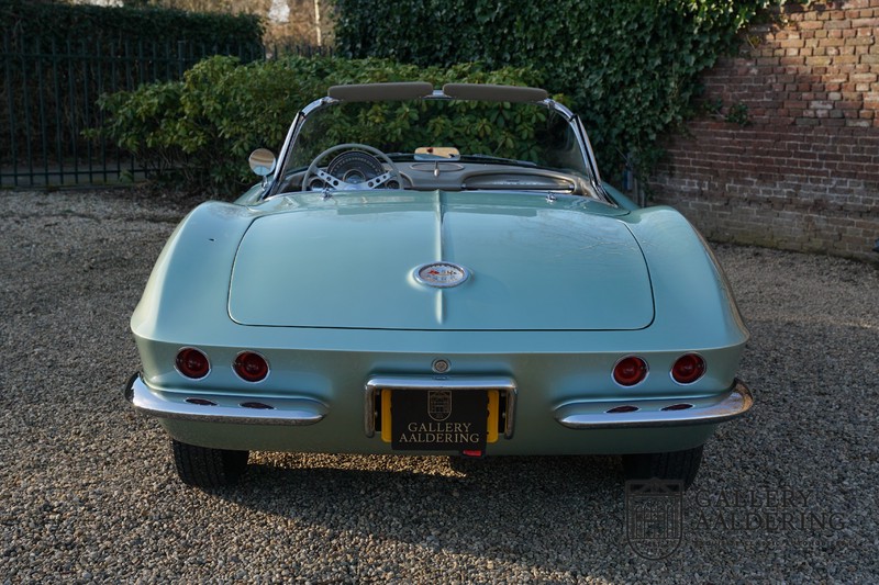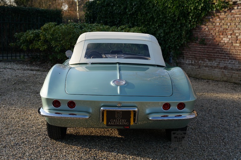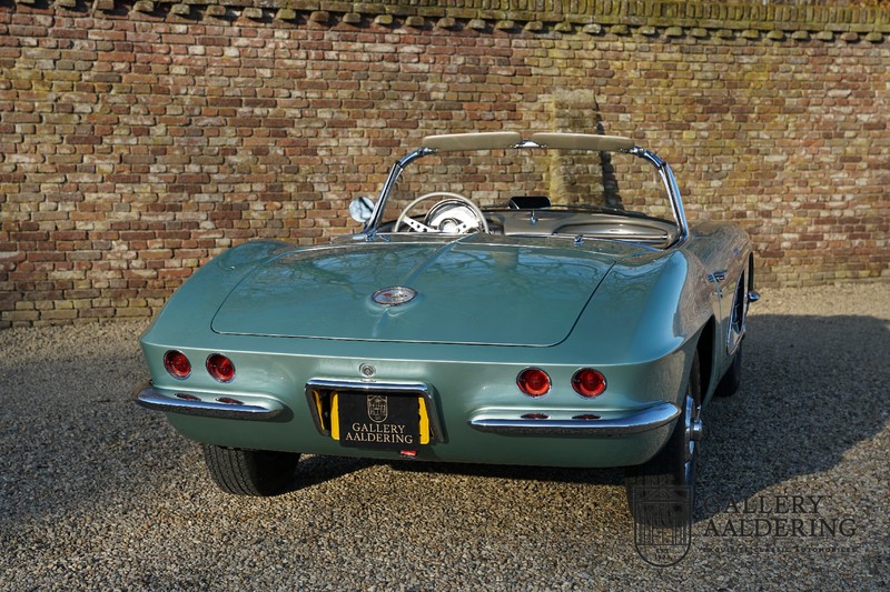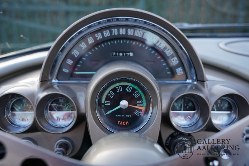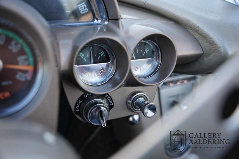 We bought the car in Santa Barbara, California in the States. The were a number of things that immediately drew our attention and made sure we added this one to our collection. First of all there is the condition to consider. Good care and the warm Californian climate has preserved this car from the ravages of bad weather. That meant this Corvette never needed to be restored and is in very original condition. That does not mean they scrimped on maintenance. The previous owner spent over$ 26.000 in maintenance with one invoice totalling over $ 15.400. Mechanically the car is in A-1 condition, which becomes immediately obvious once behind the wheel. The brakes work fine and the car holds the road really well. The 283 Ci (4.6 litre) engine has been fitted with a Rochester fuel injector, giving her 315 Ps. This was the top of the range C1 edition, her 315 PS, despite her 60 summers, still making this a seriously fast car. The engine is attached to the rare and very popular manual 4-speed gearbox. Especially the presence of fuel injection is rare. In 1961 Chevrolet produced 10,931 Corvettes of which only 1,462 had the top of the range engine. Other rarities include the heating system and the factory supplied am radio.