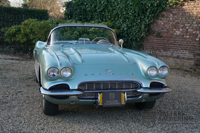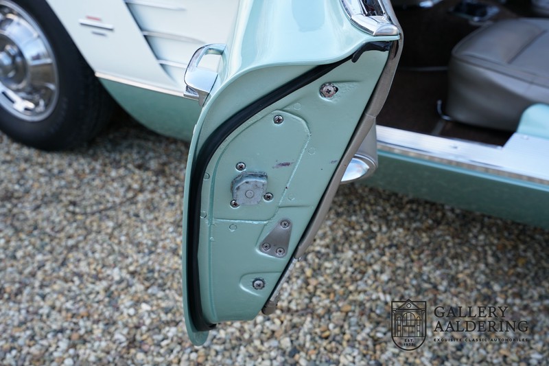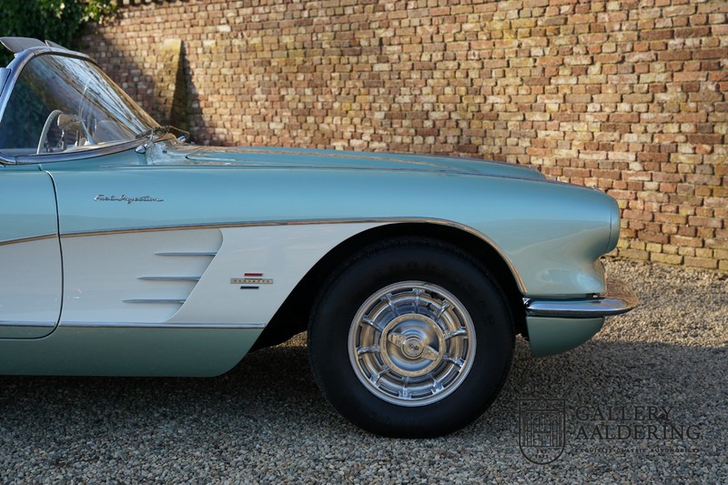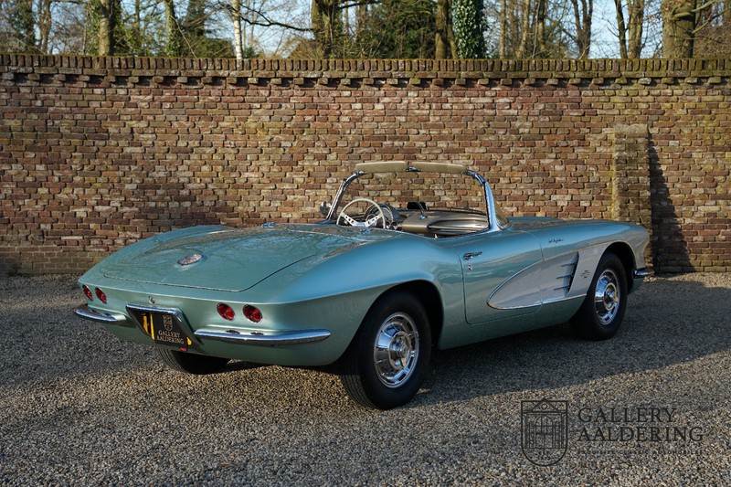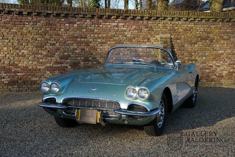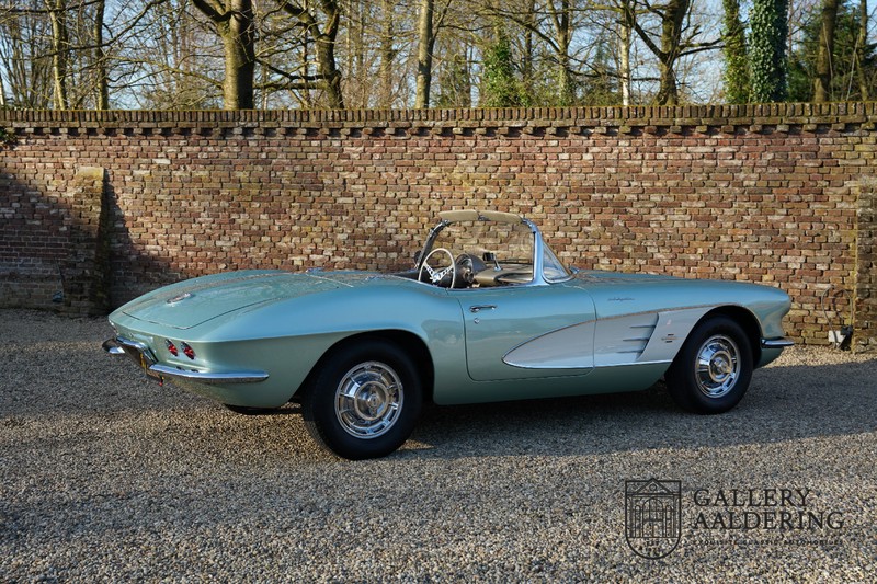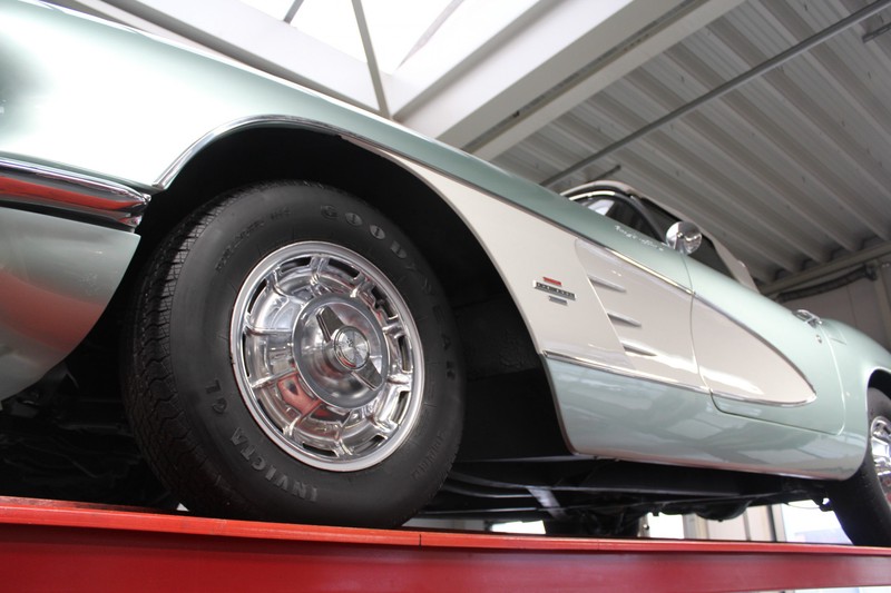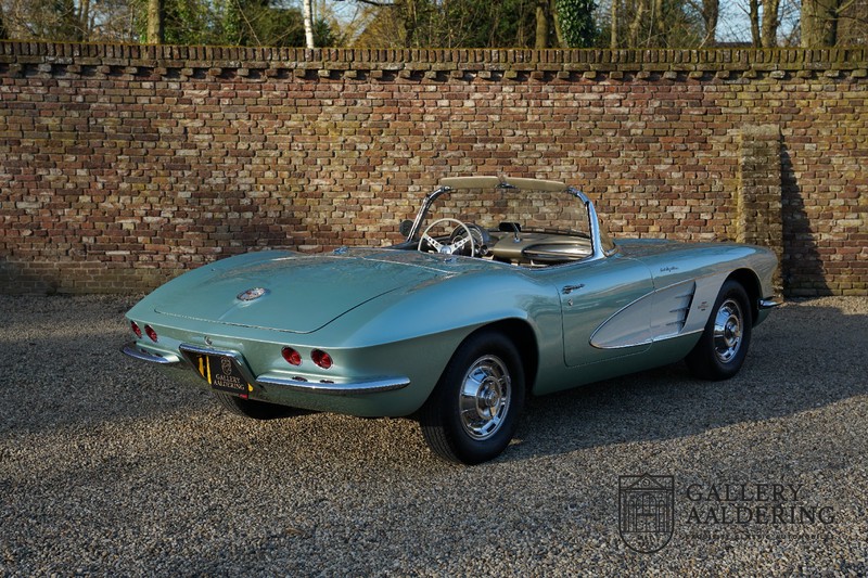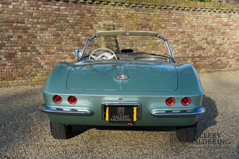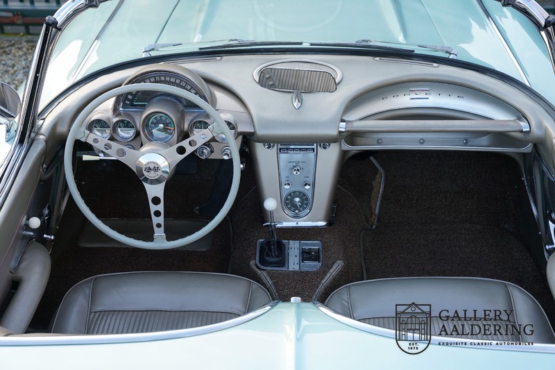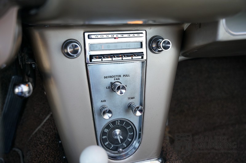 We bought the car in Santa Barbara, California in the States. The were a number of things that immediately drew our attention and made sure we added this one to our collection. First of all there is the condition to consider. Good care and the warm Californian climate has preserved this car from the ravages of bad weather. That meant this Corvette never needed to be restored and is in very original condition. That does not mean they scrimped on maintenance. The previous owner spent over$ 26.000 in maintenance with one invoice totalling over $ 15.400. Mechanically the car is in A-1 condition, which becomes immediately obvious once behind the wheel. The brakes work fine and the car holds the road really well. The 283 Ci (4.6 litre) engine has been fitted with a Rochester fuel injector, giving her 315 Ps. This was the top of the range C1 edition, her 315 PS, despite her 60 summers, still making this a seriously fast car. The engine is attached to the rare and very popular manual 4-speed gearbox. Especially the presence of fuel injection is rare. In 1961 Chevrolet produced 10,931 Corvettes of which only 1,462 had the top of the range engine. Other rarities include the heating system and the factory supplied am radio.