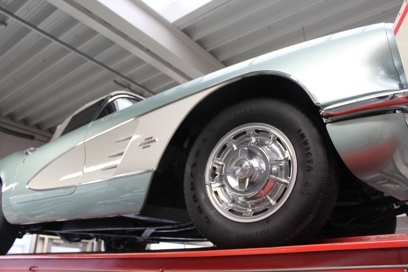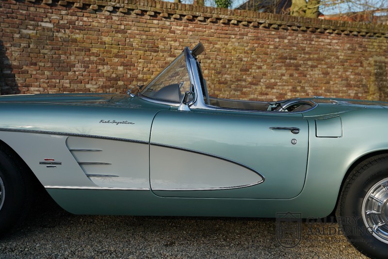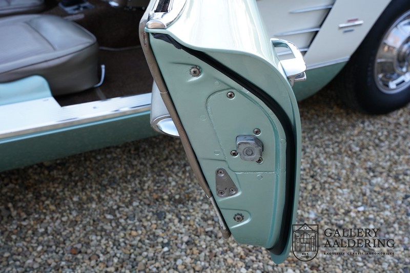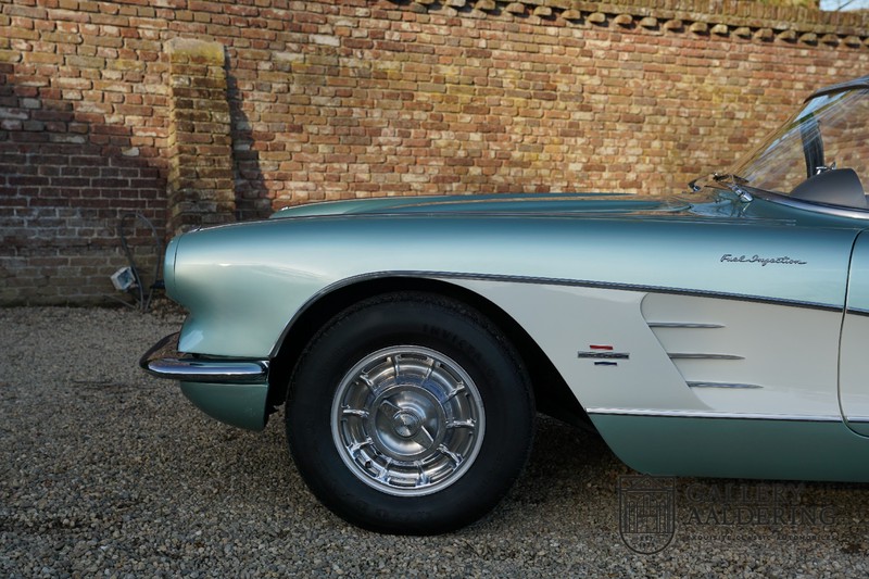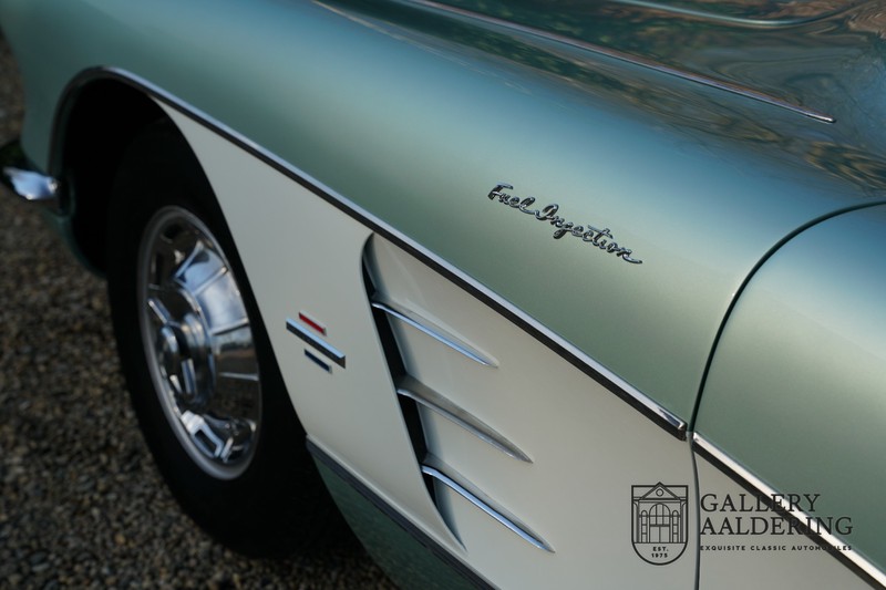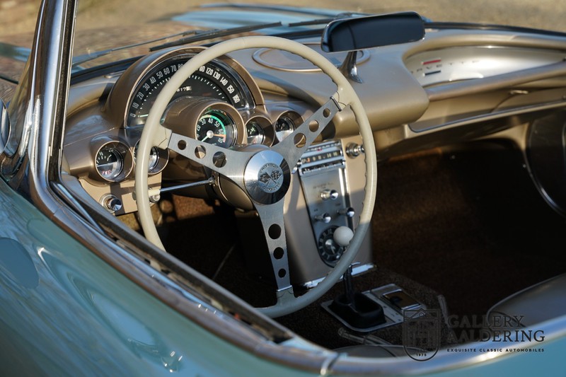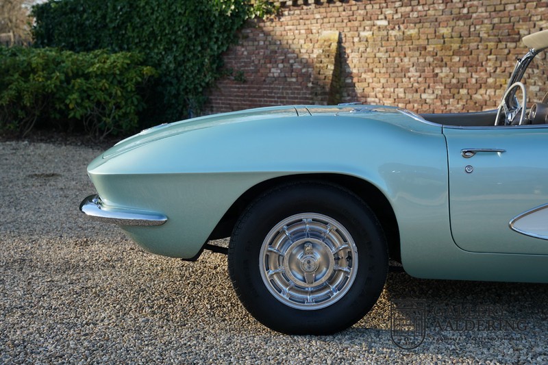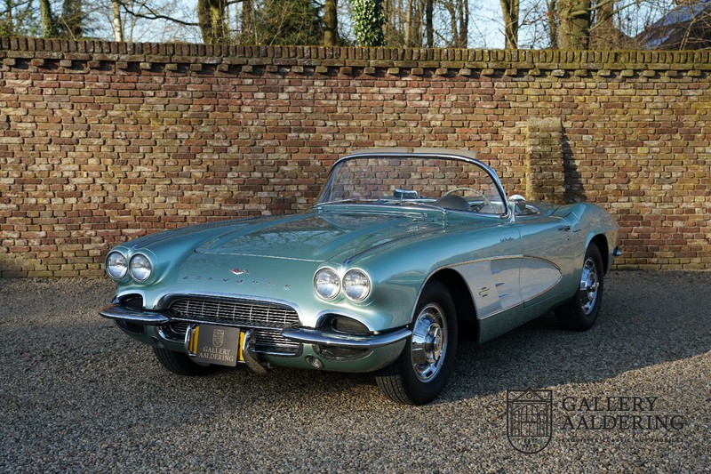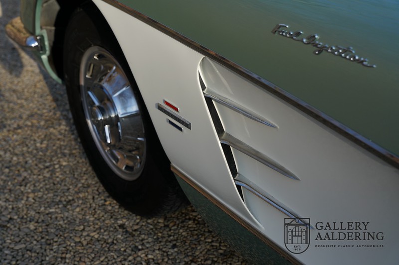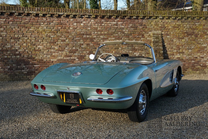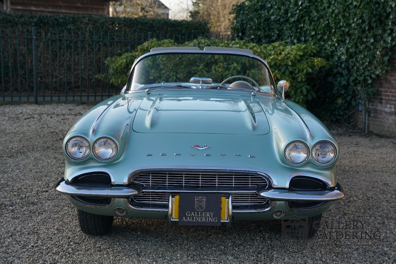 We bought the car in Santa Barbara, California in the States. The were a number of things that immediately drew our attention and made sure we added this one to our collection. First of all there is the condition to consider. Good care and the warm Californian climate has preserved this car from the ravages of bad weather. That meant this Corvette never needed to be restored and is in very original condition. That does not mean they scrimped on maintenance. The previous owner spent over$ 26.000 in maintenance with one invoice totalling over $ 15.400. Mechanically the car is in A-1 condition, which becomes immediately obvious once behind the wheel. The brakes work fine and the car holds the road really well. The 283 Ci (4.6 litre) engine has been fitted with a Rochester fuel injector, giving her 315 Ps. This was the top of the range C1 edition, her 315 PS, despite her 60 summers, still making this a seriously fast car. The engine is attached to the rare and very popular manual 4-speed gearbox. Especially the presence of fuel injection is rare. In 1961 Chevrolet produced 10,931 Corvettes of which only 1,462 had the top of the range engine. Other rarities include the heating system and the factory supplied am radio.