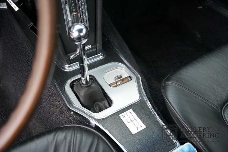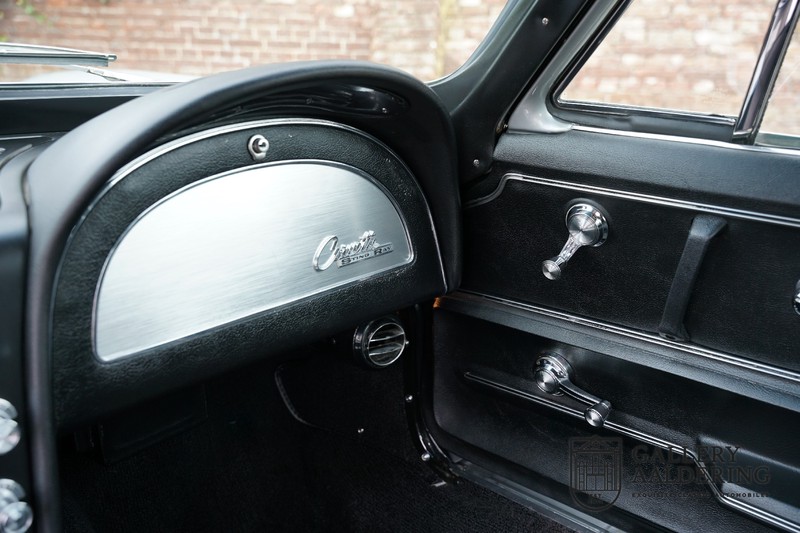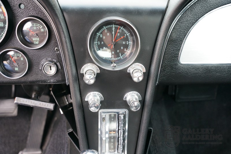 Das Interieur des Autos wurde mit viel Auge für die Originalität komplett neu gepolstert. Die Sitze sind mit schwarzem Vinyl bezogen. Die Teppiche wurden komplett erneuert und passen überall gut. Das Armaturenbrett sieht sehr gepflegt aus und wurde bei der Restaurierung ebenfalls neu bezogen und mit neuen Chromringen versehen. Die Instrumente und Bedienelemente befinden sich alle in einem sehr guten Zustand und sind eine Augenweide. Alle Teile wurden professionell überholt und tragen zum schönen Aussehen dieses Autos bei. Auch der Dachhimmel wurde komplett erneuert und als i-Tüpfelchen bekam das Auto einen neuen Schaltknauf. Dieser Schaltknauf ist bei der Corvette der zweiten Generation immer noch eine Seltenheit, die meisten Autos wurden damals mit Automatikgetriebe verkauft. Heute ist das manuelle Getriebe viel beliebter, völlig verständlich nach einigen Kilometern Fahrt. Das Getriebe ist perfekt auf den Motor und das sportliche Fahrverhalten der Corvette abgestimmt.