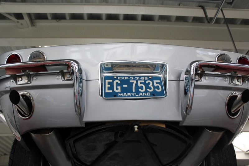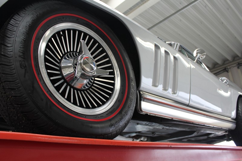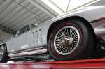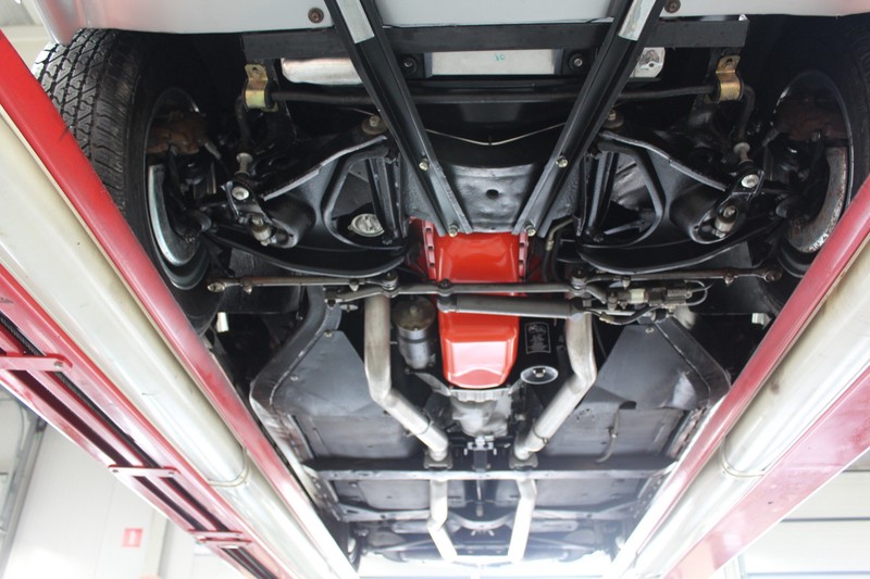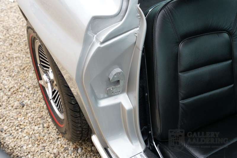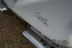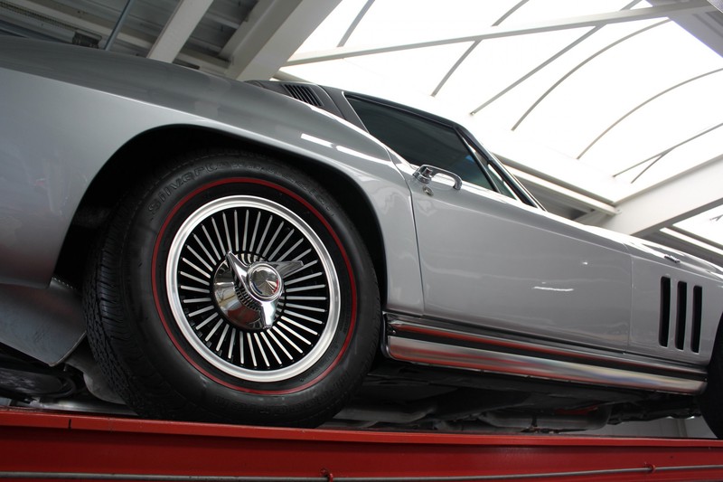 Die Karosserie der Corvette sieht wunderschön aus, die Zierleisten passen überall perfekt und die Kunststoffkarosserie hat sehr gute Spaltmassen. Die Silver-Pearl Lackierung passt nicht nur perfekt zum „Space Age“ Aussehen des Autos, sondern es ist auch die Farbe, mit der das Auto seinerzeit ab Werk bestellt wurde. Die Lackierungsarbeiten wurden damals hochwertig durchgeführt. Der Lack ist noch immer frei von Gebrauchsspuren und hat einen schönen und tiefen Glanz. Das Auto hat die üblichen und korrekten Corvette-Felgen mit guten Reifen in den richtigen Größen. Wenn wir uns der Unterboden ansehen, sehen wir, dass der Rahmen des Autos sich noch immer in einem schönen und guten Zustand befindet und während der Restaurierung professionell lackiert wurde. Die Auspuffanlage befindet sich natürlich auch in sehr gutem Zustand.