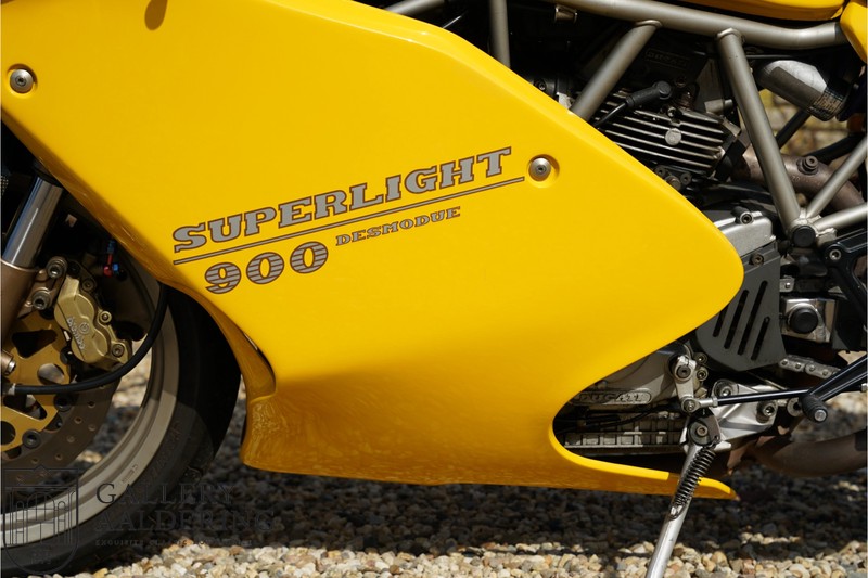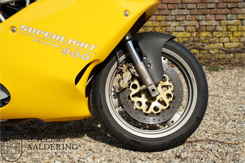 Het betreft hier een schitterende Ducati 900 Superlight uit 1995. De motor heeft 48.162 kilometer gelopen en is afkomstig van een liefhebber. De motor is zeer goed onderhouden en verkeert zowel optisch als technisch in zeer fraaie conditie. Het hart van de Ducati is een 900CC V-Twin van 90 graden die 78 pk levert bij 7.000 toeren en beschikt over zes versnellingen en een droge koppeling. Het typische Ducati geluid wordt in dit geval versterkt door een Arrow Racing uitlaatsysteem. Verder heeft de motor de beschikking over Veglia instrumenten met witte wijzerplaten, carbon spatborden en Brembo remmen. Kortom een prachtige Ducati 900 Superlight in prachtige staat.