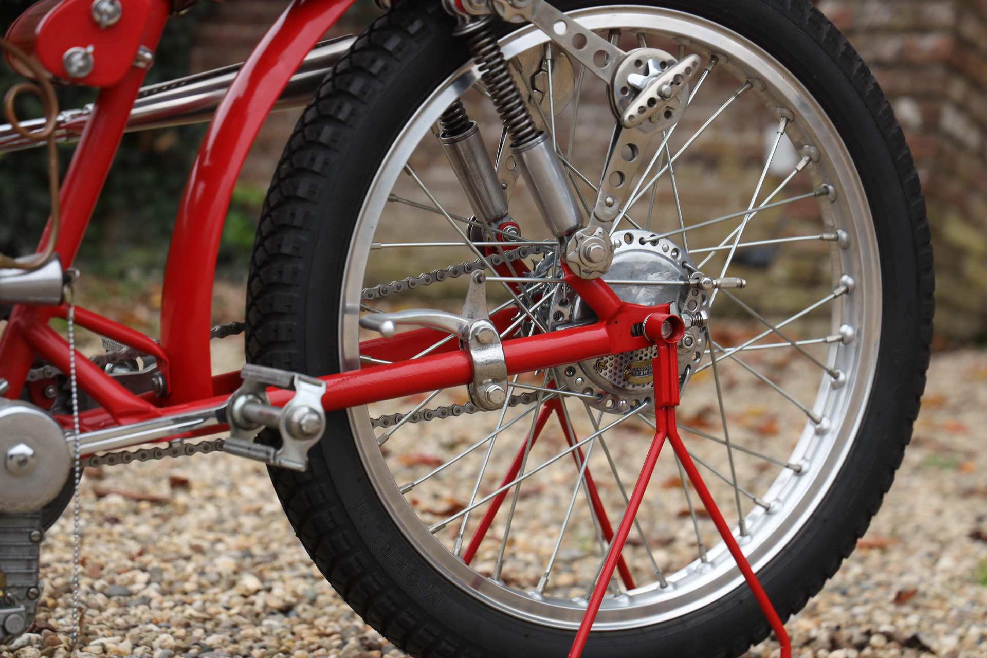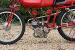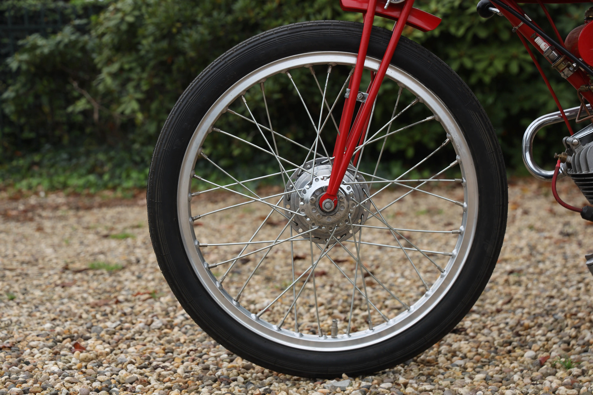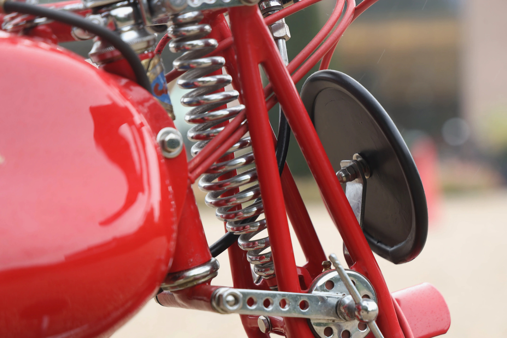 La Ducati Cucciolo T2 “Corsa” présentée ici est l’une des plus belles réalisations de la série T2. Dotée d’un numéro de moteur précoce de la série 201, elle représente un exemplaire rare, marquant la transition entre les simples bicyclettes motorisées et les premières vraies motos Ducati.