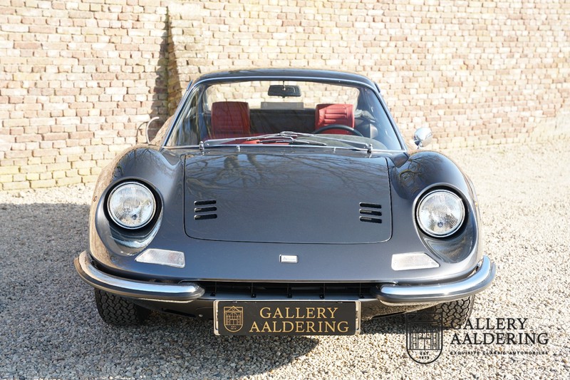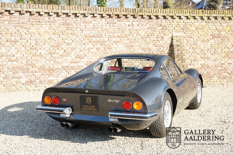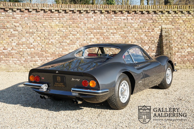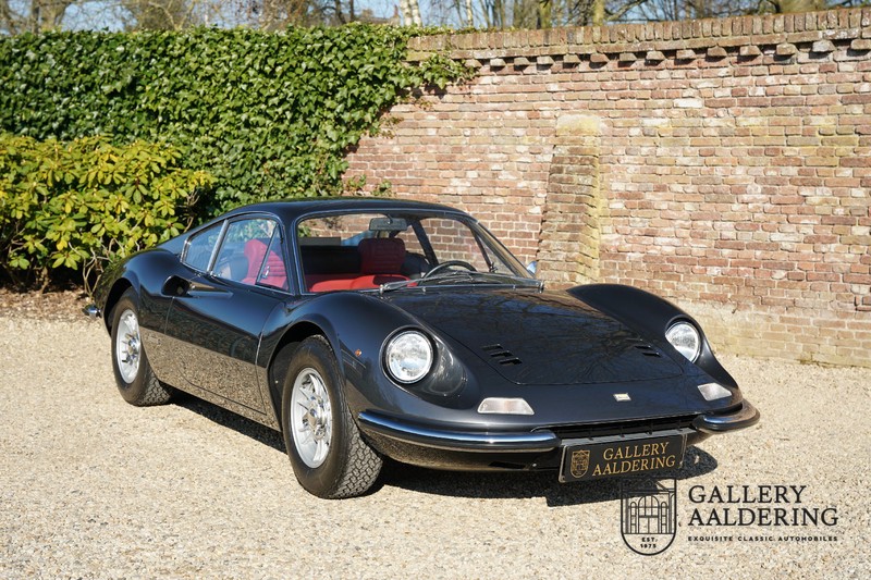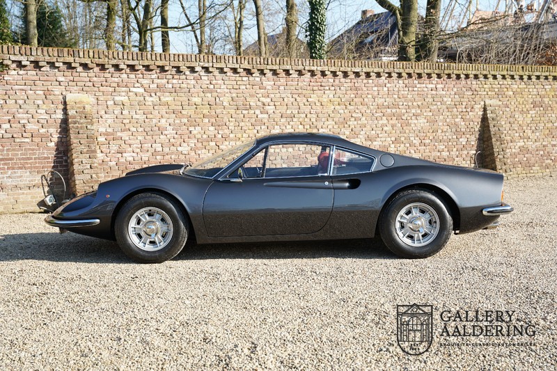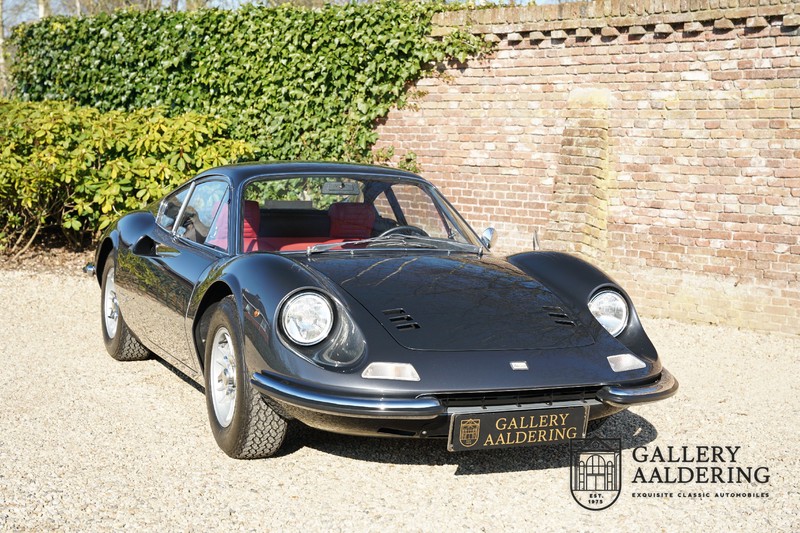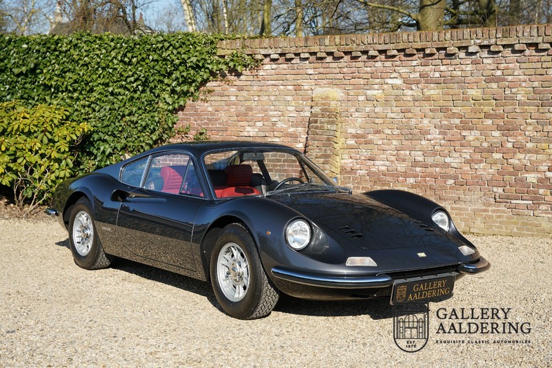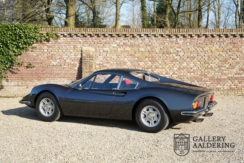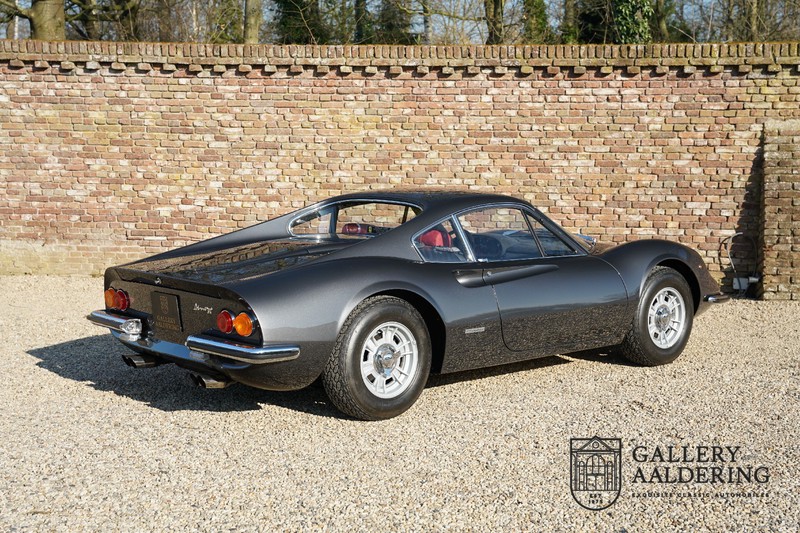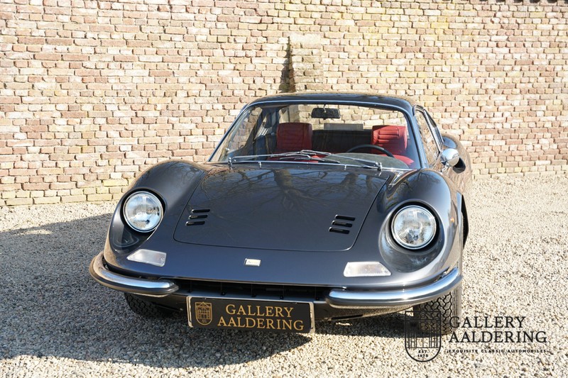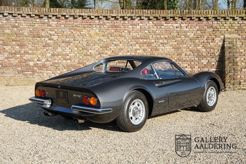 Het betreft hier een prachtige Ferrari Dino 246 GT uit 1970. De auto is in het verleden volledig gerestaureerd door de Britse Ferrari specialist Joe Macari. De auto is volledig teruggebracht tot blank metaal en ziet er dan ook nog steeds prachtig uit. De kwaliteit van de werkzaamheden spat er nog immer vanaf. De restauratiewerkzaamheden zijn prachtig gedocumenteerd middels een fotoserie en een uitgebreide ordner met informatie omtrent de auto. Het betreft hier een vroege L-Series auto met de welbekende 206 GT styling features, waaronder aluminium deuren en een aluminium motorkap. In totaal bouwde Ferrari maar 357 auto’s in deze serie. Deze Dino is nieuw geleverd in Europa en voorzien van elektrisch bedienbare ramen. De kosten voor de restauratie bedroegen destijds meer dan 150.000 Britse ponden. Deze auto is al eens toegelaten tot het uiterst prestigieuze Salon Privé event.