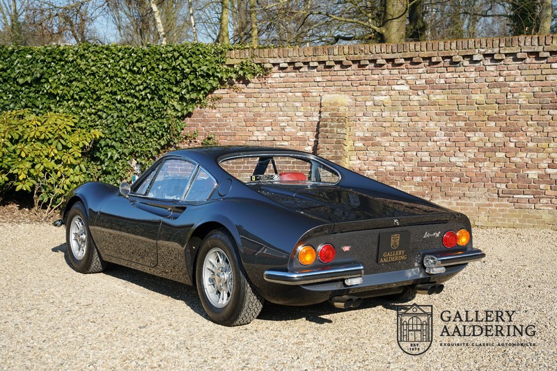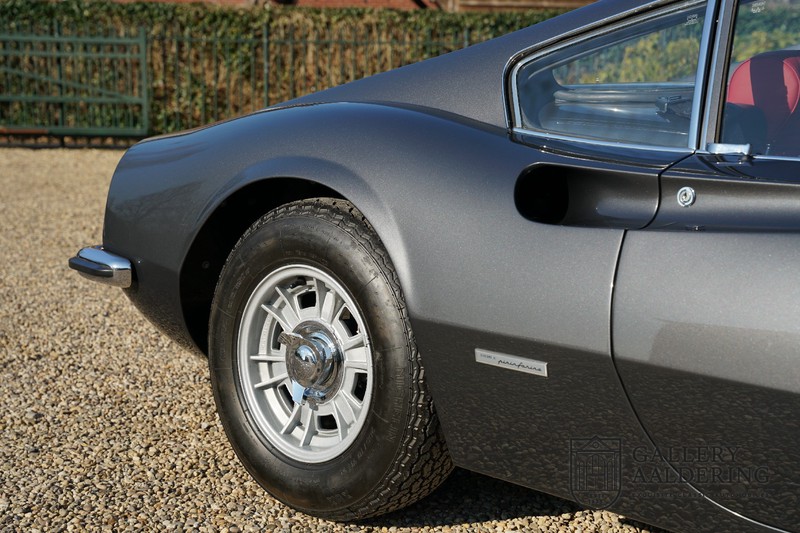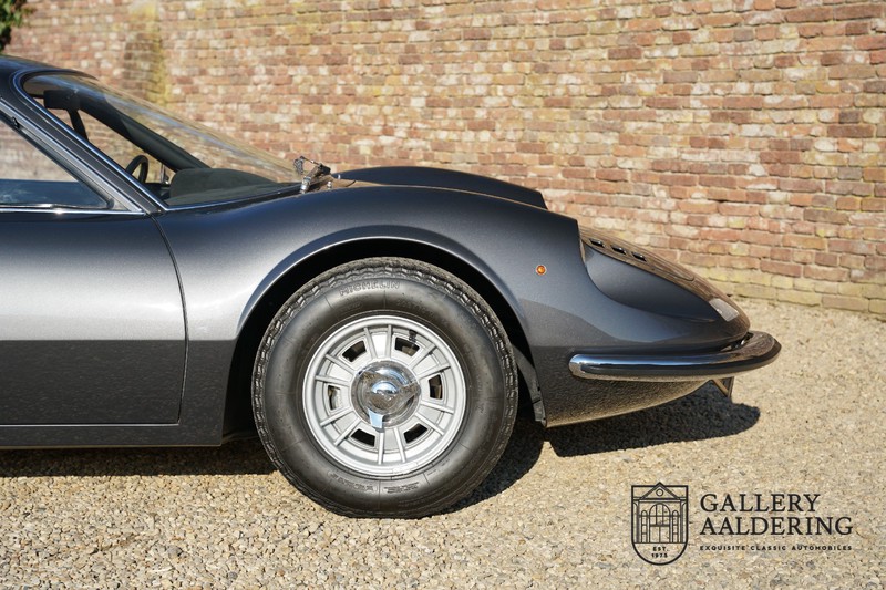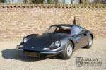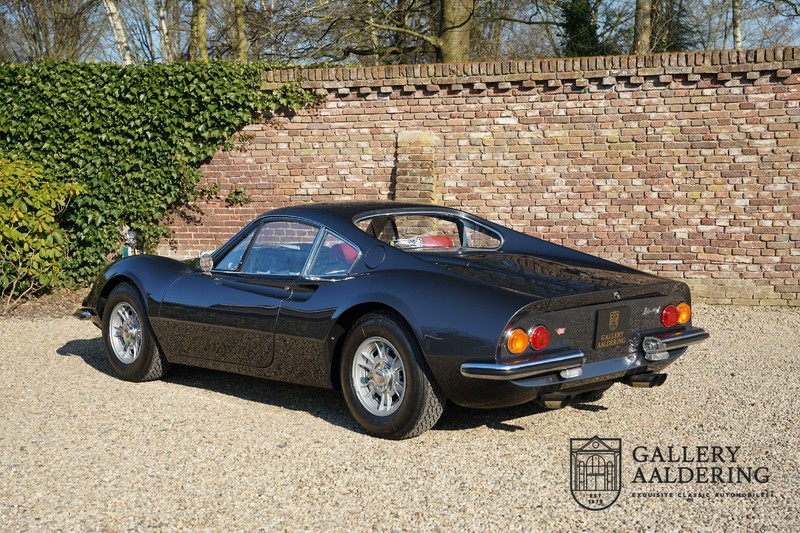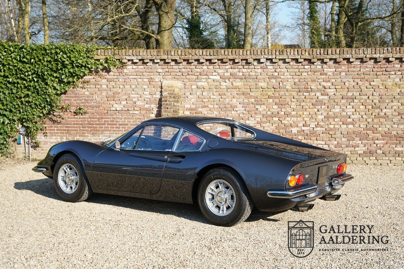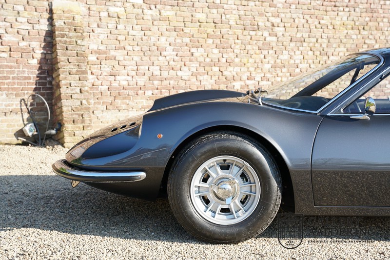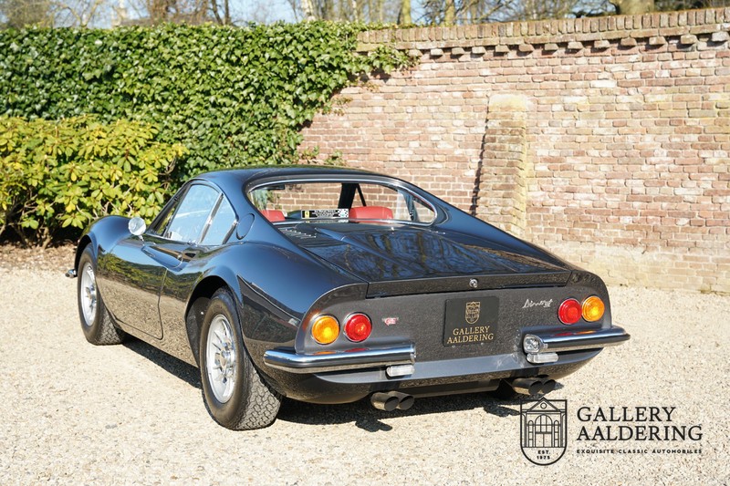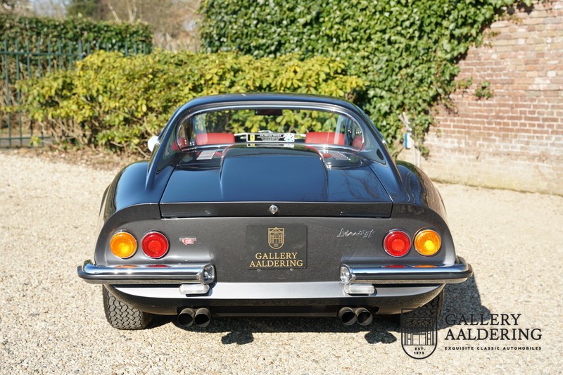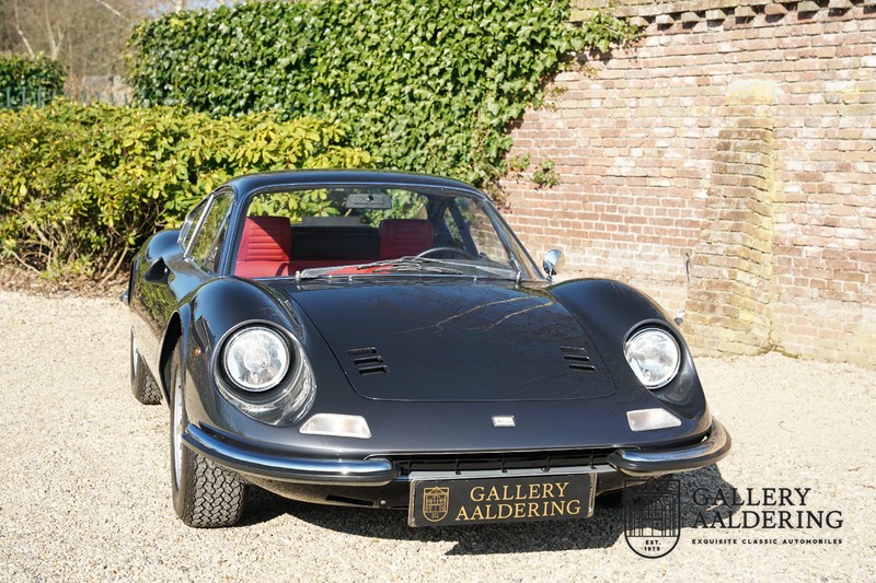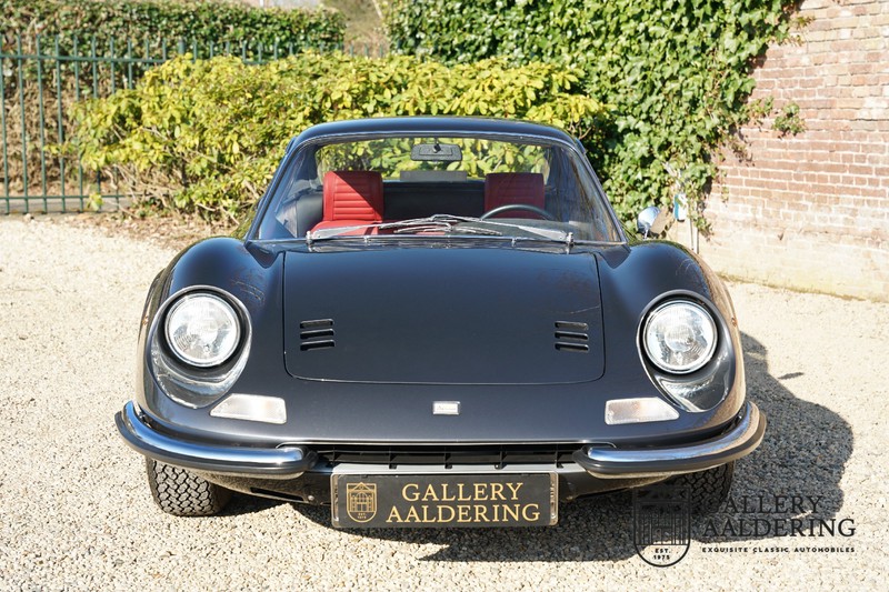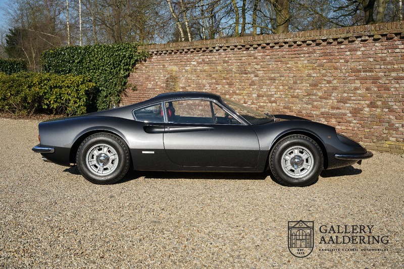 Het betreft hier een prachtige Ferrari Dino 246 GT uit 1970. De auto is in het verleden volledig gerestaureerd door de Britse Ferrari specialist Joe Macari. De auto is volledig teruggebracht tot blank metaal en ziet er dan ook nog steeds prachtig uit. De kwaliteit van de werkzaamheden spat er nog immer vanaf. De restauratiewerkzaamheden zijn prachtig gedocumenteerd middels een fotoserie en een uitgebreide ordner met informatie omtrent de auto. Het betreft hier een vroege L-Series auto met de welbekende 206 GT styling features, waaronder aluminium deuren en een aluminium motorkap. In totaal bouwde Ferrari maar 357 auto’s in deze serie. Deze Dino is nieuw geleverd in Europa en voorzien van elektrisch bedienbare ramen. De kosten voor de restauratie bedroegen destijds meer dan 150.000 Britse ponden. Deze auto is al eens toegelaten tot het uiterst prestigieuze Salon Privé event.