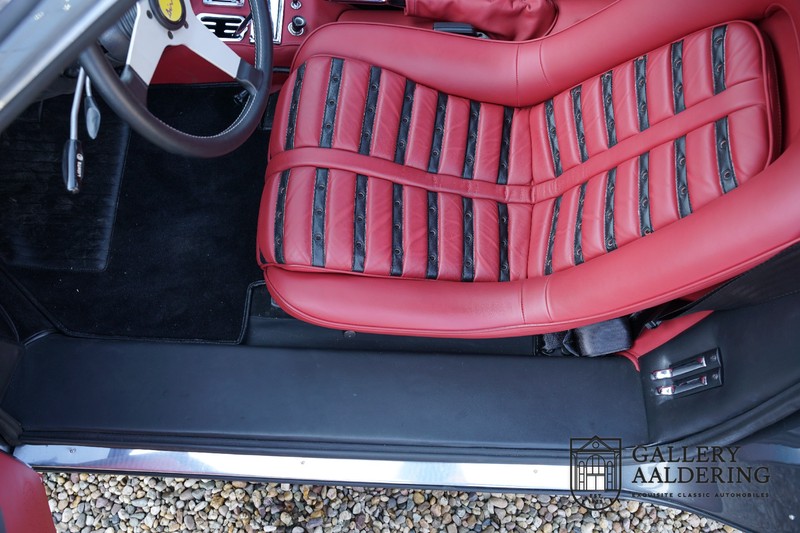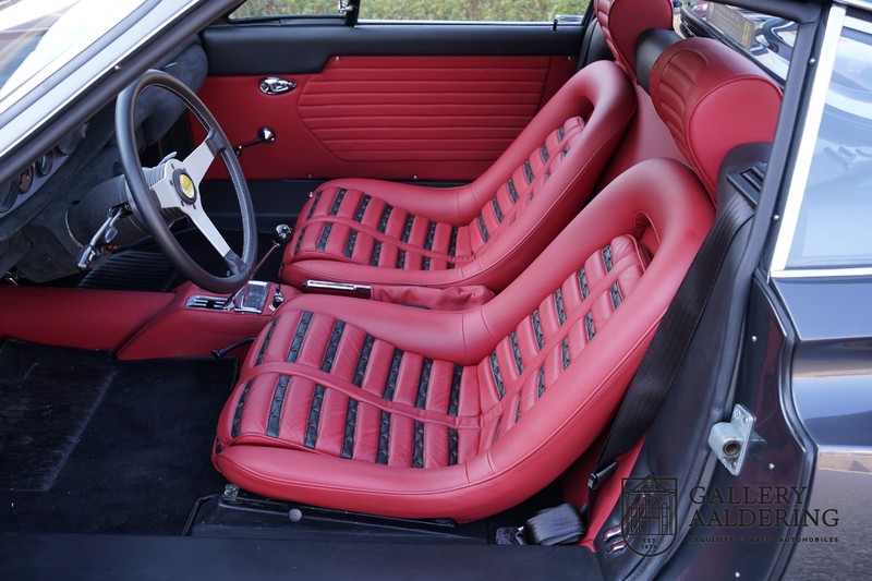 Das Interieur des Dino wurde natürlich komplett neu bezogen. Auch hier wurde auf sehr hohem Niveau gearbeitet, mit einem wunderbaren Ergebnis. Die Daytona-Sitze sind mit schönem rotem und schwarzem Leder bezogen. Das Leder sieht fantastisch aus und ist in nahezu neuwertigem Zustand. Die Teppiche sind ebenfalls in sehr gutem Zustand und haben einen tadellosen Passform. Die Instrumente und Bedienelemente funktionieren alle einwandfrei und sehen sehr schön aus. Der Dachhimmel wurde damals auch erneuert und sieht dementsprechend wunderschön aus.