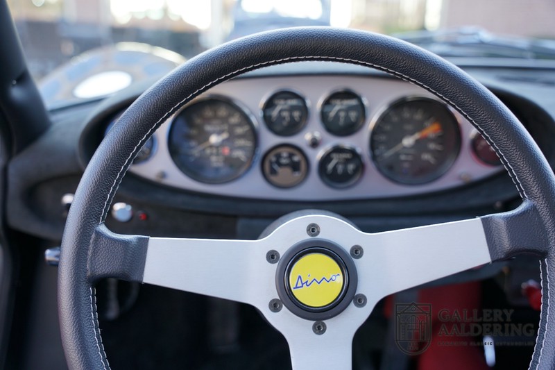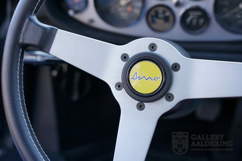 Die Technik wurde bereits komplett revidiert. Damit meinen wir nicht nur Motor und Getriebe, sondern das gesamte Fahrwerk. Alle Querlenker wurden bei der Restaurierung demontiert und sandgestrahlt und mit neuen Gummis versehen. Die Bremsen wurden komplett überholt und die Stoßdämpfer und Federn erneuert. Kurz gesagt, eine Überholung des reinsten Wassers. Der Dino fährt genauso, wie man es erwarten darf. Der Motor läuft wunderbar und hat viel Durchzugskraft im mittleren Bereich. Das Getriebe lässt sich präzise bedienen und hat angenehm gewählte Übersetzungen, die gut zur sportlichen Ausrichtung dieses Autos passen. Zum großen Fahrspaß trägt auch die Art und Weise bei, wie Motor und Getriebe im Auto positioniert sind. Der Motor wurde nämlich genau hinter der Trennwand positioniert. Wenn mal richtig beschleunigt wird und die Weber-Vergaser sich mit einem Gemisch aus Luft und Benzin vollsaugen, weiß man nicht, was für ein Erlebnis man durchmacht.