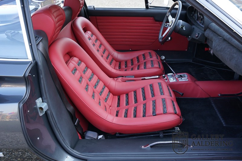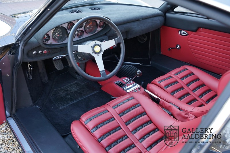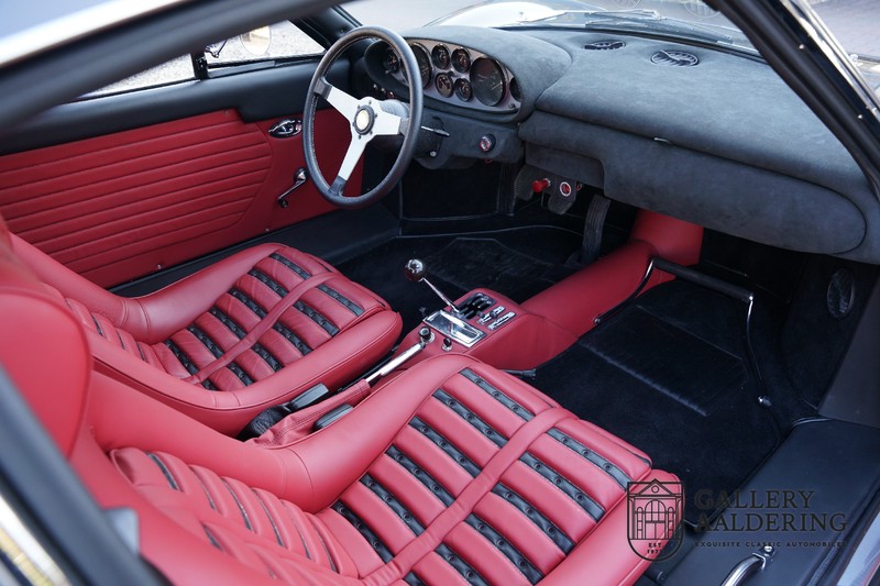 Het interieur van de Dino is vanzelfsprekend volledig opnieuw bekleed. Ook hier zijn de werkzaamheden weer op zeer hoog niveau uitgevoerd met een prachtig resultaat tot gevolg. De Daytona seats zijn bekleed met fraai rood en zwart leder. Het leder ziet er fantastisch uit en is vrijwel in nieuwstaat verkerend. De tapijten zijn eveneens in zeer goede staat met onberispelijke pasvorm. De instrumenten en bedieningselementen functioneren allen zoals het hoort en zien er prachtig uit. Ook de hemelbekleding is destijds vervangen en ziet er uit om door een ringetje te halen.
