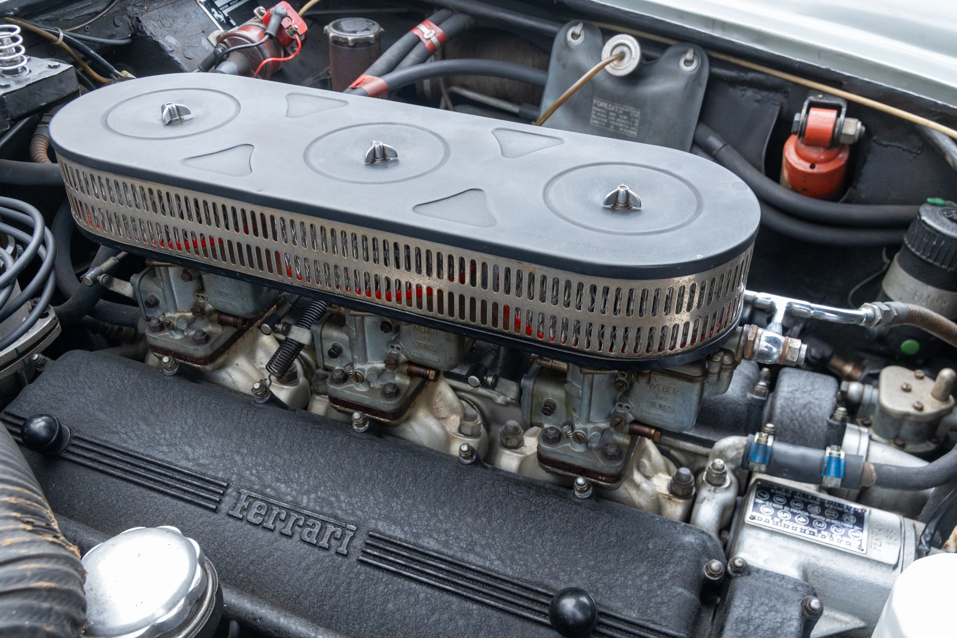 Slechts 165 SWB Berlinetta’s zijn er gebouwd. In staal en aluminium. Dit exemplaar behoort tot de stalen uitvoeringen: de meer verfijnde, veelzijdige variant, bedoeld voor wie prestaties wilde zonder concessies aan gebruik. Onder de carrosserie van Scaglietti ligt de befaamde Colombo V12 van 2.953 cc. Drie Weber 36 DCS carburateurs, circa 240 pk bij 7.000 toeren, gekoppeld aan een handgeschakelde vierversnellingsbak. Mechaniek in zijn puurste vorm. Geen uitleg nodig.