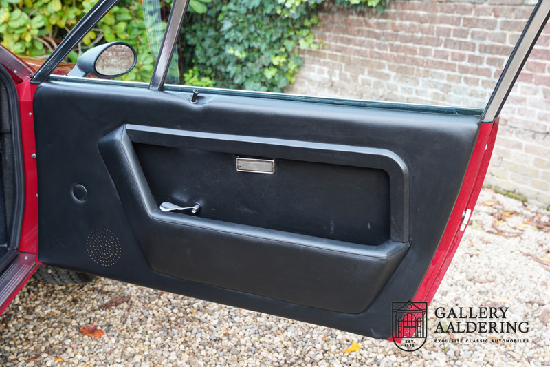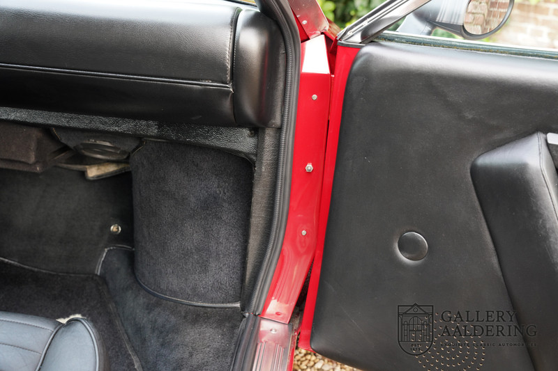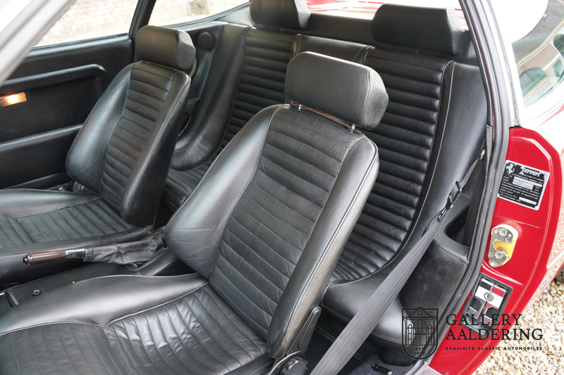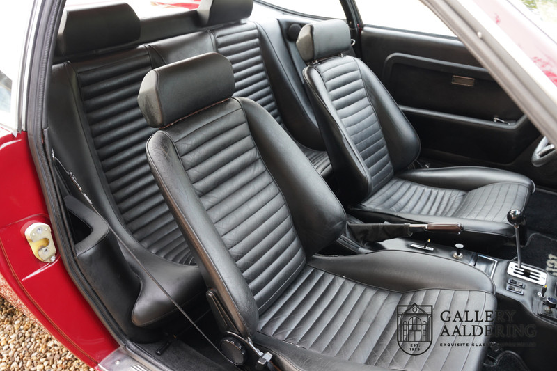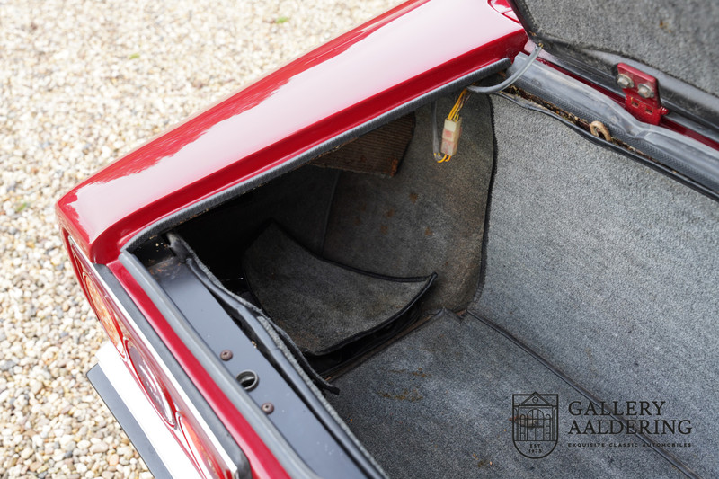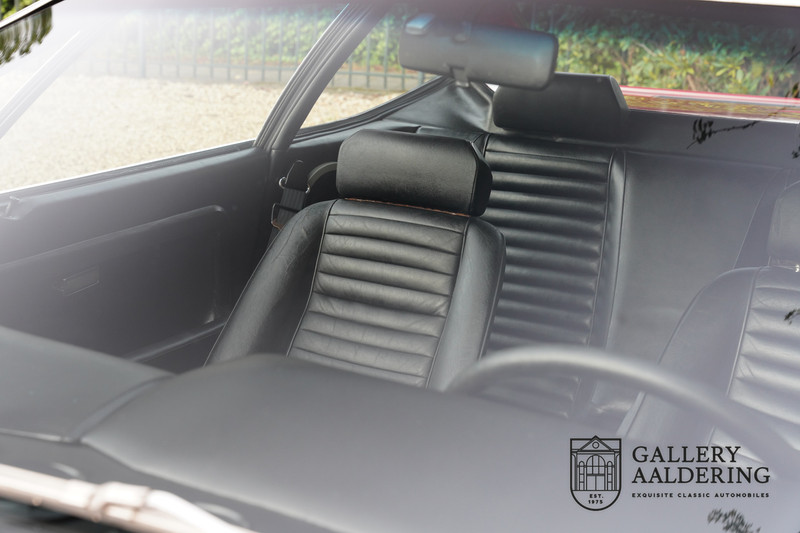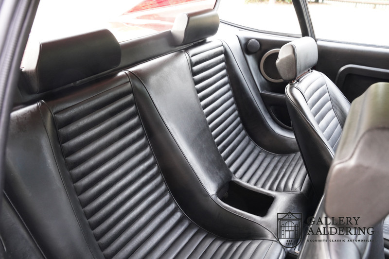 A look into the interior provides more pleasant surprises. The upholstery is largely original and in beautiful condition, with the black leather upholstery combining beautifully with the dark red exterior. The condition of the upholstery is beautiful, which also applies to the headliner and the black carpets. The chairs are just as good as they look. The rear seat is like new and offers space for smaller people.