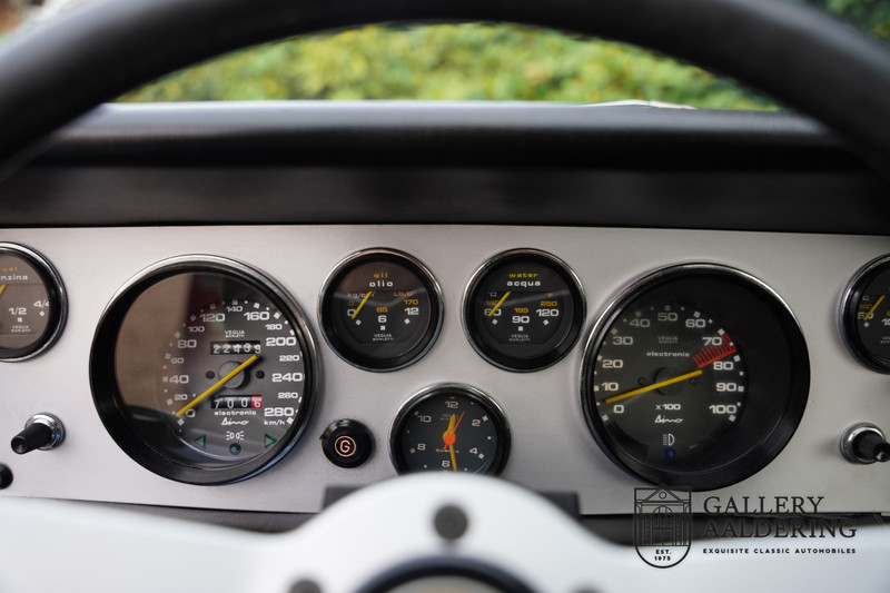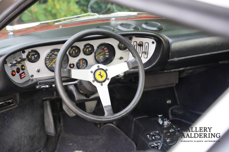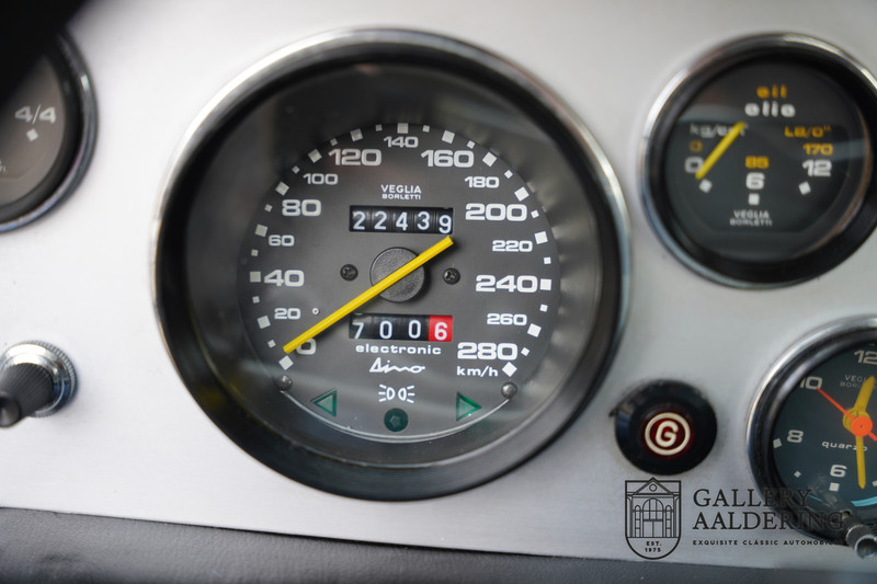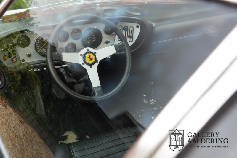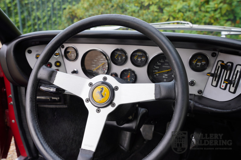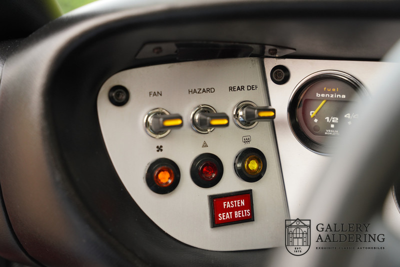 Het dashboard is volledig functioneel en bovendien zeer fraai met alle meters en instrumenten. Ook de bedieningselementen werken naar behoren, waarbij een groot deel is ondergebracht op het dashboard en een deel, dat Ferrari daar niet meer kwijtraakte, in de middentunnel. Daar is ook de origineel fabrieks-af geleverde Borletti airconditioning te vinden.
