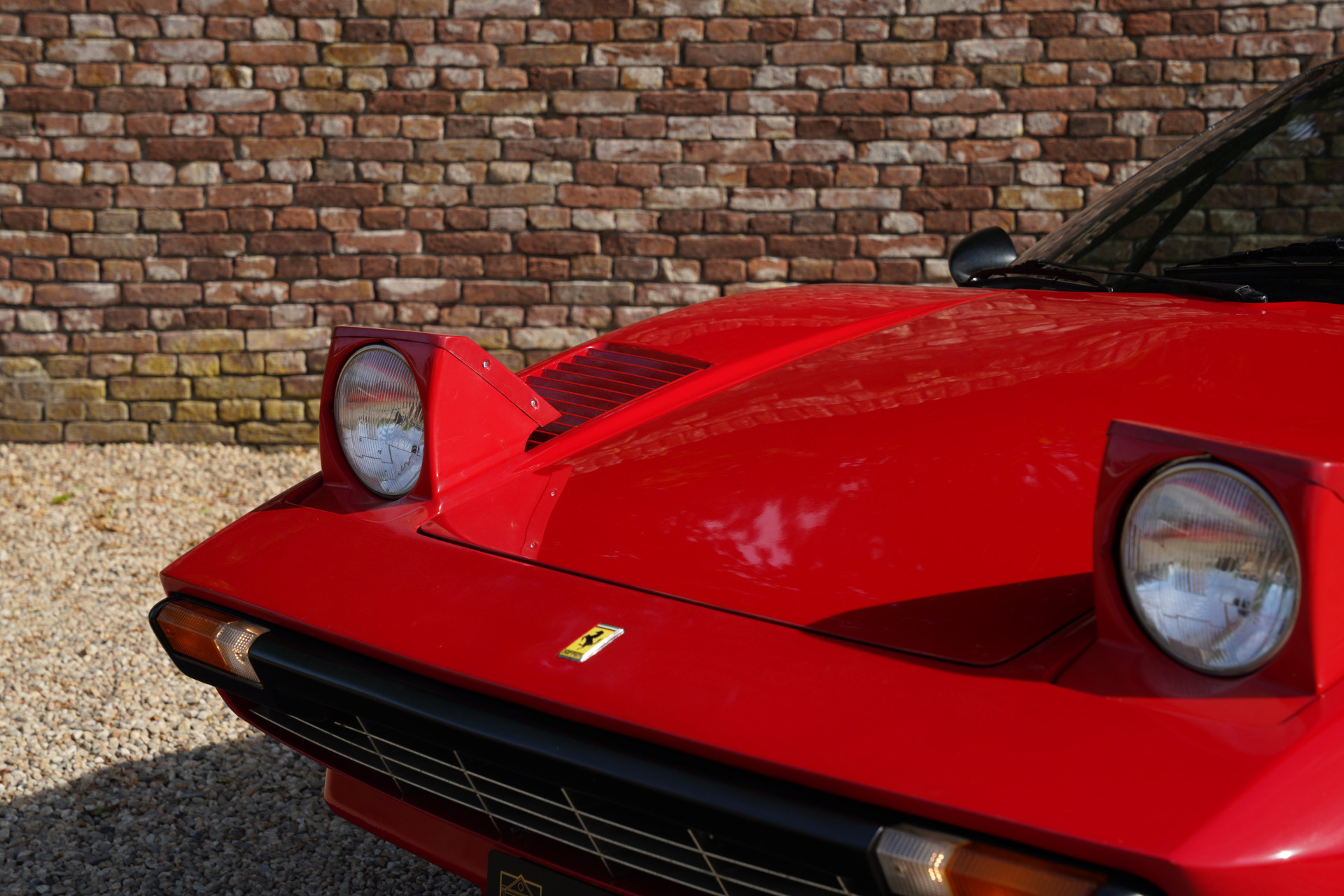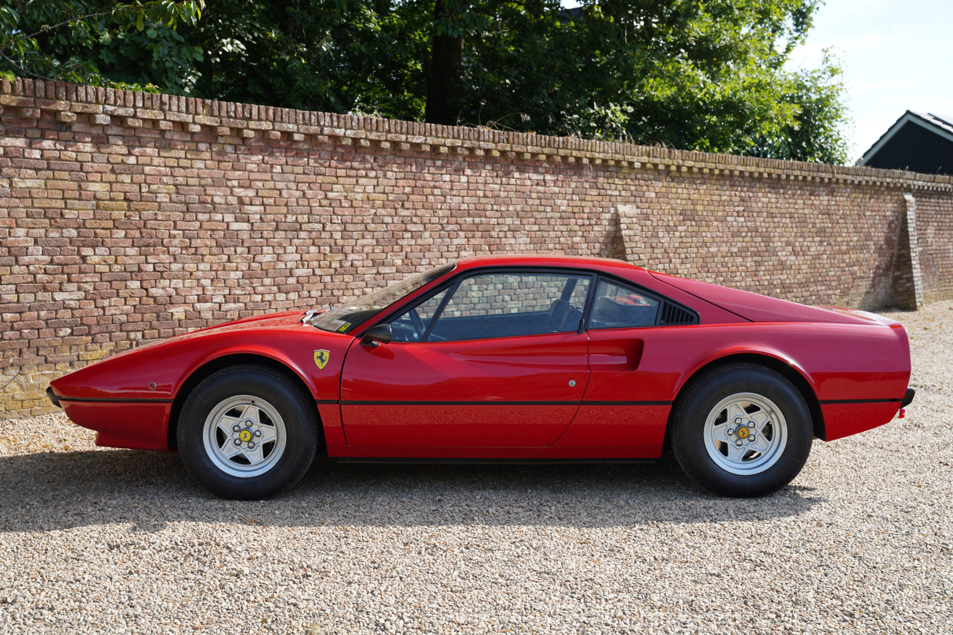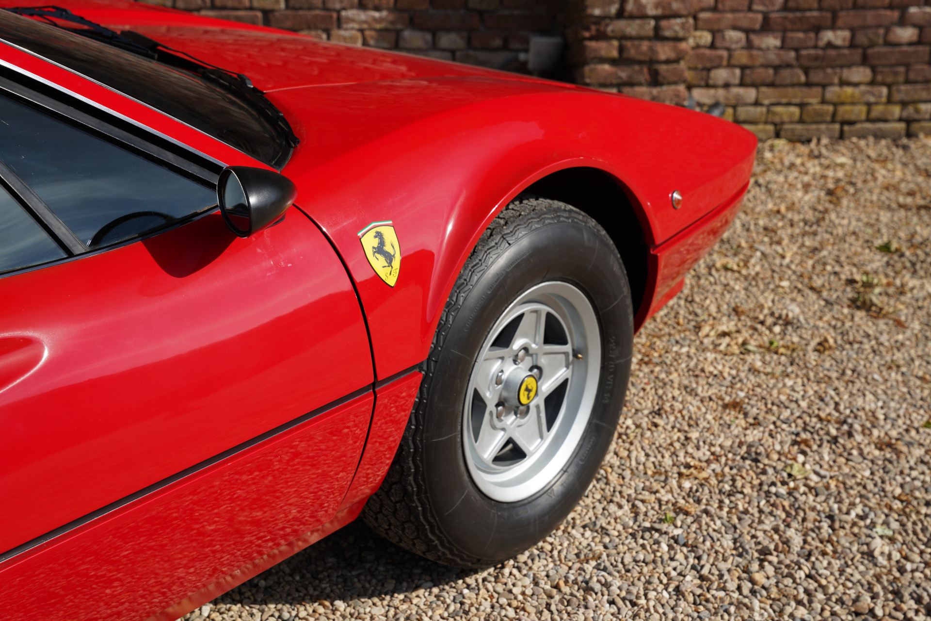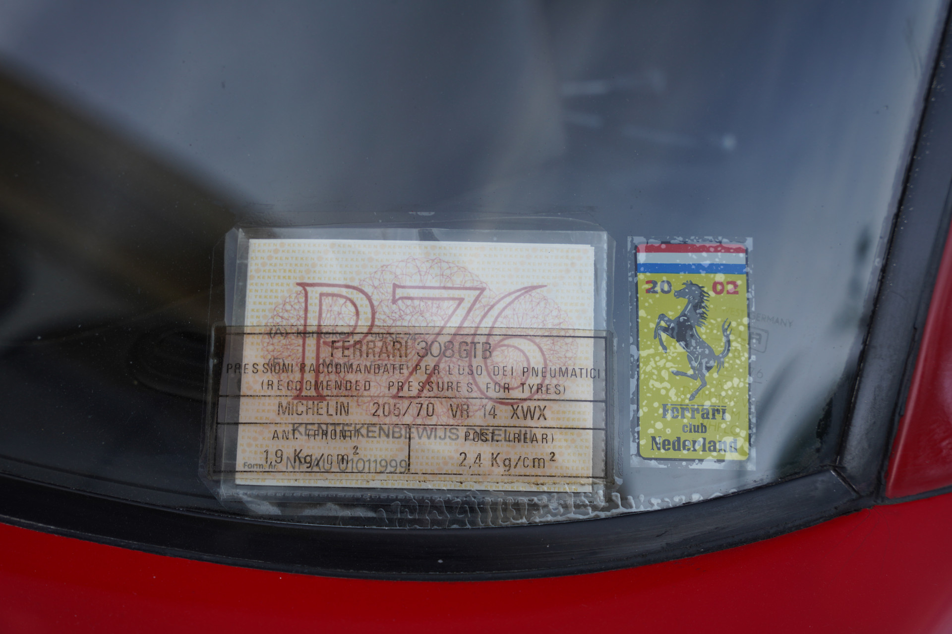 This EU Ferrari 308 Vetroresina was built in 1976 and has an uninterrupted original first (!) license plate registration and the associated authentic first papers. A copy of part 3 behind the windshield and the last MOT sticker on the original old license plate also testify to a piece of uniquely preserved history. This matching numbers Ferrari was delivered new by Kroymans Ferrari and even still has the original dealer tag on the back.