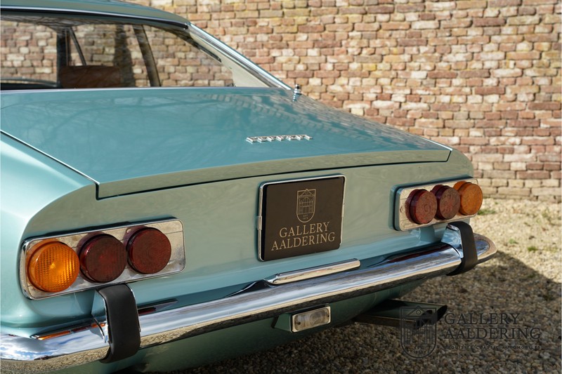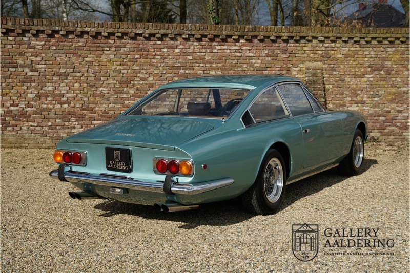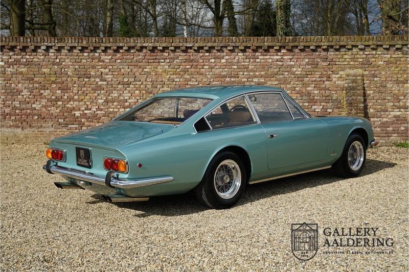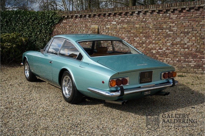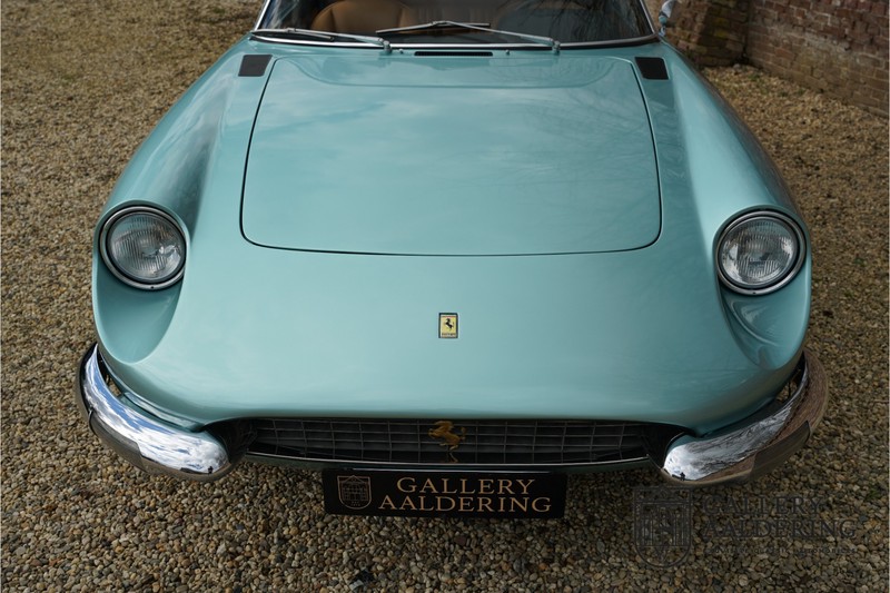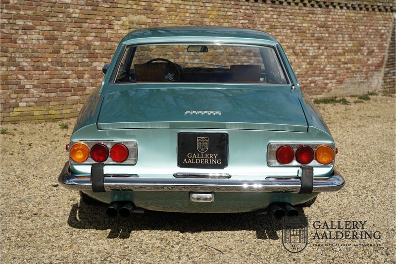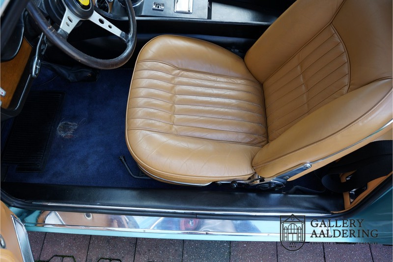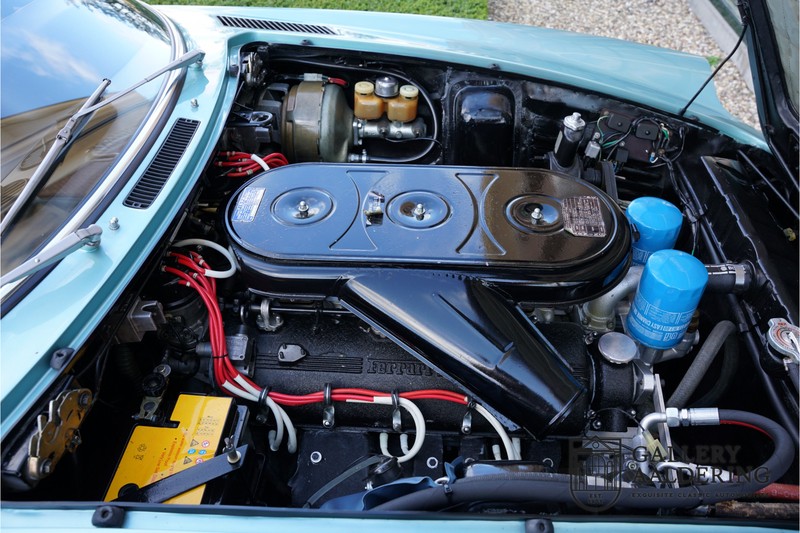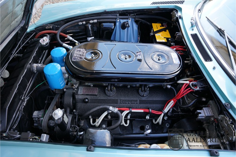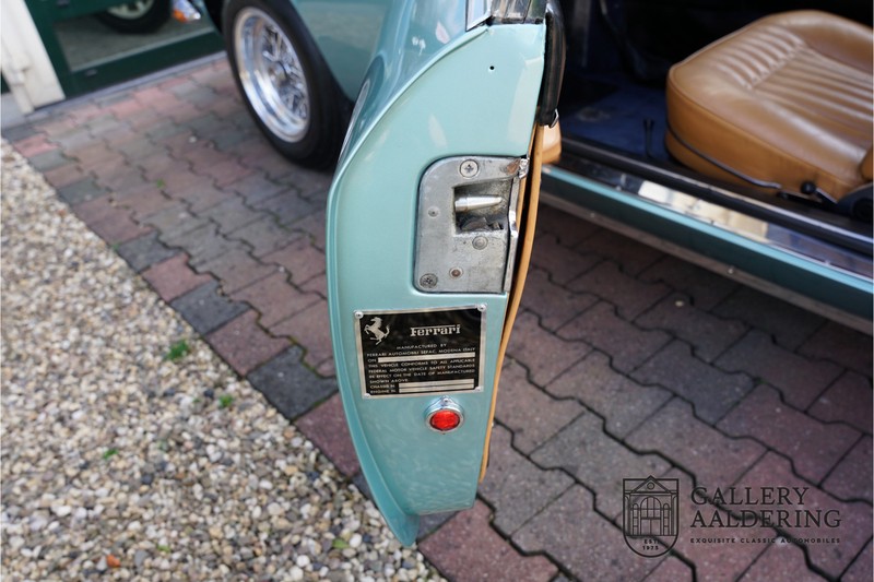 Dit “Verde Medio” exemplaar werd in 1969 voor het eerst toegelaten tot het verkeer in de Verenigde Staten. De auto heeft nog maar 37.500 miles gereden en verkeert in zeer originele conditie. De carrosserie verkeert in goede staat met fraai plaatwerk en correcte passingen. De Verde Medio lak staat de auto fantastische en accentueert de fraaie, door Pininfarina getekende, lijnen. De lak en de chromen sierlijsten zijn beide in originele verzorgde staat. De auto staat op prachtige Borrani wielen met banden in de correcte maten. Het interieur is bekleed met prachtige blauwe tapijten en “Tan” leder. Het leder heeft een fraai patina ontwikkeld en is in goede staat. De Veglia instrumtenten functioneren allemaal uitstekend en zien er fantastisch uit. Wanneer u plaatsneemt achter het stuur valt direct op hoe heerlijk overzichtelijk oudere auto’s zijn. Het interieur oogt daardoor nog ruimer dan dat het is. De auto staat bekend als 2+2 maar biedt ruim plaats aan vier personen.