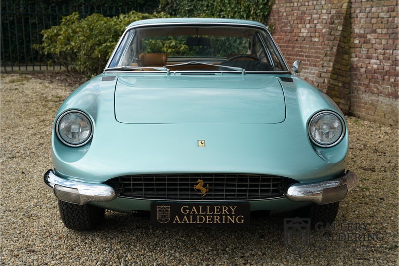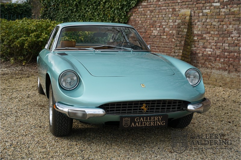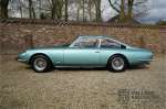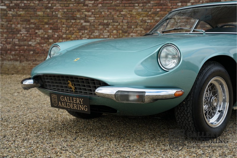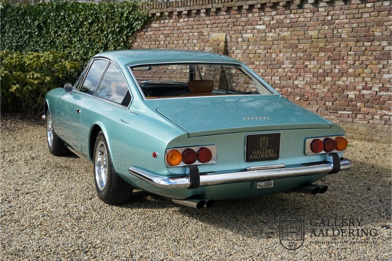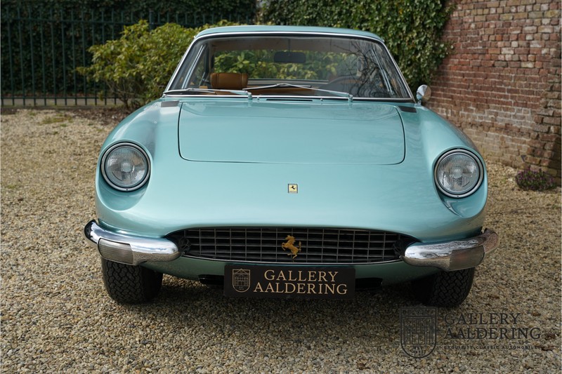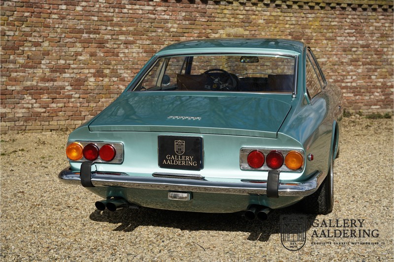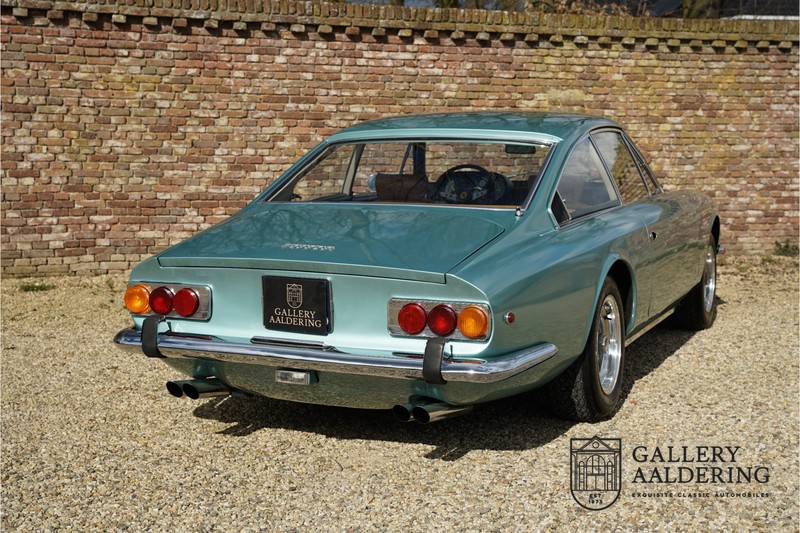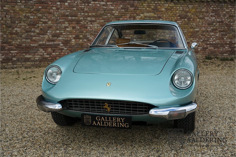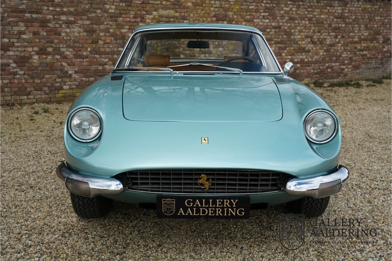 Dit “Verde Medio” exemplaar werd in 1969 voor het eerst toegelaten tot het verkeer in de Verenigde Staten. De auto heeft nog maar 37.500 miles gereden en verkeert in zeer originele conditie. De carrosserie verkeert in goede staat met fraai plaatwerk en correcte passingen. De Verde Medio lak staat de auto fantastische en accentueert de fraaie, door Pininfarina getekende, lijnen. De lak en de chromen sierlijsten zijn beide in originele verzorgde staat. De auto staat op prachtige Borrani wielen met banden in de correcte maten. Het interieur is bekleed met prachtige blauwe tapijten en “Tan” leder. Het leder heeft een fraai patina ontwikkeld en is in goede staat. De Veglia instrumtenten functioneren allemaal uitstekend en zien er fantastisch uit. Wanneer u plaatsneemt achter het stuur valt direct op hoe heerlijk overzichtelijk oudere auto’s zijn. Het interieur oogt daardoor nog ruimer dan dat het is. De auto staat bekend als 2+2 maar biedt ruim plaats aan vier personen.