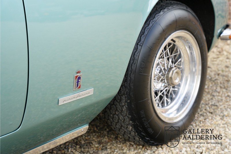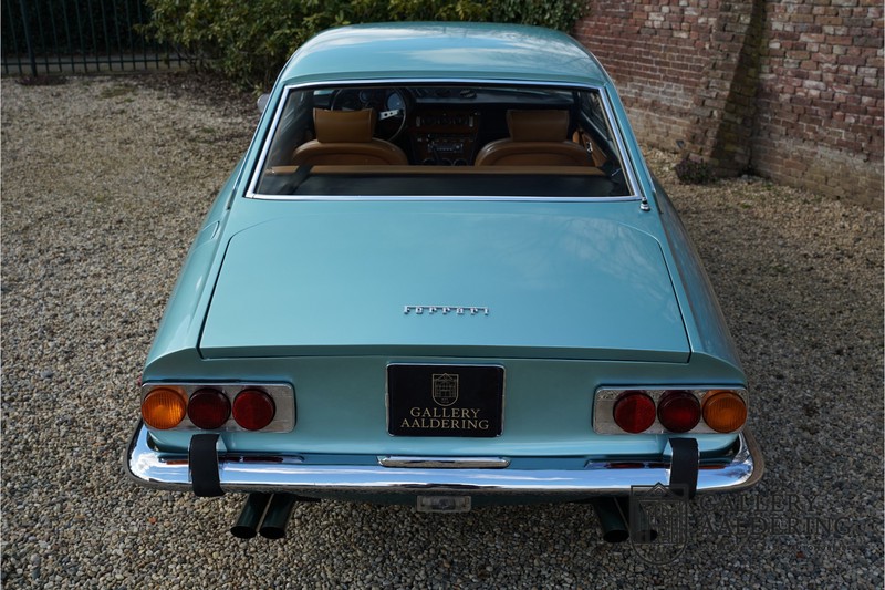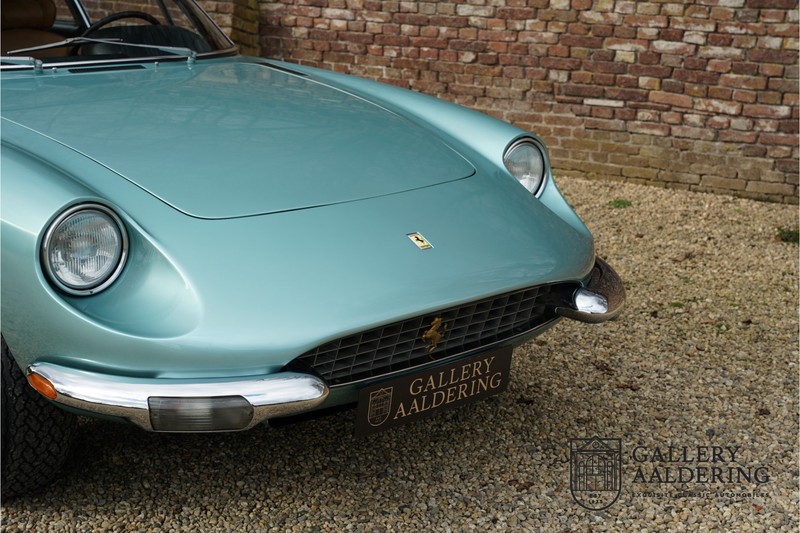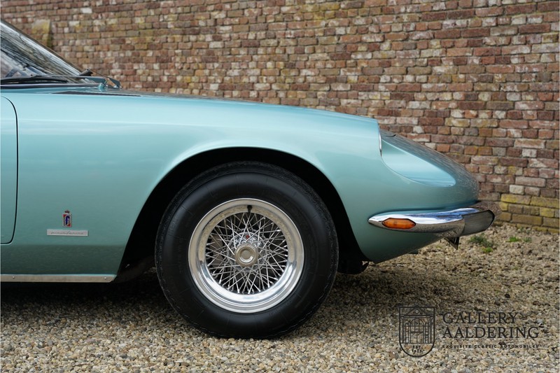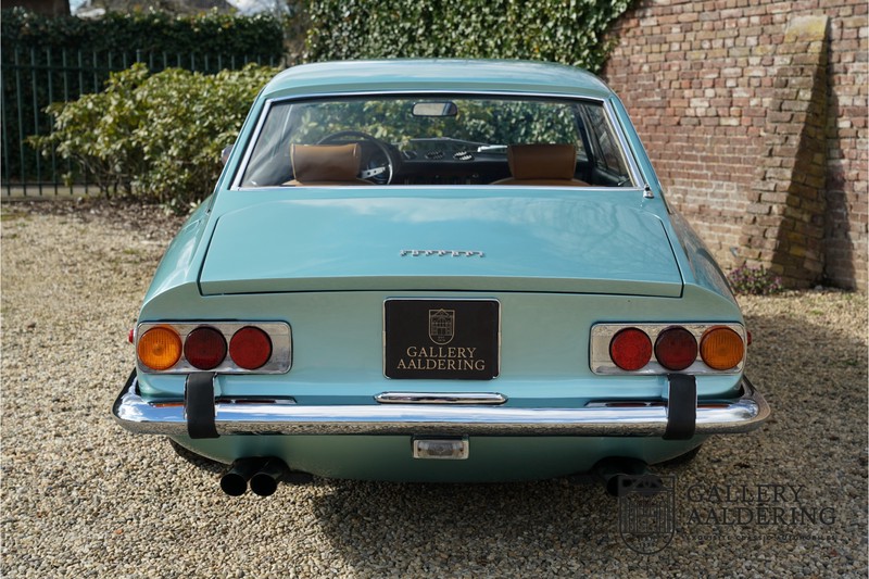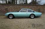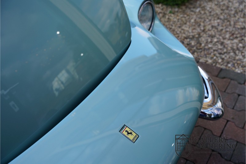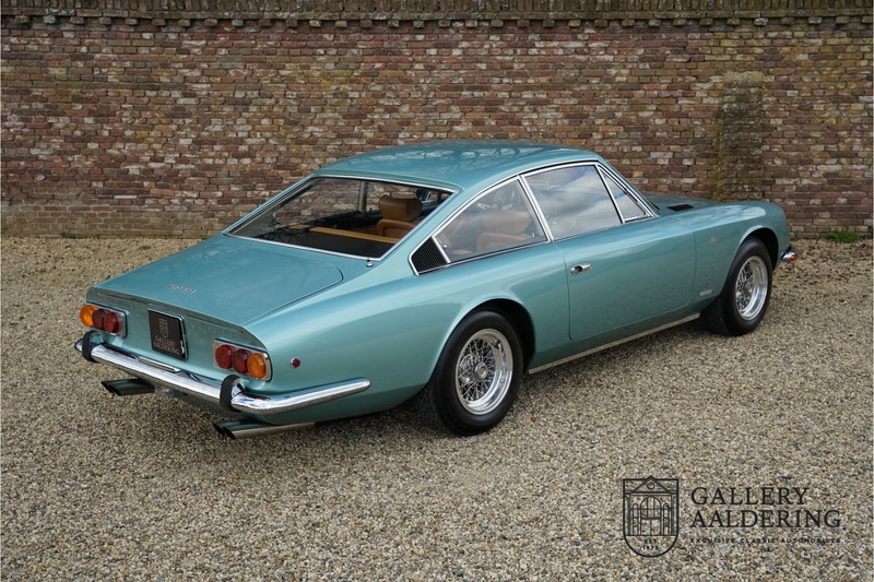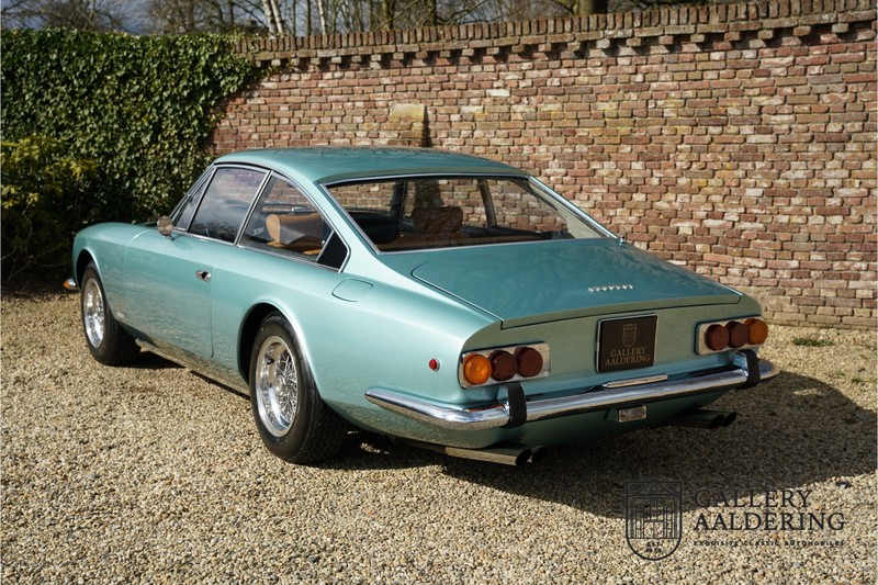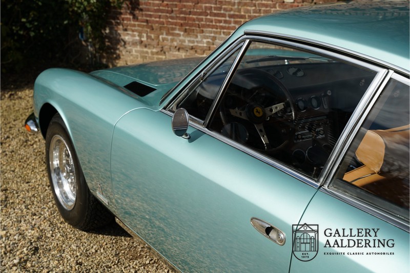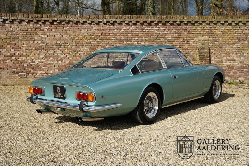 Dit “Verde Medio” exemplaar werd in 1969 voor het eerst toegelaten tot het verkeer in de Verenigde Staten. De auto heeft nog maar 37.500 miles gereden en verkeert in zeer originele conditie. De carrosserie verkeert in goede staat met fraai plaatwerk en correcte passingen. De Verde Medio lak staat de auto fantastische en accentueert de fraaie, door Pininfarina getekende, lijnen. De lak en de chromen sierlijsten zijn beide in originele verzorgde staat. De auto staat op prachtige Borrani wielen met banden in de correcte maten. Het interieur is bekleed met prachtige blauwe tapijten en “Tan” leder. Het leder heeft een fraai patina ontwikkeld en is in goede staat. De Veglia instrumtenten functioneren allemaal uitstekend en zien er fantastisch uit. Wanneer u plaatsneemt achter het stuur valt direct op hoe heerlijk overzichtelijk oudere auto’s zijn. Het interieur oogt daardoor nog ruimer dan dat het is. De auto staat bekend als 2+2 maar biedt ruim plaats aan vier personen.