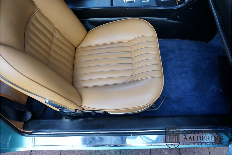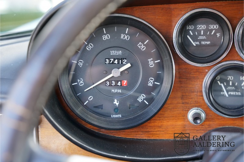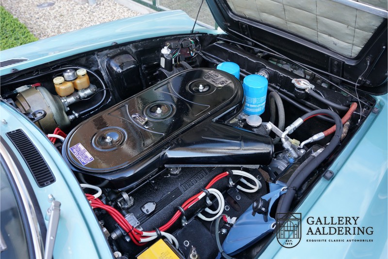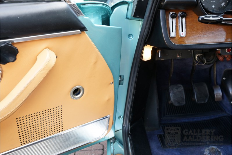 This “Verde Medio” example was first registered in the States in 1969. Since then she has only clocked up 37,500 miles and remains in original condition. The fine bodywork exhibits good and correctly aligned panelwork. The Verde Medio paintwork suits the car down to a tee, accentuating those gorgeous Pininfarina sculpted lines. The paintwork and brightwork are all original and is well cared for condition. The car stands proudly on Borrani rims with correctly sized tyres. The interior trim consists of lovely blue carpets and “Tan” leather. The leather has developed a lovely patina over the years and is in good shape. The Veglia instruments look great and are all in excellent working order.