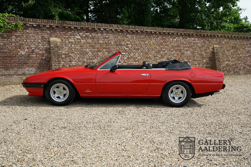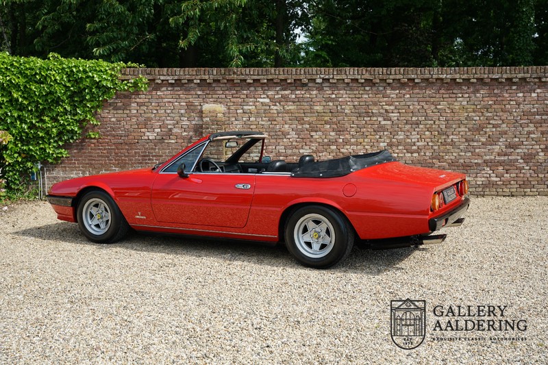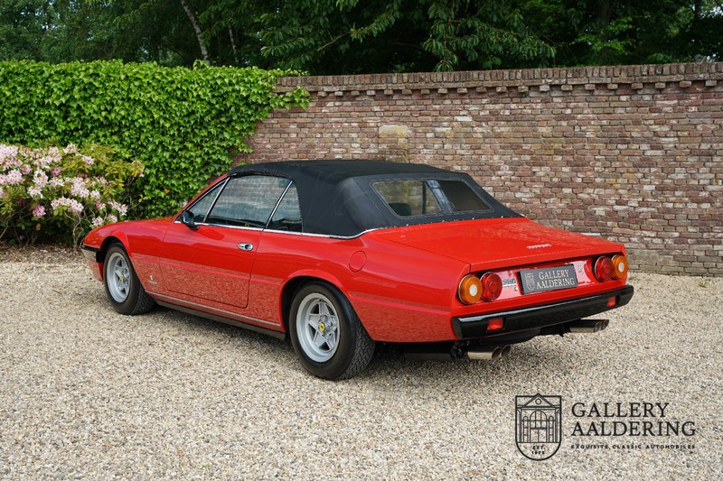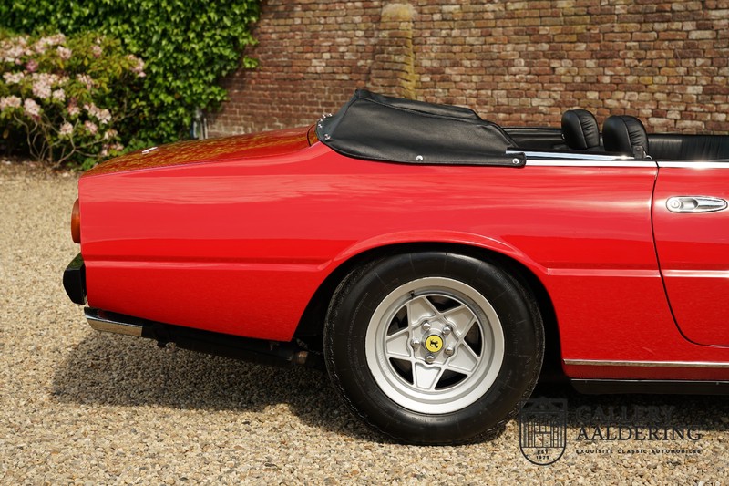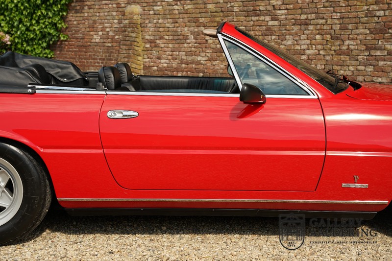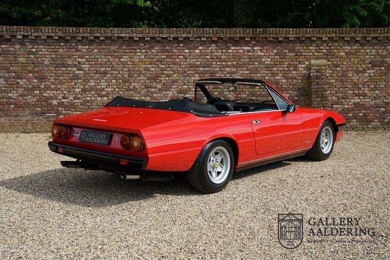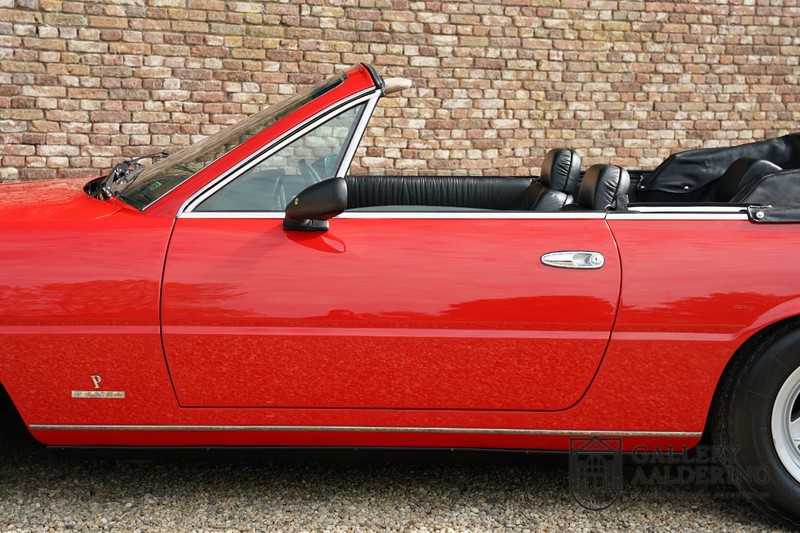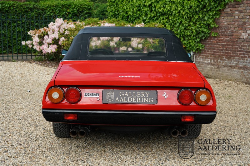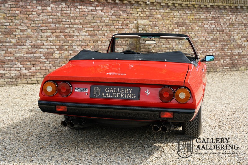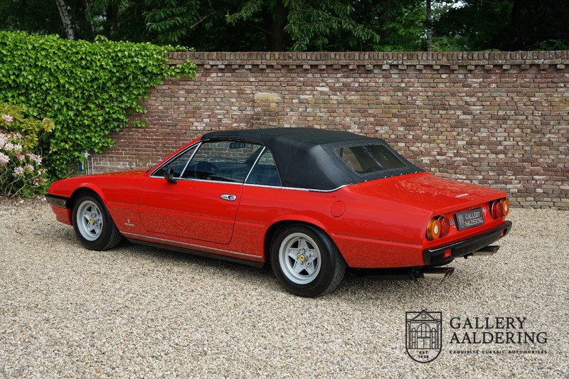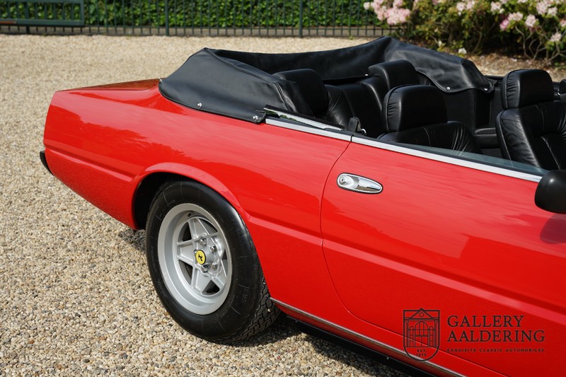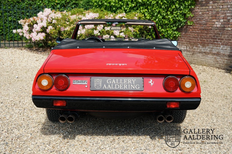 Deze Ferrari 400i werd kort na aanschaf naar Pavesi gebracht om te worden omgebouwd naar cabriolet. Pavesi maakte van allerlei auto’s cabrioletversies maar dit model gaf hem de meeste naamsbekendheid. Dit exemplaar verkeert in zeer originele conditie. De auto is uitgevoerd met een Rosso Corsa exterieur en een met zwart leder bekleed interieur en zwarte cabrioletkap. De lak is omwille van cosmetische redenen al eens opnieuw gespoten en verkeert, afgezien van wat hele lichte gebruikerssporen, in goede conditie. Het plaatwerk is mooi origineel en heeft correcte passingen. De cabrioletkap sluit overal mooi aan en is in goede conditie. Vanzelfsprekend is er een tonneau cover aanwezig voor op de dagen dat u volledig open kunt rijden.