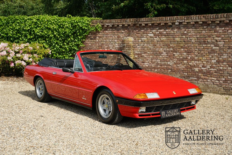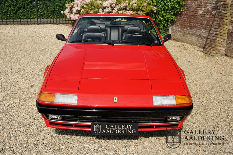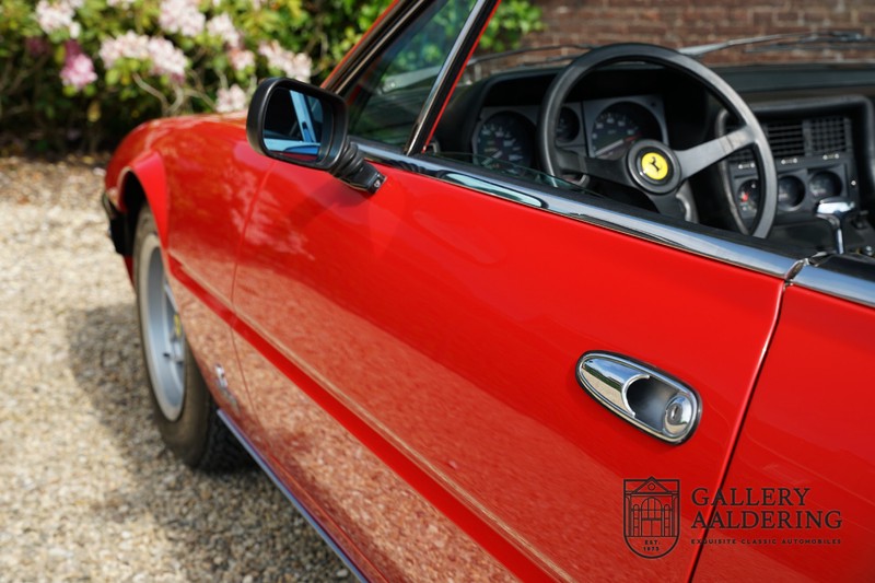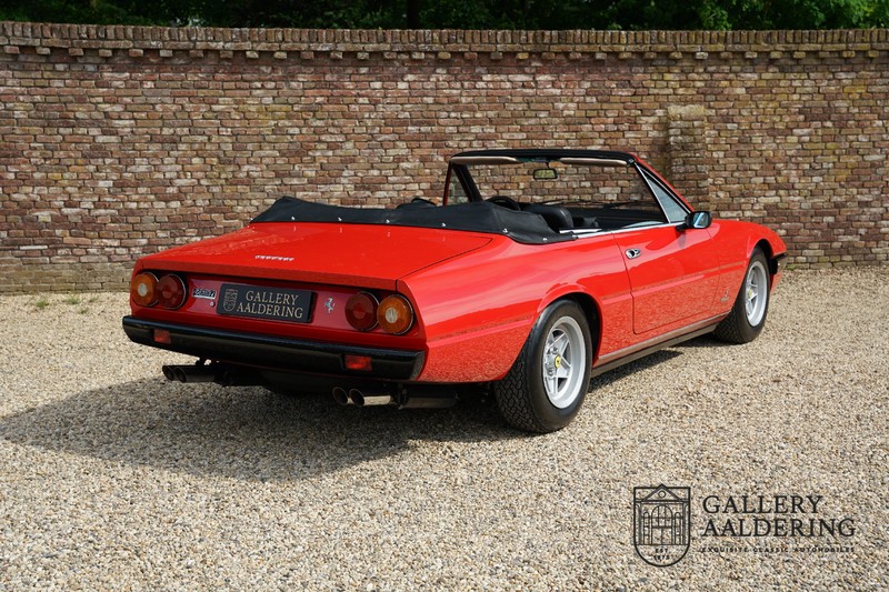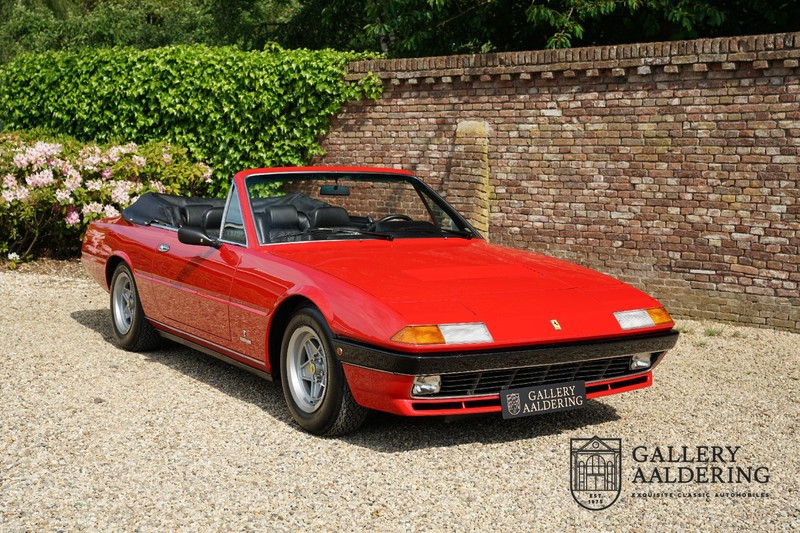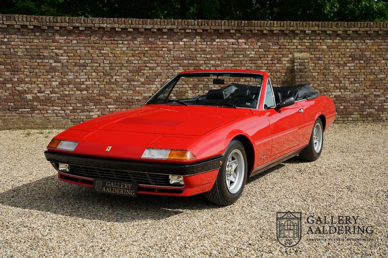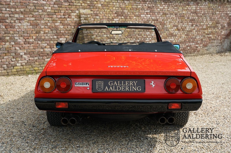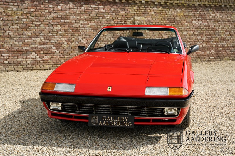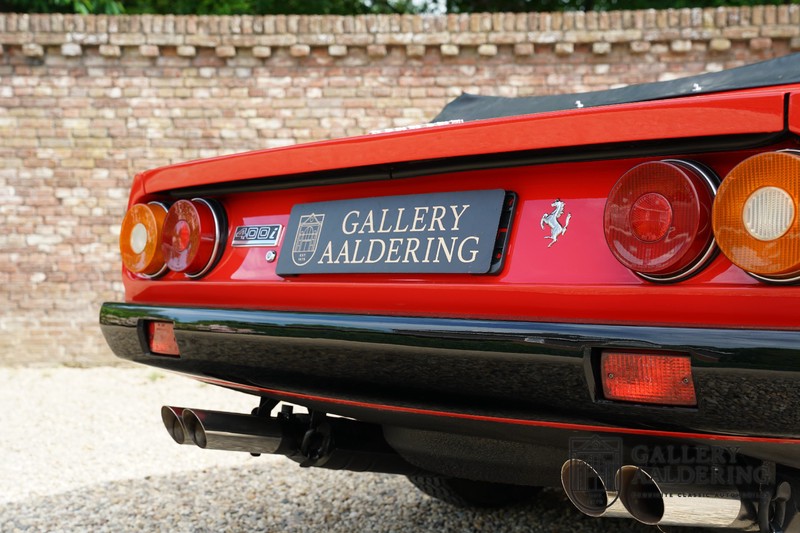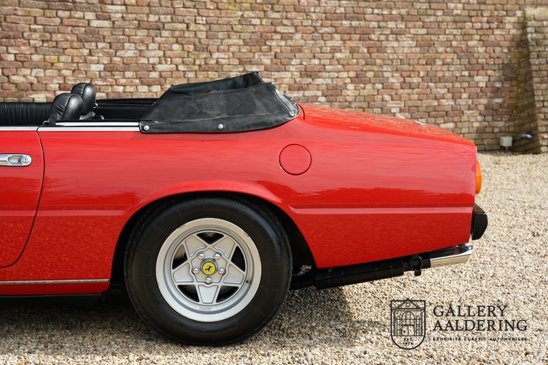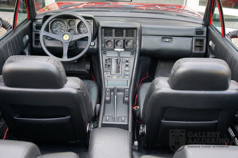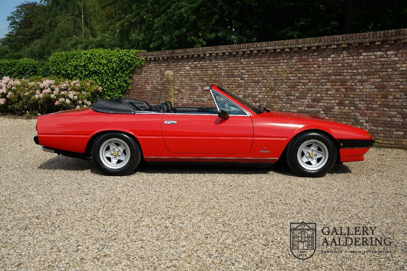 Deze Ferrari 400i werd kort na aanschaf naar Pavesi gebracht om te worden omgebouwd naar cabriolet. Pavesi maakte van allerlei auto’s cabrioletversies maar dit model gaf hem de meeste naamsbekendheid. Dit exemplaar verkeert in zeer originele conditie. De auto is uitgevoerd met een Rosso Corsa exterieur en een met zwart leder bekleed interieur en zwarte cabrioletkap. De lak is omwille van cosmetische redenen al eens opnieuw gespoten en verkeert, afgezien van wat hele lichte gebruikerssporen, in goede conditie. Het plaatwerk is mooi origineel en heeft correcte passingen. De cabrioletkap sluit overal mooi aan en is in goede conditie. Vanzelfsprekend is er een tonneau cover aanwezig voor op de dagen dat u volledig open kunt rijden.