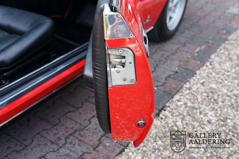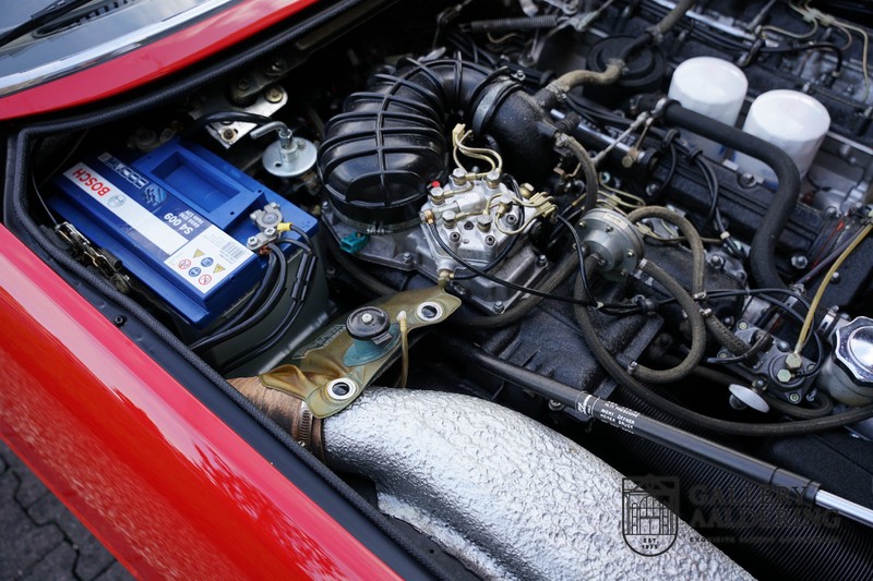 Dieser Ferrari wurde kurz nach dem Ankauf nach Pavesi gebracht , wo es dann umgebaut worden ist. Pavesi hat viel Autos umgebaut zum Cabriolet, aber der Ferrari hat ihm einen guten Ruf und einen hohen Bekanntheitsgrad gebracht. Das Auto befindet sich in einem sehr originalen Zustand, es hat ein Rosso Corsa Exterieur, ein schwarzes Interieur aus Leder mit einem schwarzen Verdeck. Aus optischen Gründen wurde der Ferrari schon mal überlackiert. Der Lack befindet sich noch in einem sehr guten Zustand und hat nur einige leichte Gebrauchsspuren. Die Karosserie ist noch original und hat korrekte Passungen. Das Verdeck schließt überall perfekt und befindet sich ebenfalls in einem guten Zustand. Selbstverständlich ist ein Tonneau Cover auch vorhanden.