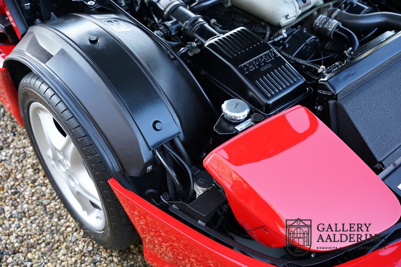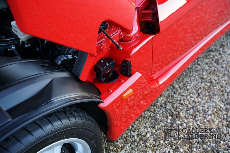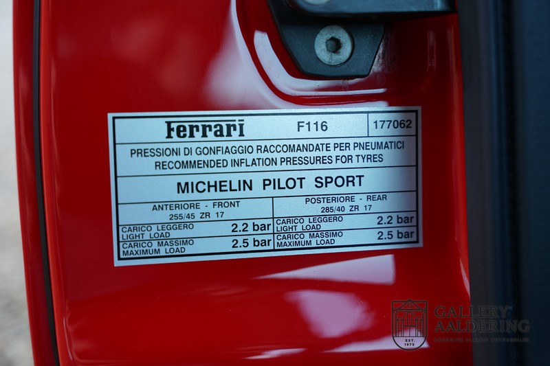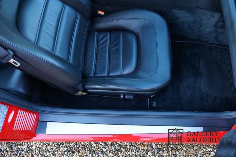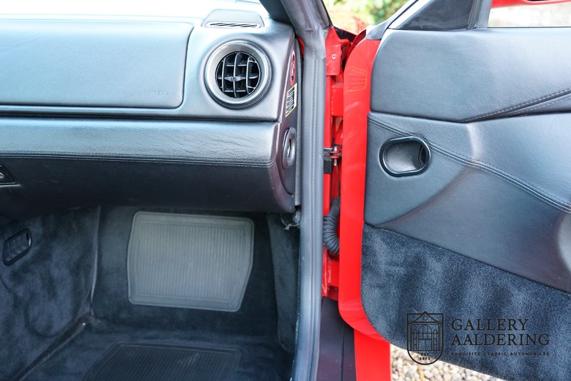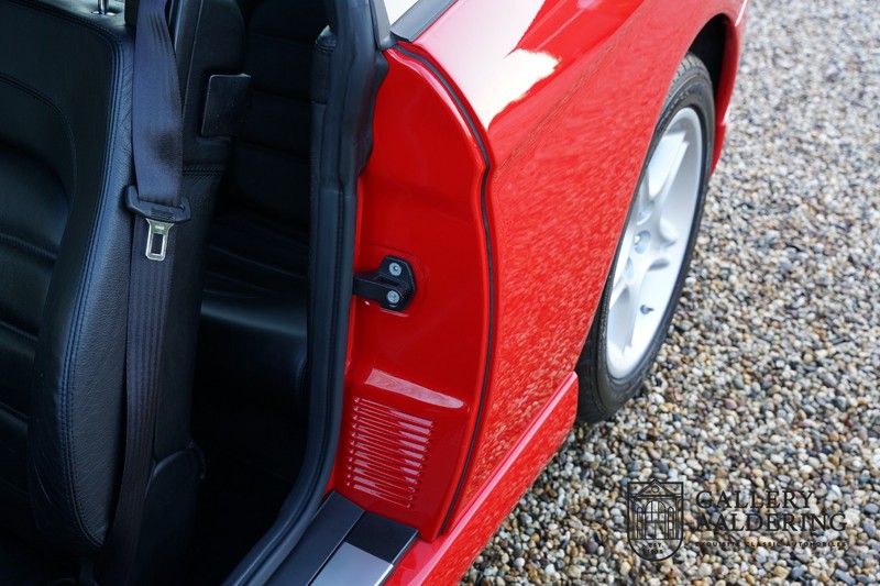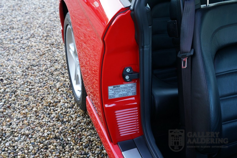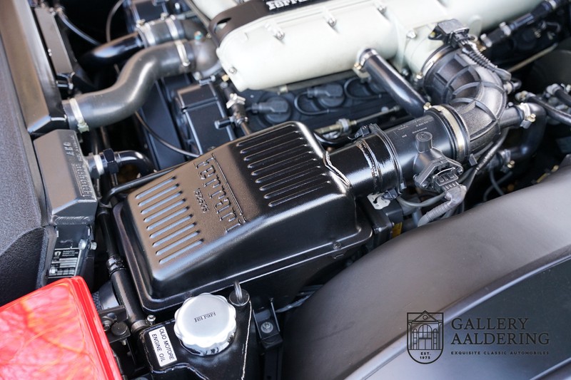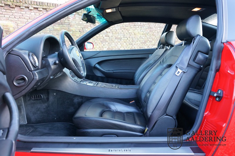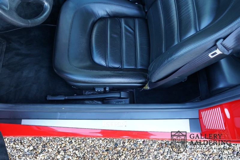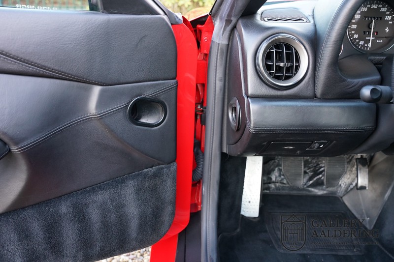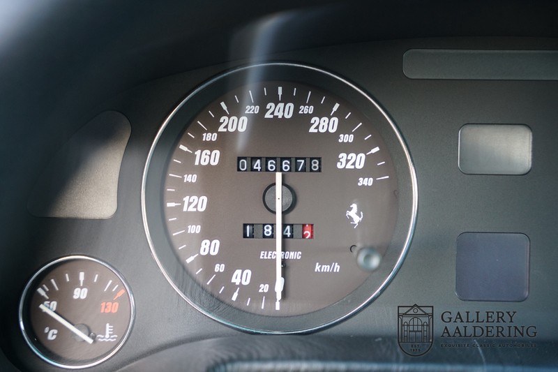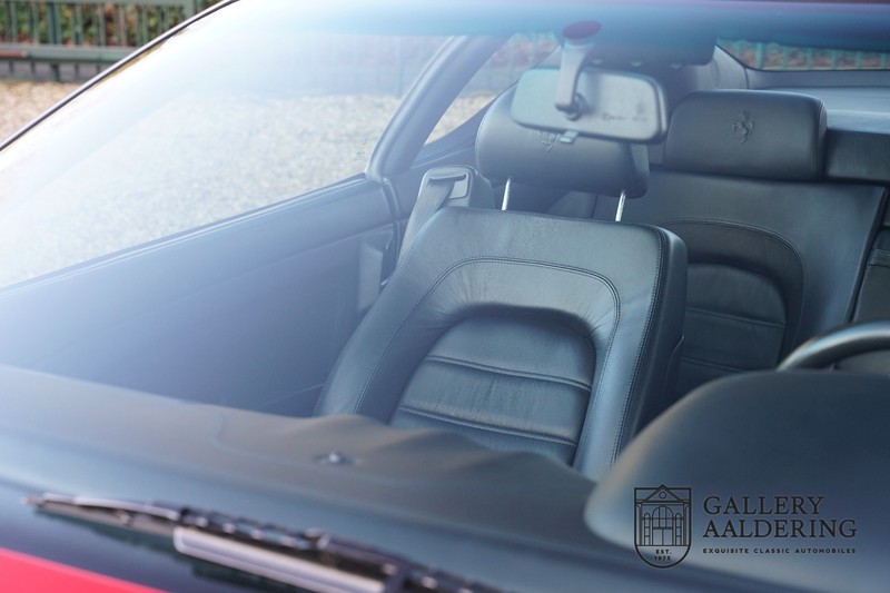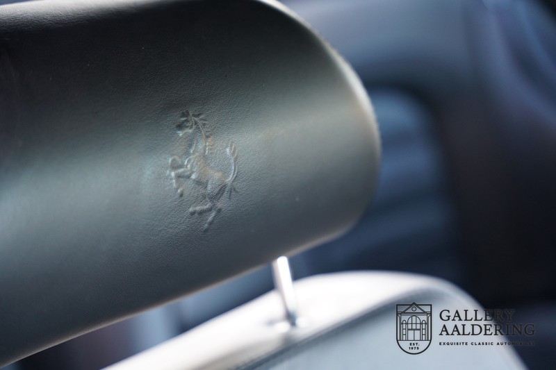 Das Interieur vom Ferrari sieht genauso schön aus. Der Erstbesitzer entschied sich für ein Interieur des mit schwarzem Leder und schwarzen Teppichen. Eine zeitlos schöne Kombination gegen das Äußere des Rosso Corsa. Das ikonische offene Schaltmuster und der Schaltknauf aus Metall fallen sofort ins Auge. Das Schalten wird natürlich von dem einzigartigen Ferrari-“Klick” begleitet. Wenn Sie schon mal einen Ferrari mit einem solchen Getriebe gefahren sind, wissen Sie, was wir meinen. Das Leder befindet sich in einem sehr guten Zustand und ist frei von Beschädigungen. Die Sitze sind bequem und bieten viel Halt. Die Rücksitzbank bietet Platz für das Mitnehmen von reichlich viel Gepäck oder zwei Personen. Die Instrumente und Bedienelemente sind alle ordentlich gepflegt worden und wieder wird deutlich, dass dieses Auto nicht nur teuer war, sondern auch die meiste Zeit seines Lebens in einer dunklen Garage verbracht hat, die sogenannte “Sticky Buttons“ findet man bei diesem Exemplar nicht!