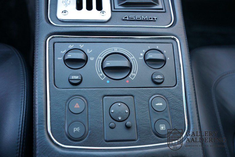 De binnenzijde van de Ferrari is al niet anders. De eerste eigenaar koos ervoor het binnenste van de 456 te laten voorzien van zwart leder en zwarte tapijten. Een tijdloos fraaie combinatie tegen het Rosso Corsa exterieur. Het iconische open schakelpatroon en de metalen pookknop springen direct in het oog. Schakelen gaat vanzelfsprekend gepaard met de unieke Ferrari “klik” als u ooit in een Ferrari heeft (mee)gereden met een dergelijke transmissie dan weet u wat wij bedoelen. Het leder verkeert in zeer goede staat en is vrij van beschadigingen. De stoelen zitten goed en bieden veel steun. De achterbank biedt plaats aan een zee van bagage of twee personenen. De instrumenten en bedieningselementen zijn alleen keurig verzorgd en ook hier wordt weer duidelijk dat deze auto niet alleen gekosterd is maar ook de grootste tijd van haar leven in een donkere garage heeft doorgebracht, u zult in dit exemplaar geen sticky buttons aantreffen!