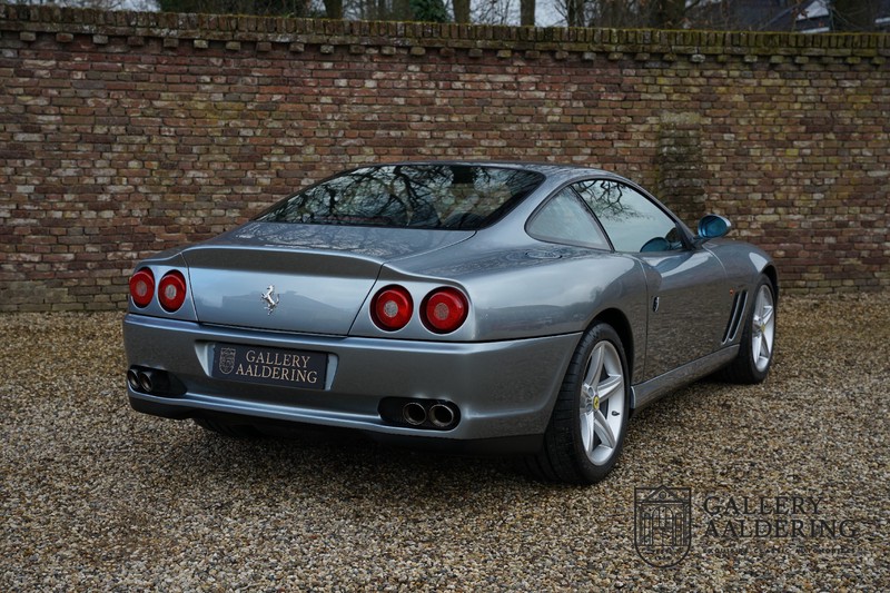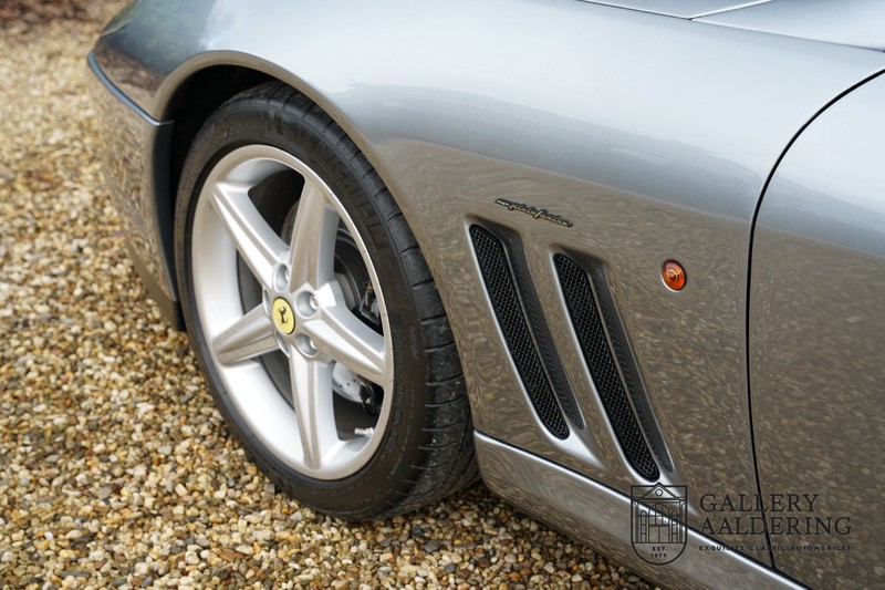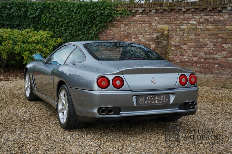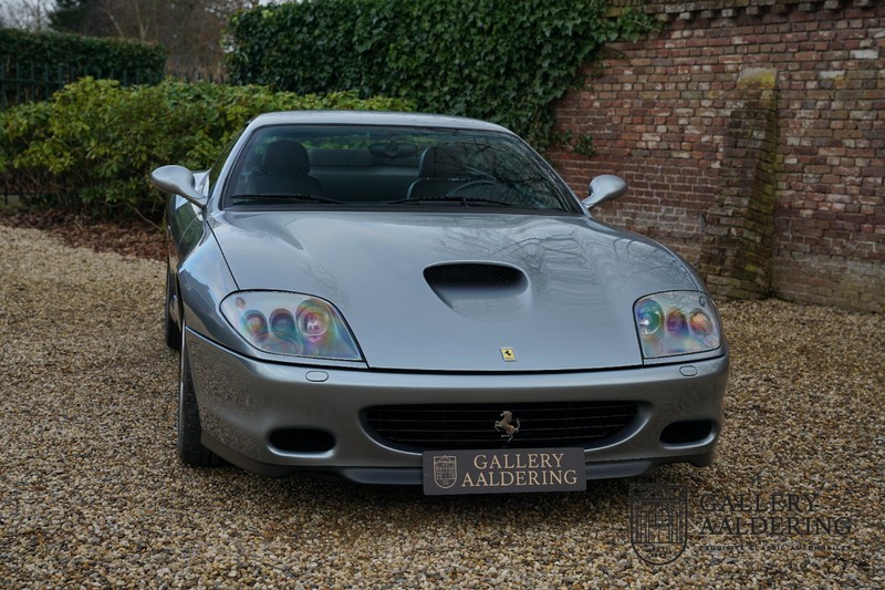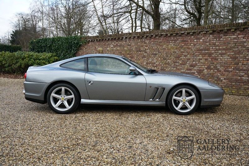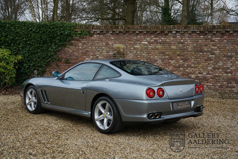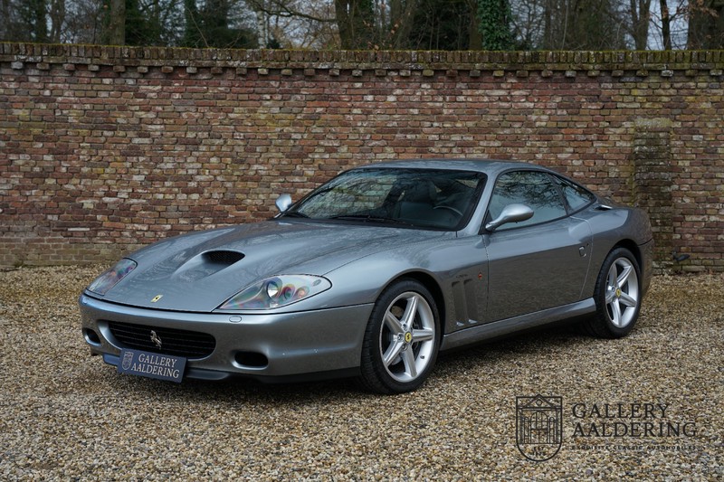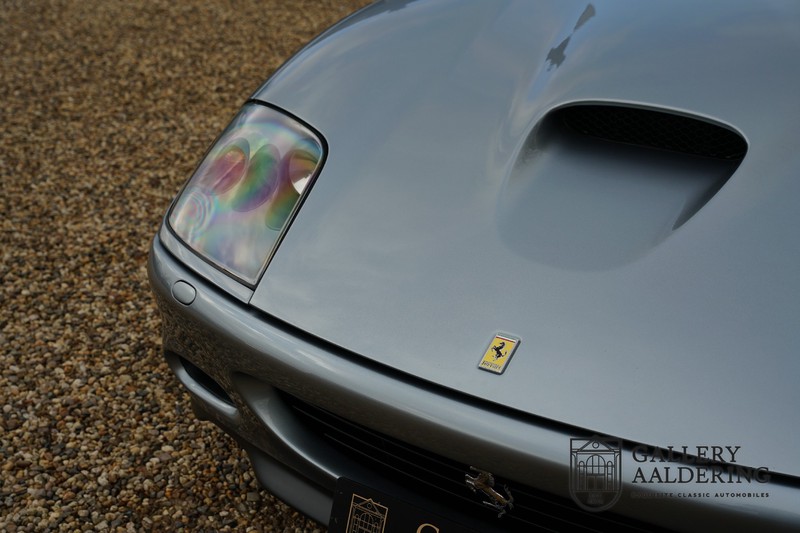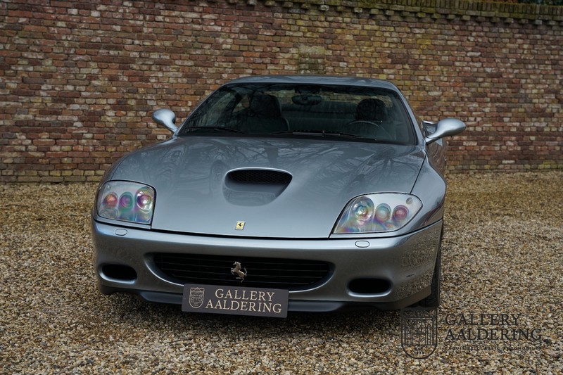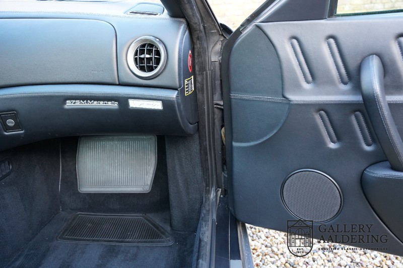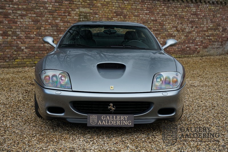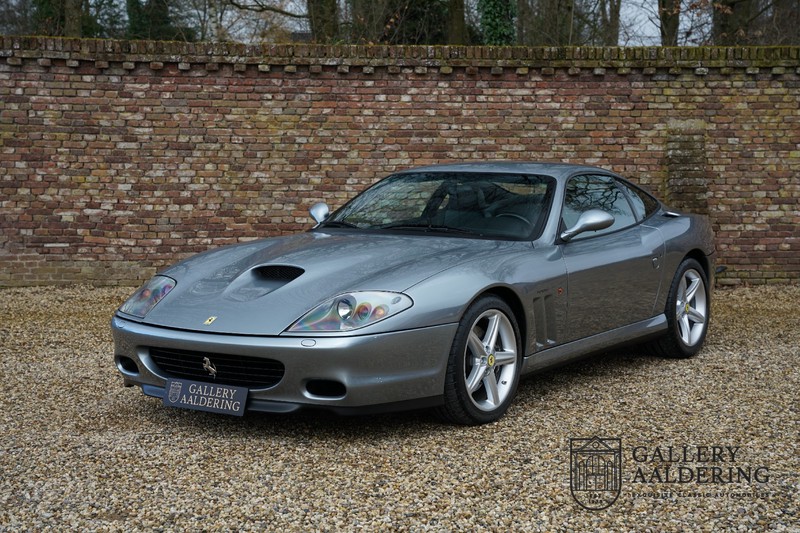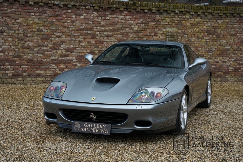 Wat moet het een bijzondere dag zijn geweest toen de eerste en tevens enige eigenaar van deze Ferrari 575 Maranello zijn nieuwe aanwinst op kon halen bij Ferrari Munsterhuis in Hengelo. De auto was maanden daarvoor zorgvuldig samengesteld en is tijdloos fraai uitgevoerd. De buitenzijde is uitgevoerd in “Grigio Titano” en de binnenzijde is uitgevoerd in “Nero” met die fantastisch zittende Daytona stoelen. Objectief beschouwd zou alleen de kleurcombinatie al reden zijn om deze auto te willen kopen. Het simpele feit dat dit exemplaar is uitgevoerd met de uiterst zeldzame handgeschakelde transmissie maakt de auto alleen maar begeerlijker. De auto kreeg tevens een Tubi uitlaat om de klanken die de V12 produceert extra te versterken, voor Ferrari-liefhebbers is het geluid van een V12 met Tubi uitlaat voeding voor de ziel. De Ferrari 575M was een doorontwikkeling van de uiterst succesvolle Ferrari 550 en was op alle punten net even wat meer verfijnd. Zo heeft de 575 de beschikking grotere remmen, een krachtiger motor, verbeterde aerodynamica en een fraaier interieur. Het allergrootste verschil met de 550 was echter wel dat de Ferrari 575M met een F1-transmissie kon worden besteld, de Ferrari verkoper van dienst verkocht het destijds als: precies zoals Schumacher rijdt, met flippers aan het stuur. De bak was razendsnel in het inleggen van de versnellingen maar minder snel in het koppelen, de rijervaring was dus vaak vrij schokkerig en lastig te doseren. Dat merkte ook de eerste eigenaar van dit exemplaar tijdens een proefrit en hij deed wat slechts 242 mensen zouden doen: het vinkje zetten voor de handgeschakelde transmissie.