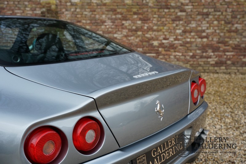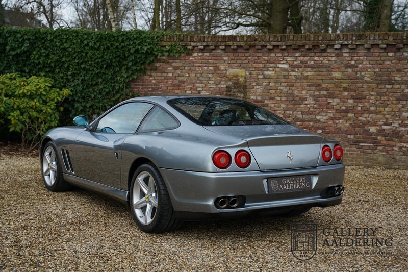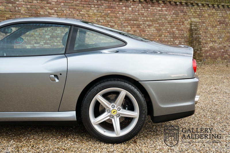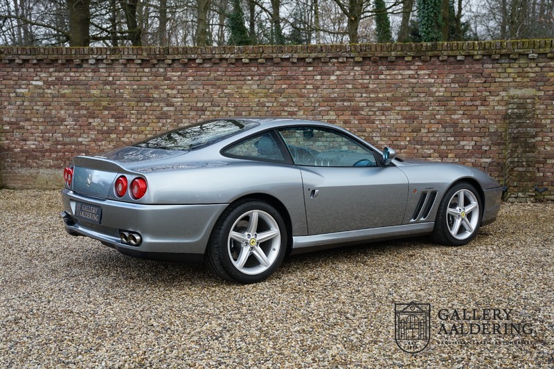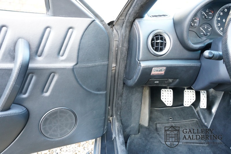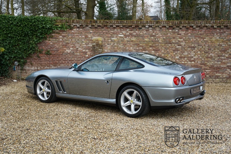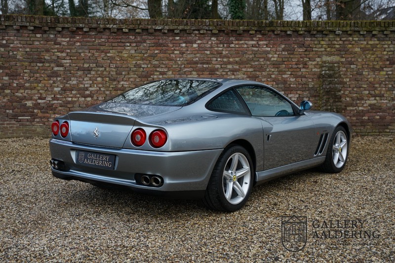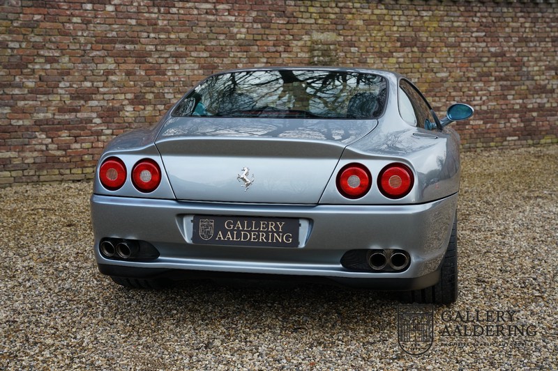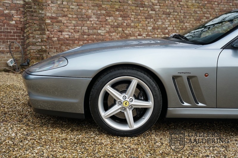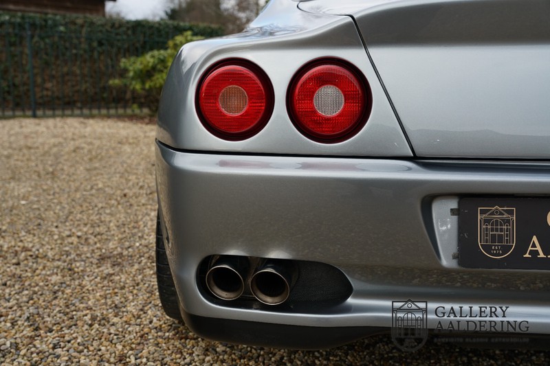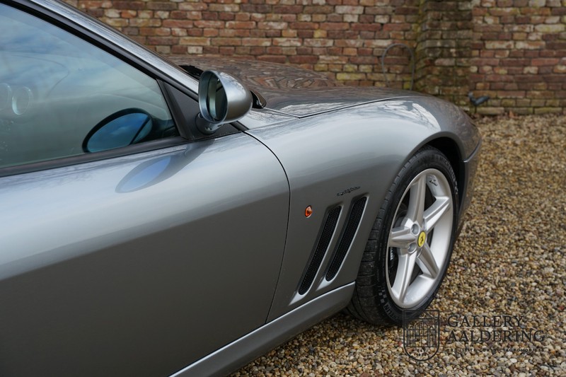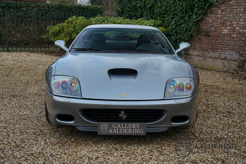 Wat moet het een bijzondere dag zijn geweest toen de eerste en tevens enige eigenaar van deze Ferrari 575 Maranello zijn nieuwe aanwinst op kon halen bij Ferrari Munsterhuis in Hengelo. De auto was maanden daarvoor zorgvuldig samengesteld en is tijdloos fraai uitgevoerd. De buitenzijde is uitgevoerd in “Grigio Titano” en de binnenzijde is uitgevoerd in “Nero” met die fantastisch zittende Daytona stoelen. Objectief beschouwd zou alleen de kleurcombinatie al reden zijn om deze auto te willen kopen. Het simpele feit dat dit exemplaar is uitgevoerd met de uiterst zeldzame handgeschakelde transmissie maakt de auto alleen maar begeerlijker. De auto kreeg tevens een Tubi uitlaat om de klanken die de V12 produceert extra te versterken, voor Ferrari-liefhebbers is het geluid van een V12 met Tubi uitlaat voeding voor de ziel. De Ferrari 575M was een doorontwikkeling van de uiterst succesvolle Ferrari 550 en was op alle punten net even wat meer verfijnd. Zo heeft de 575 de beschikking grotere remmen, een krachtiger motor, verbeterde aerodynamica en een fraaier interieur. Het allergrootste verschil met de 550 was echter wel dat de Ferrari 575M met een F1-transmissie kon worden besteld, de Ferrari verkoper van dienst verkocht het destijds als: precies zoals Schumacher rijdt, met flippers aan het stuur. De bak was razendsnel in het inleggen van de versnellingen maar minder snel in het koppelen, de rijervaring was dus vaak vrij schokkerig en lastig te doseren. Dat merkte ook de eerste eigenaar van dit exemplaar tijdens een proefrit en hij deed wat slechts 242 mensen zouden doen: het vinkje zetten voor de handgeschakelde transmissie.