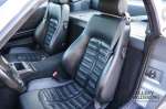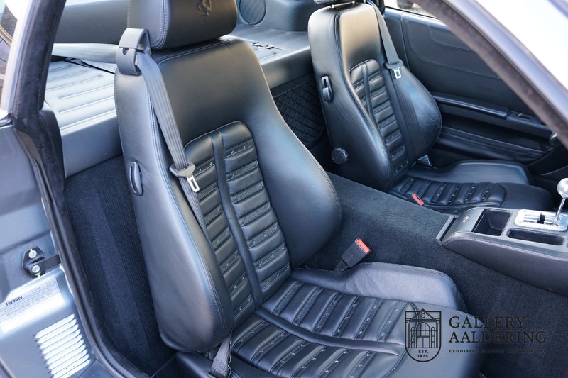 Das Interieur vom Ferrari wurde tipptopp gepflegt, die Teppiche sind natürlich original und in sehr gutem Zustand. Dem Auto ist es anzusehen, dass es die meiste Zeit ihres Lebens in einer beheizten Garage verbracht hat. Das Leder der Sitze wurde gut gepflegt ist noch wunderbar geschmeidig. Auch ist das Auto völlig frei von Knöpfen und Tasten die kleben, die sogenannte “Sticky Buttons“. Das Leder am Lenkrad ist schön, der Schalthebel sieht gut aus und auch der Dachhimmel befindet sich in einem sehr schönen Zustand. Das Armaturenbrett ist natürlich auch komplett mit Leder überzogen und befindet sich ebenfalls in einem top gepflegten Zustand.