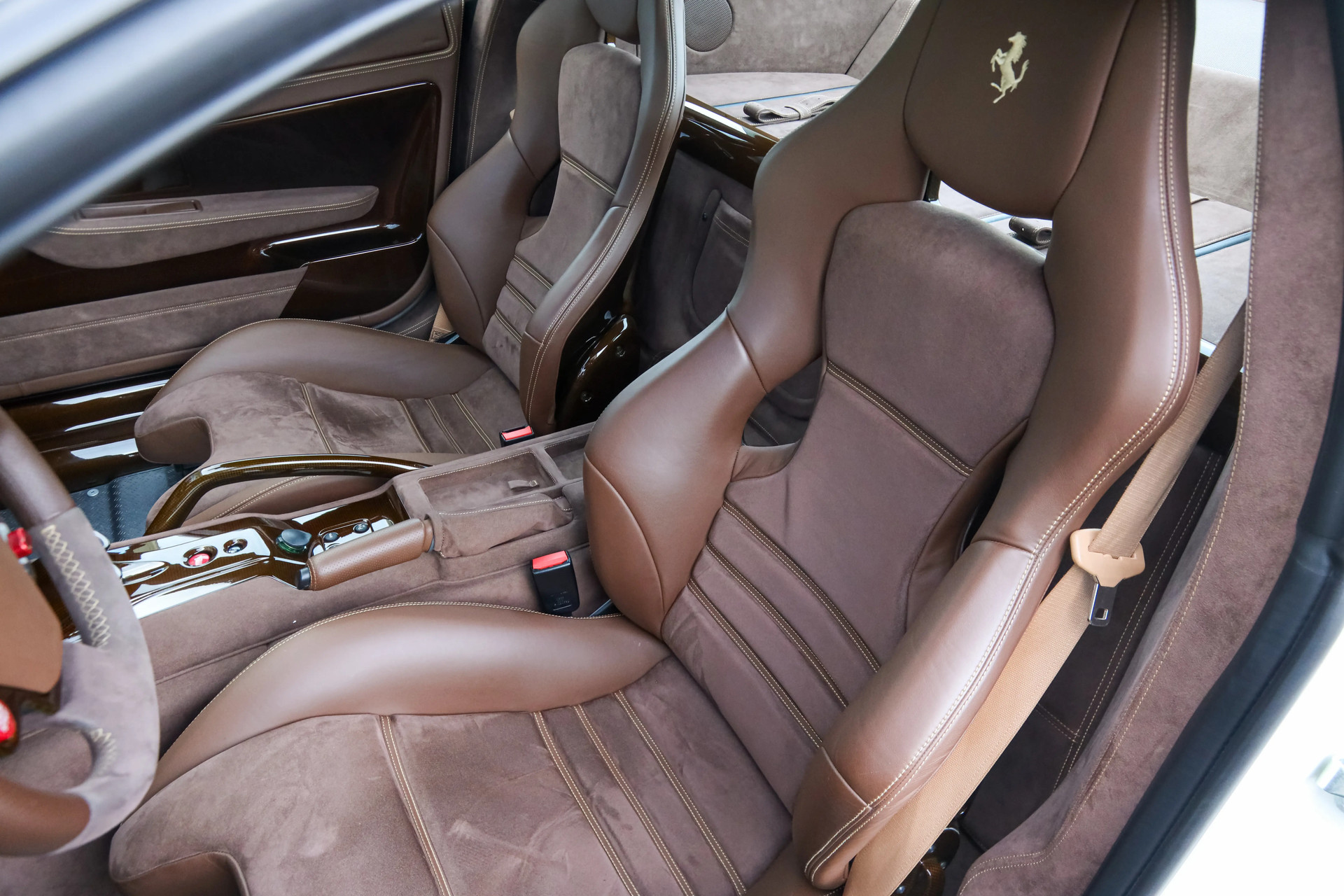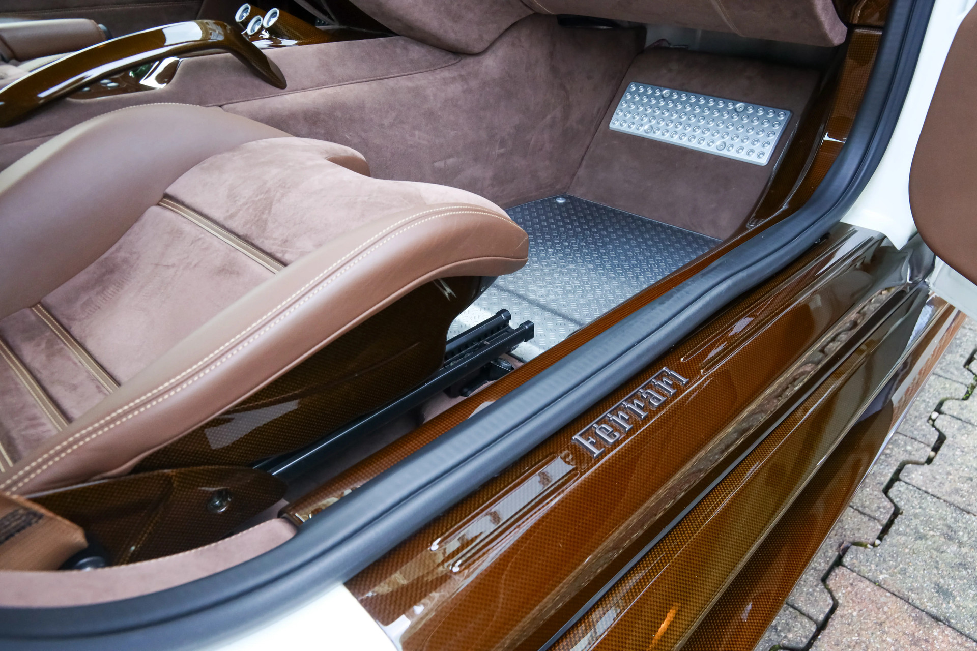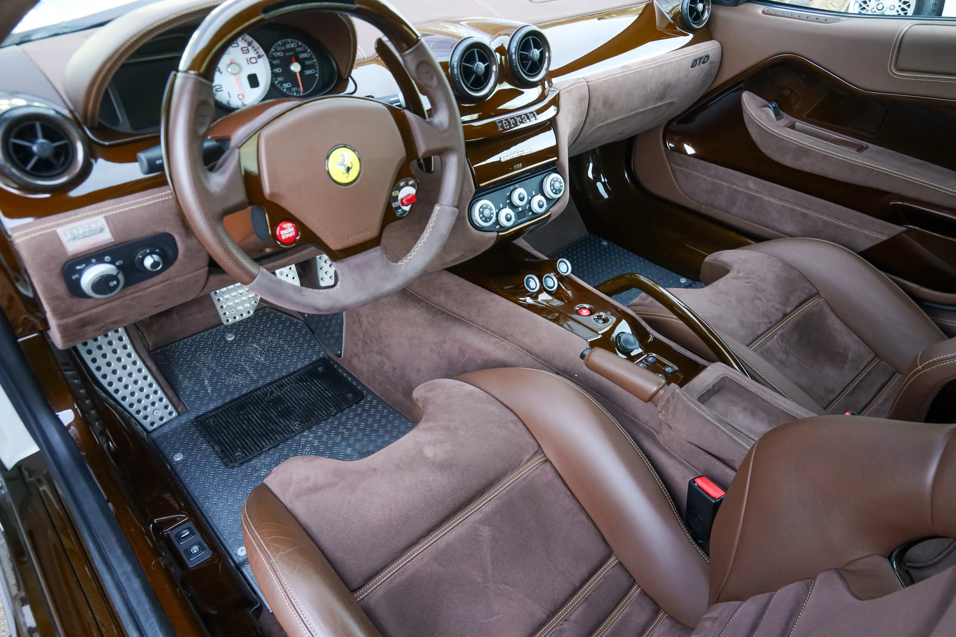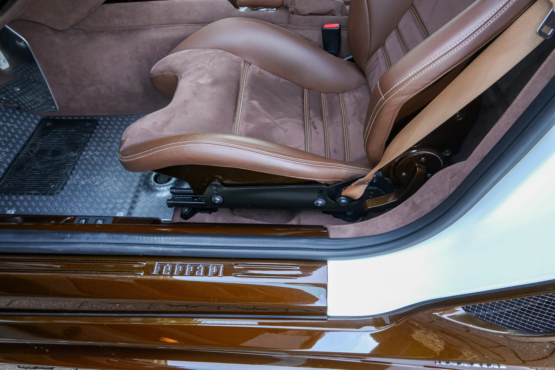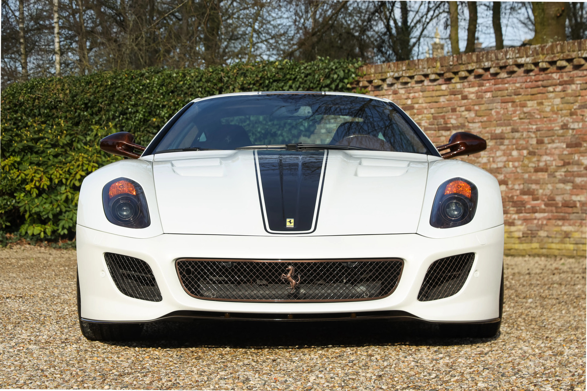 For this Ferrari a unique and tasteful specification was chosen. The body is finished in Bianco Perla Fuji Opaco with satin brown racing stripes. In addition several details are executed in brown carbon fiber, giving this 599 GTO a truly striking and elegant appearance.