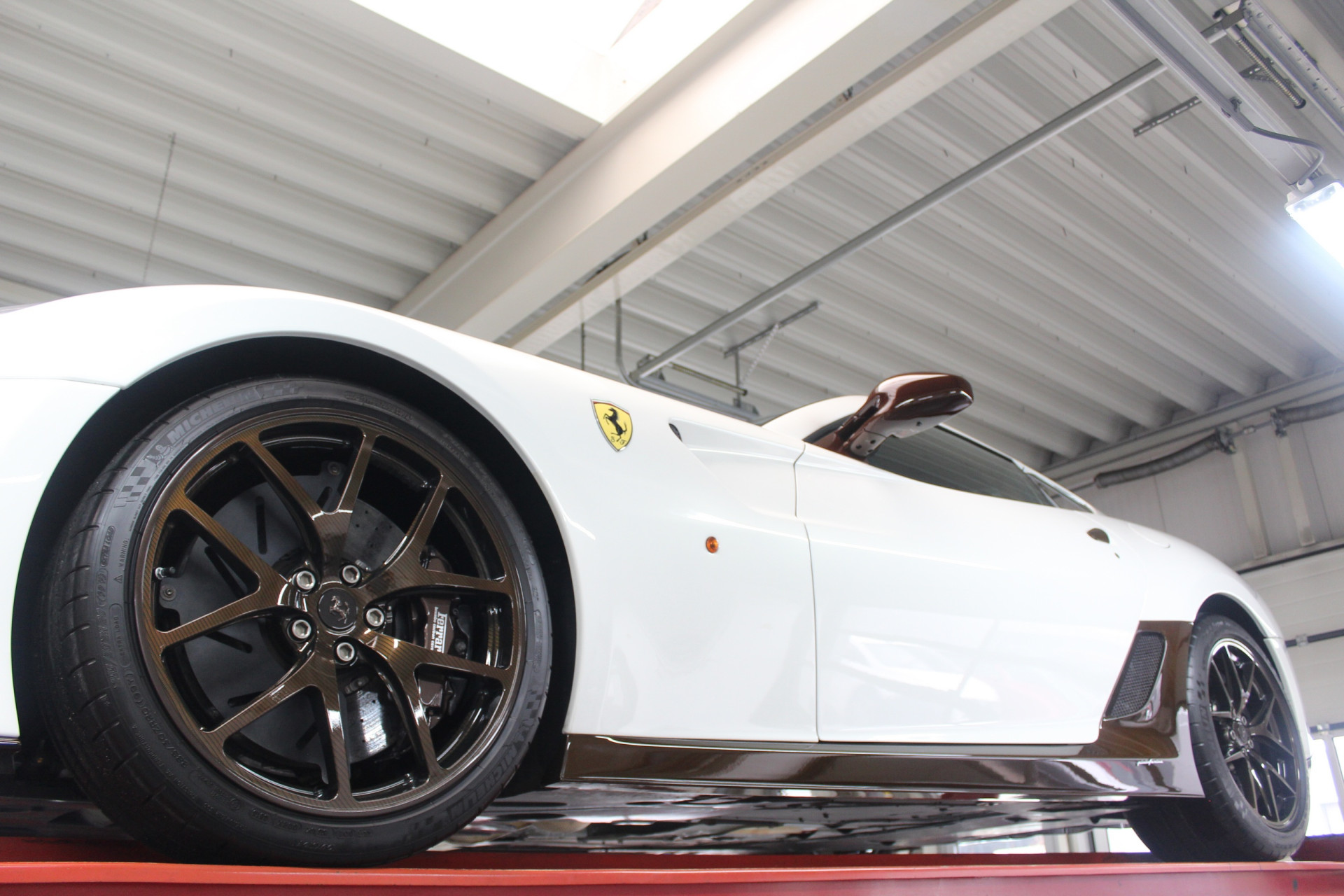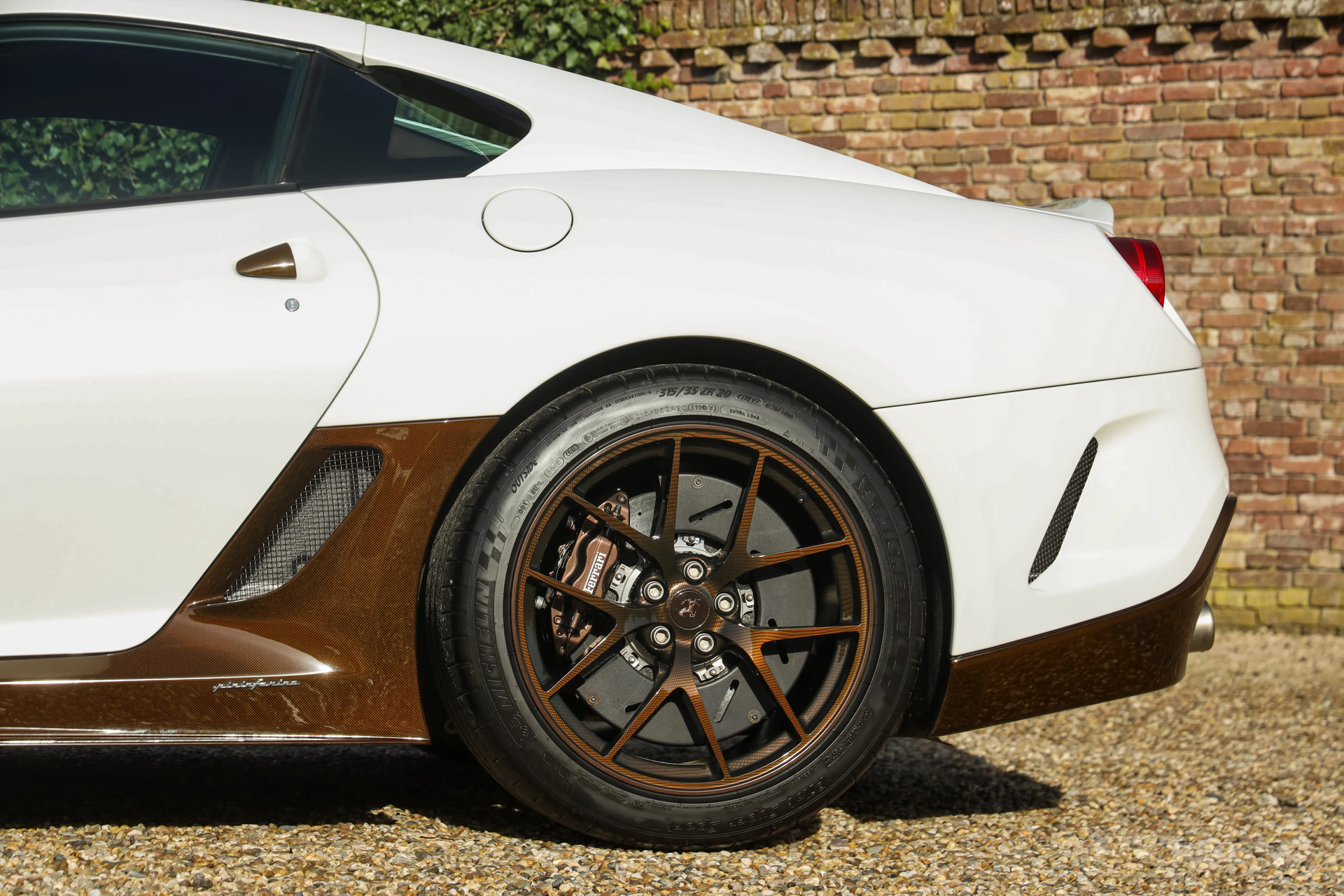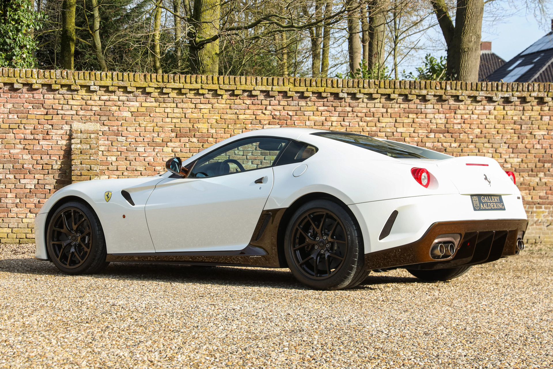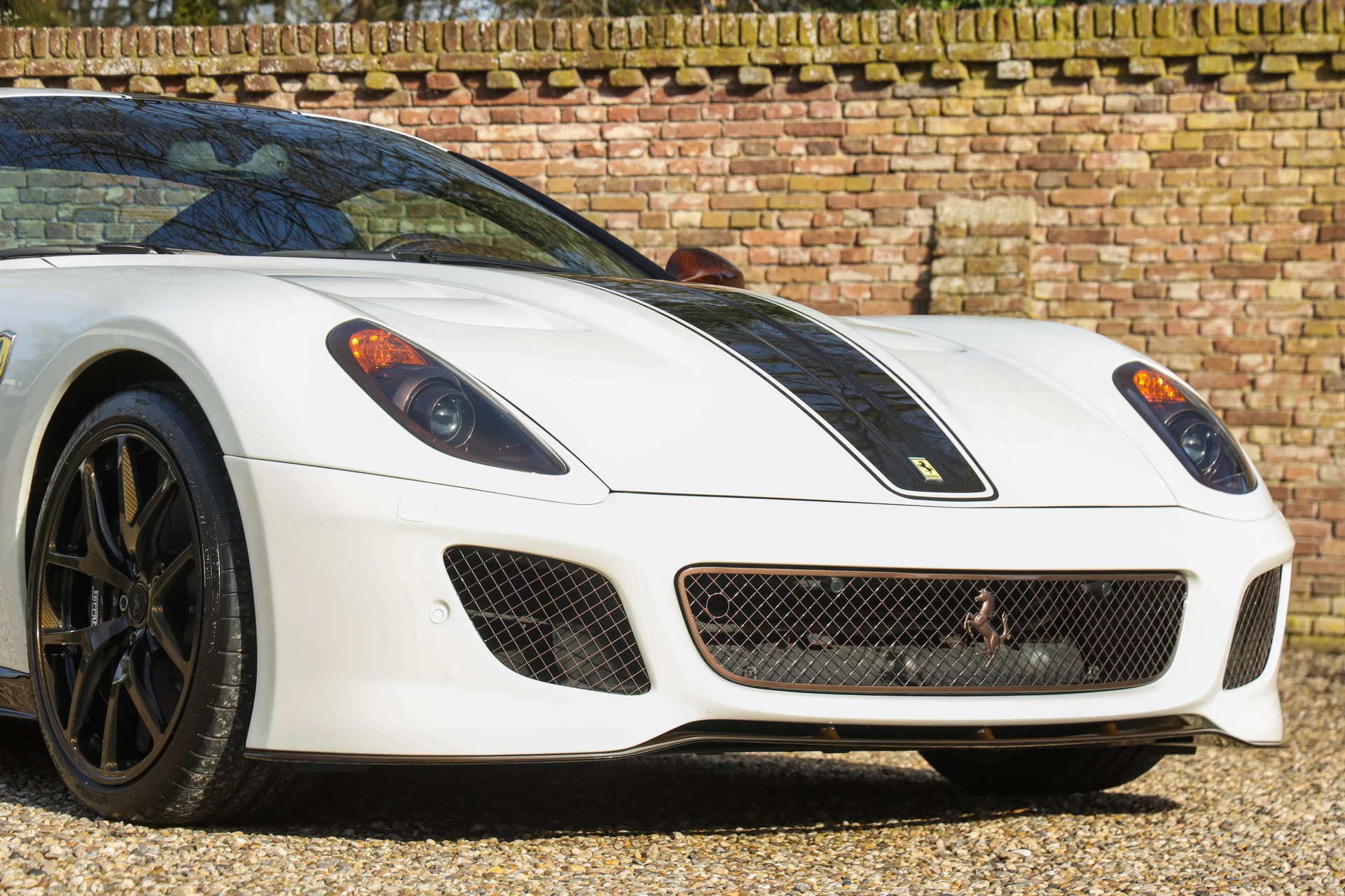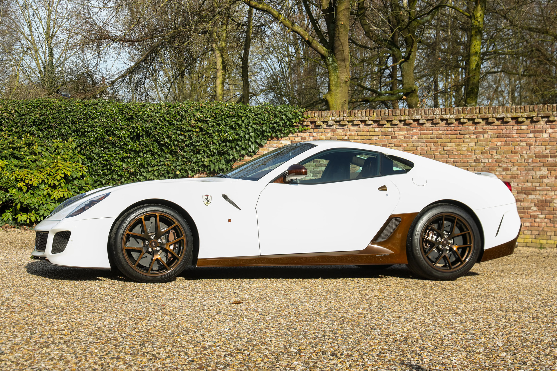 Voor deze Ferrari werd gekozen voor een unieke en smaakvolle uitvoering. De carrosserie is uitgevoerd in Bianco Perla (Fuji Opaco) met satijnbruine racing stripes. Daarnaast zijn diverse details uitgevoerd in bruin carbon-fiber, wat deze 599 GTO een waanzinnig mooie uitstraling geeft.