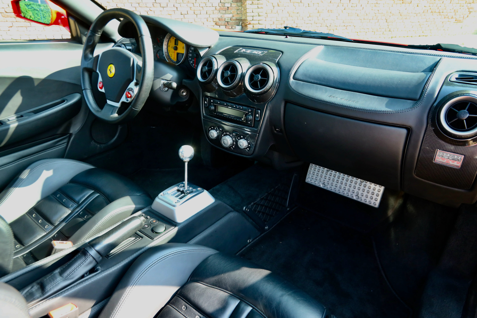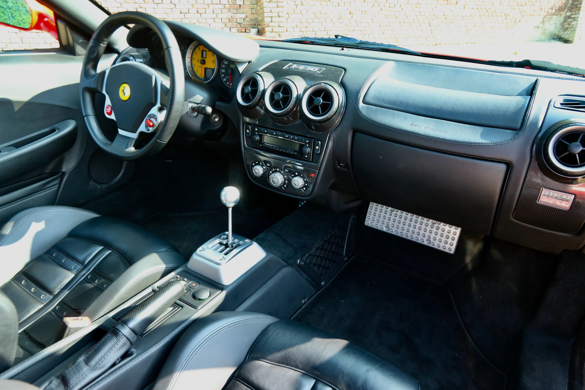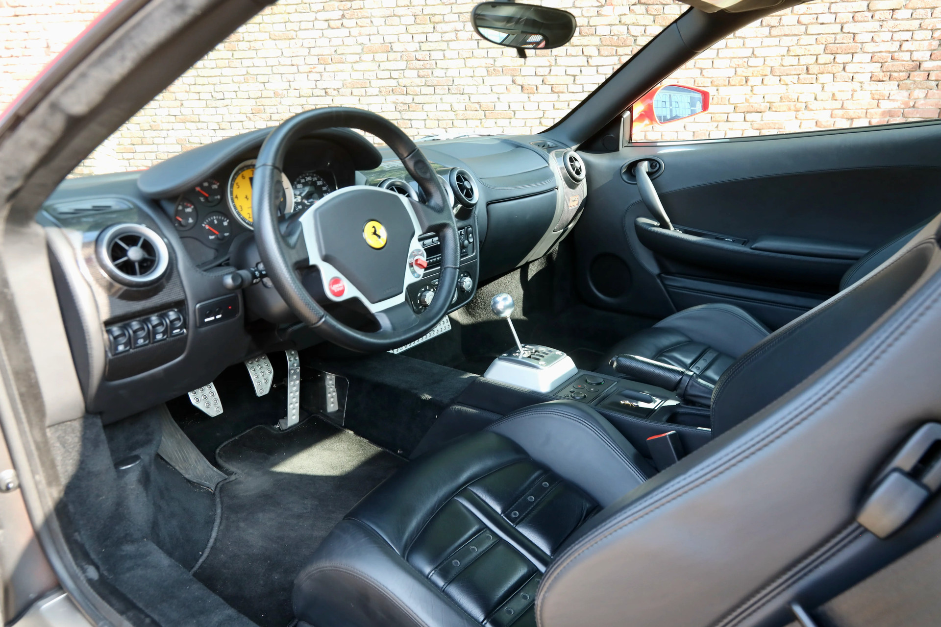 Avec seulement 36 000 kilomètres, cette F430 se présente dans un état que l’on peut qualifier sans exagération de quasi neuf. La peinture brille d’un éclat profond, les coutures des selleries sont impeccables et chaque matériau semble à peine avoir été touché. Les éléments en caoutchouc, les vitrages et les jantes sont irréprochables. Dès que l’on prend place à bord, on perçoit immédiatement la fraîcheur et la préservation de l’habitacle.